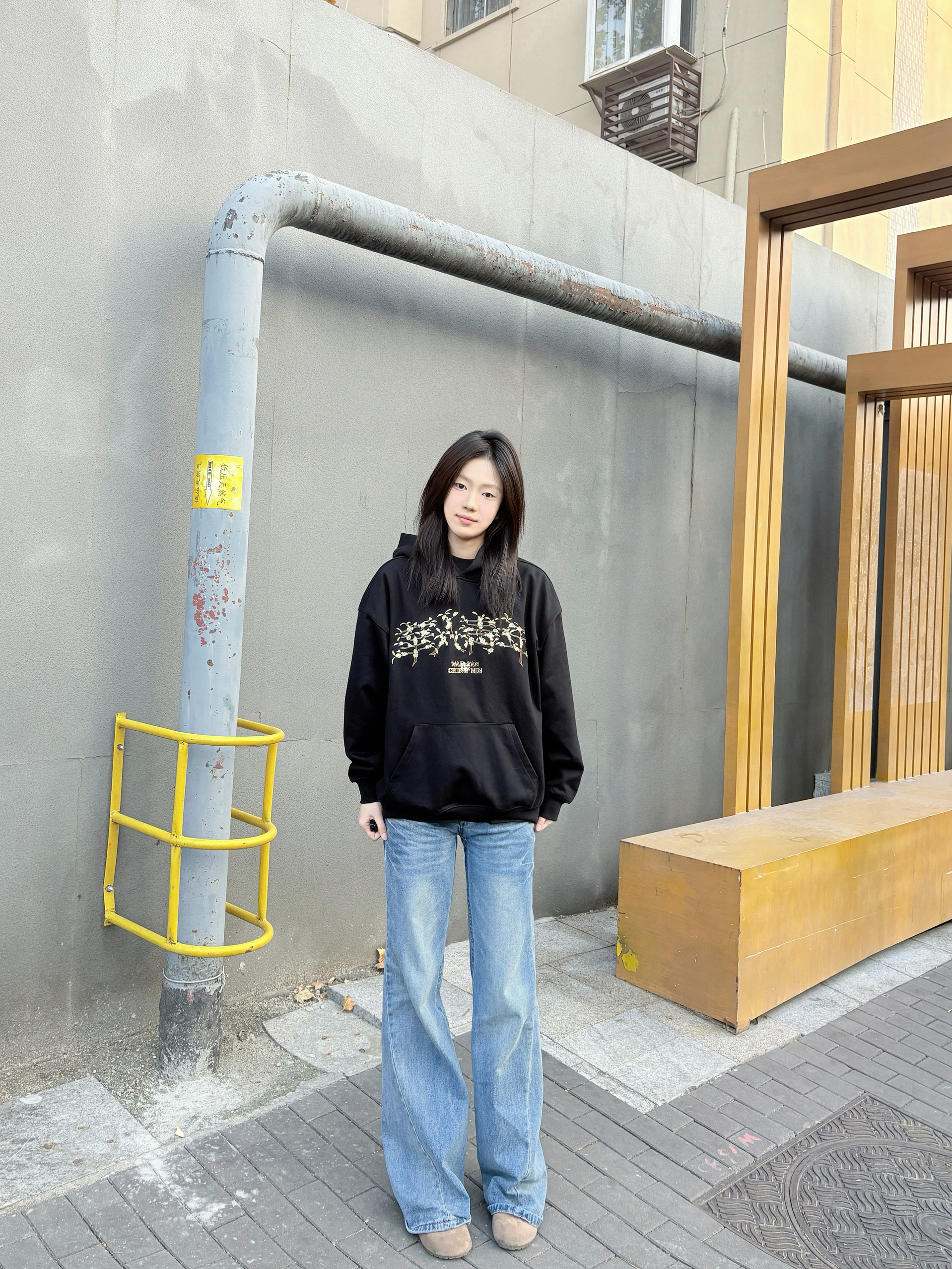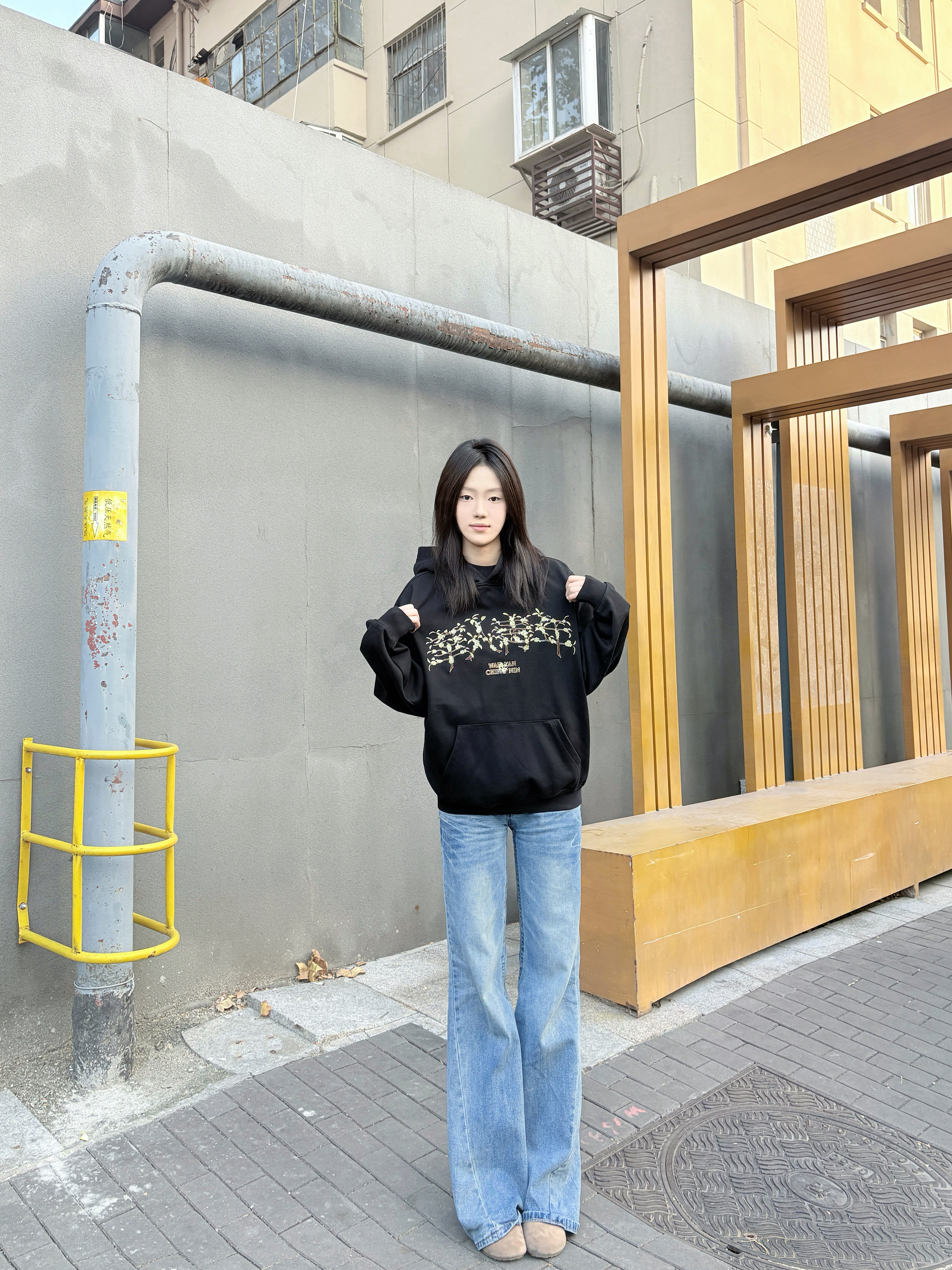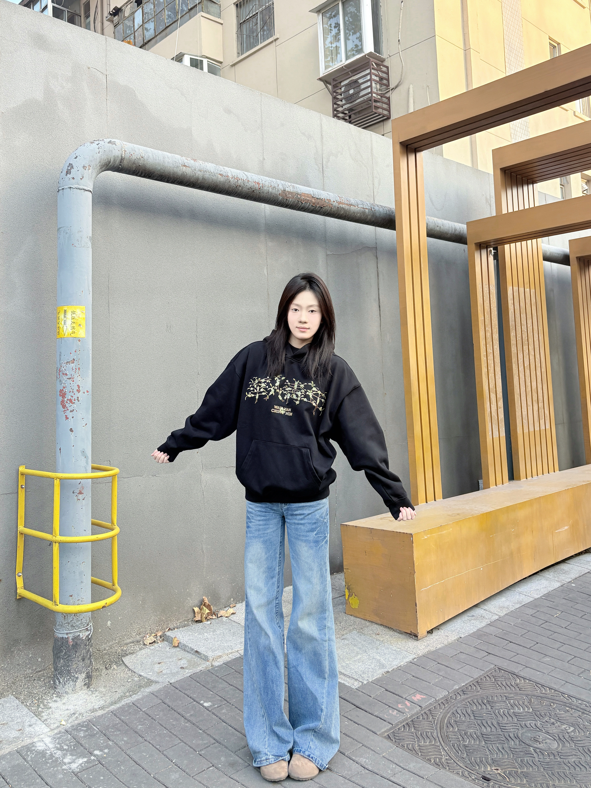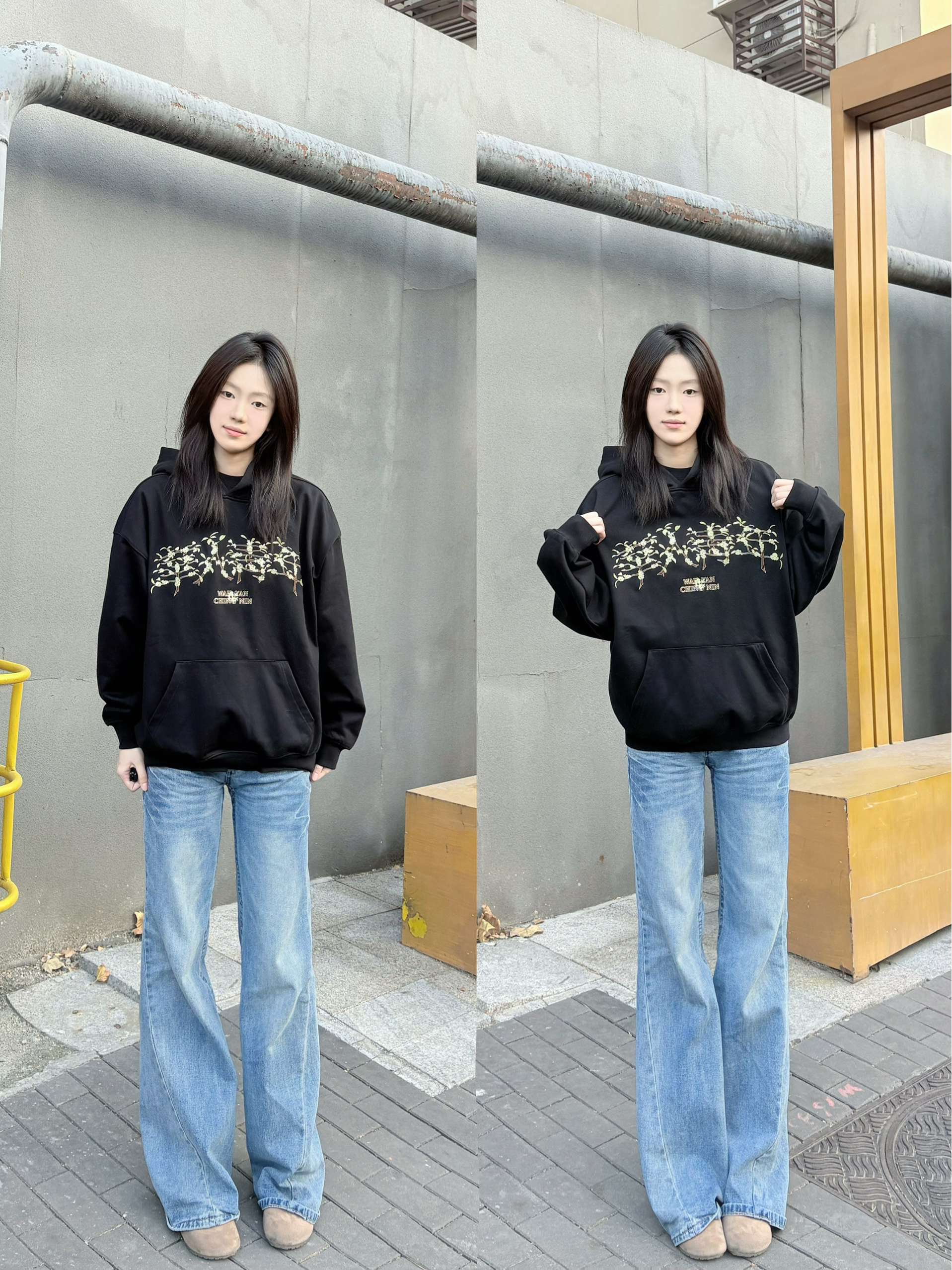 这件黑色连帽卫衣是不用犹豫的穿搭选择,宽松版型,套厚内搭也不挤,肩线利落不塌肩,穿上自带松弛感。 胸前印花是低调细节款,和黑色底色适配度很高,不会显杂乱;面料软而有型,洗后没起球,大口袋装随身物刚好够用。 配阔腿牛仔裤不用费心思搭,休闲感直接拉满,通勤、逛街穿都舒服又耐看。
