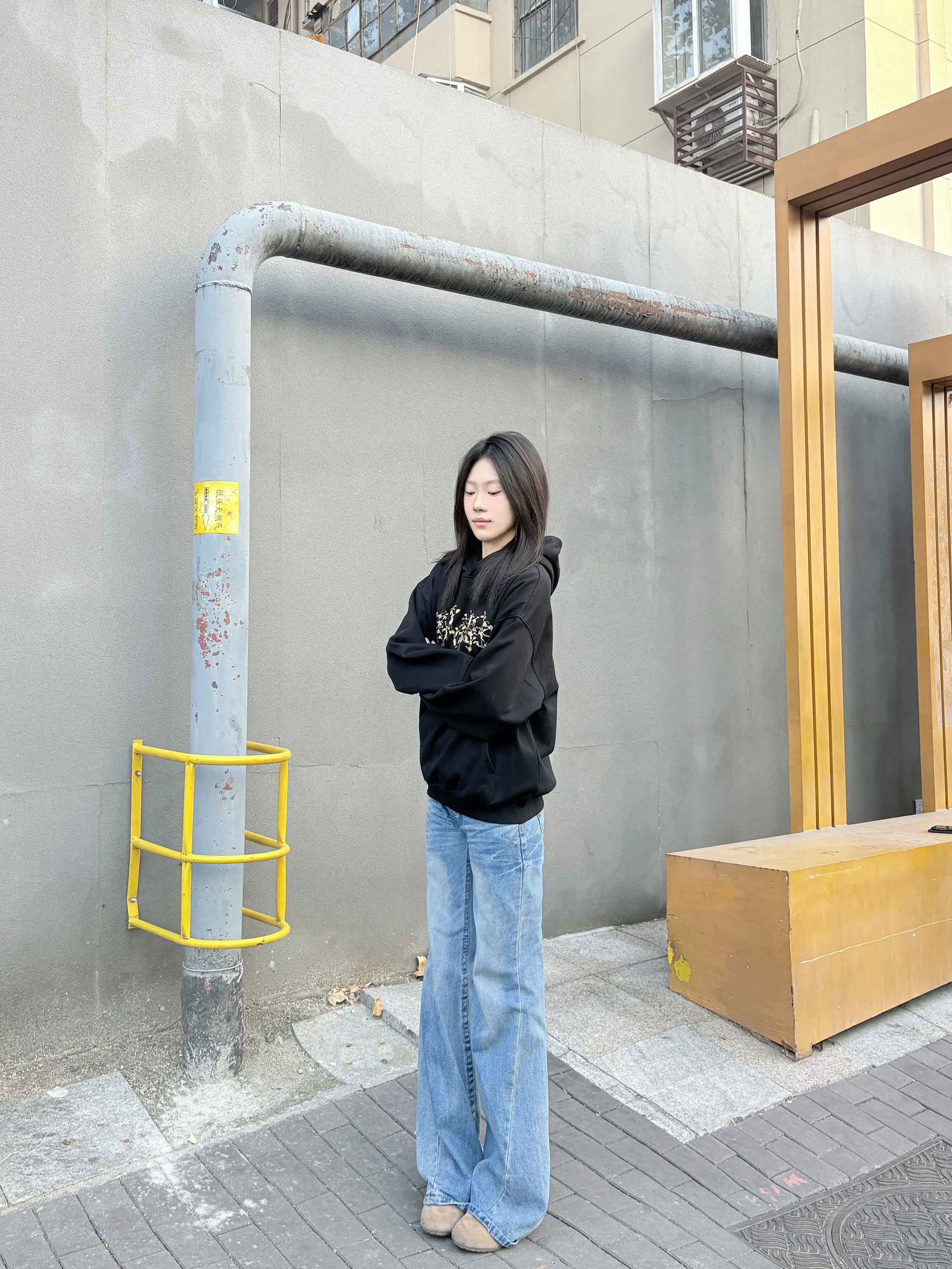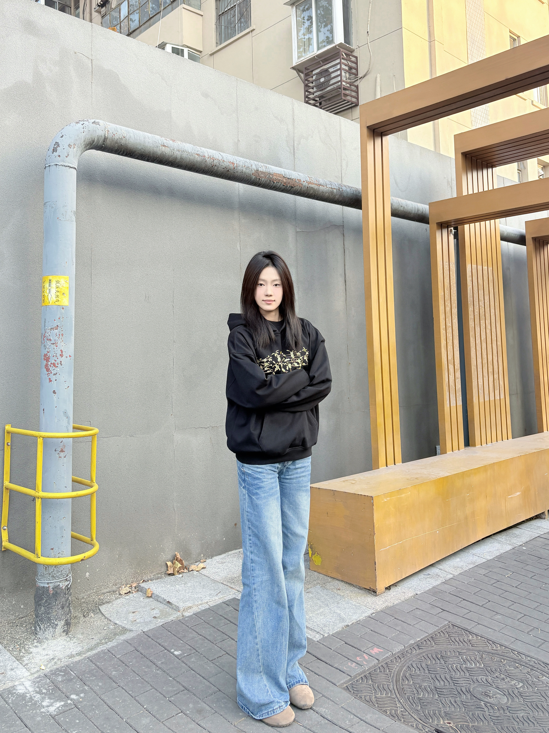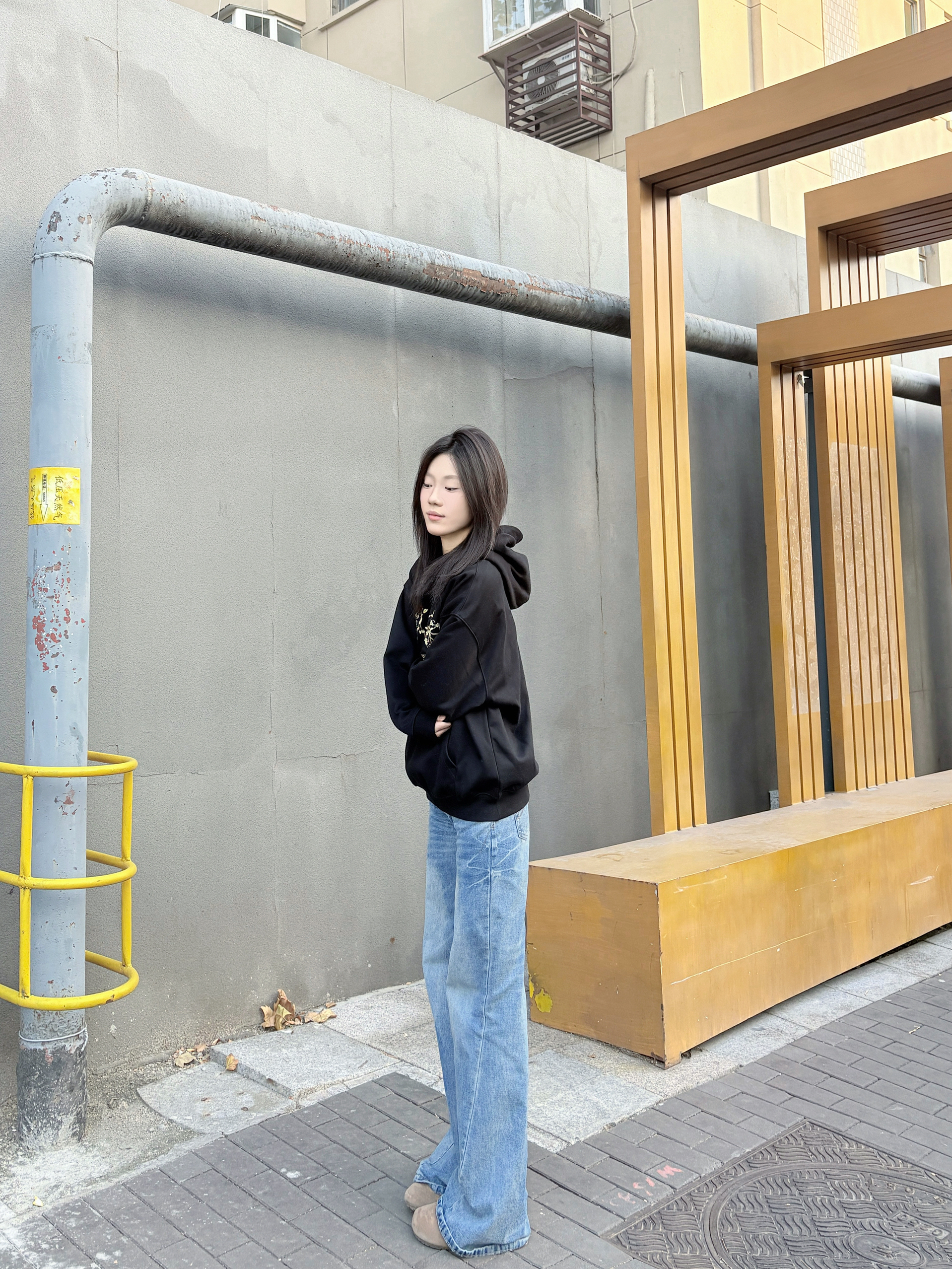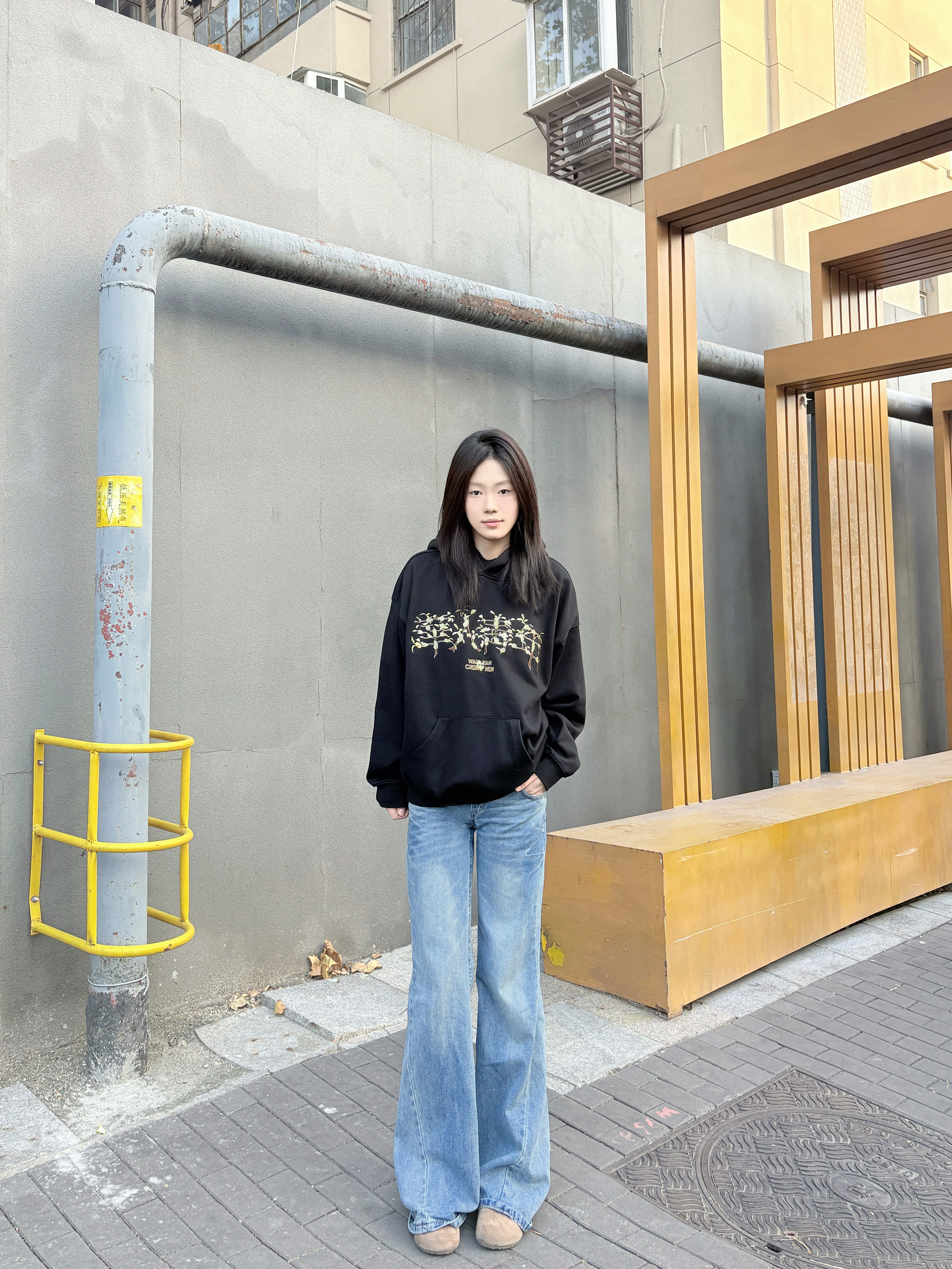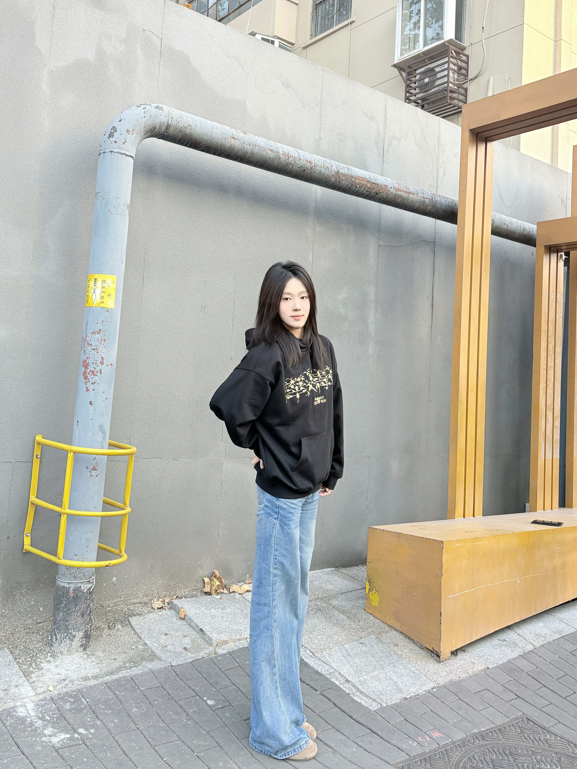 这件黑色连帽卫衣是不用犹豫的穿搭选择,宽松版型,套厚内搭也不挤,肩线利落不塌肩,穿上自带松弛感。 胸前印花是低调细节款,和黑色底色适配度很高,不会显杂乱;面料软而有型,洗后没起球,大口袋装随身物刚好够用。 配阔腿牛仔裤不用费心思搭,休闲感直接拉满,通勤、逛街穿都舒服又耐看。