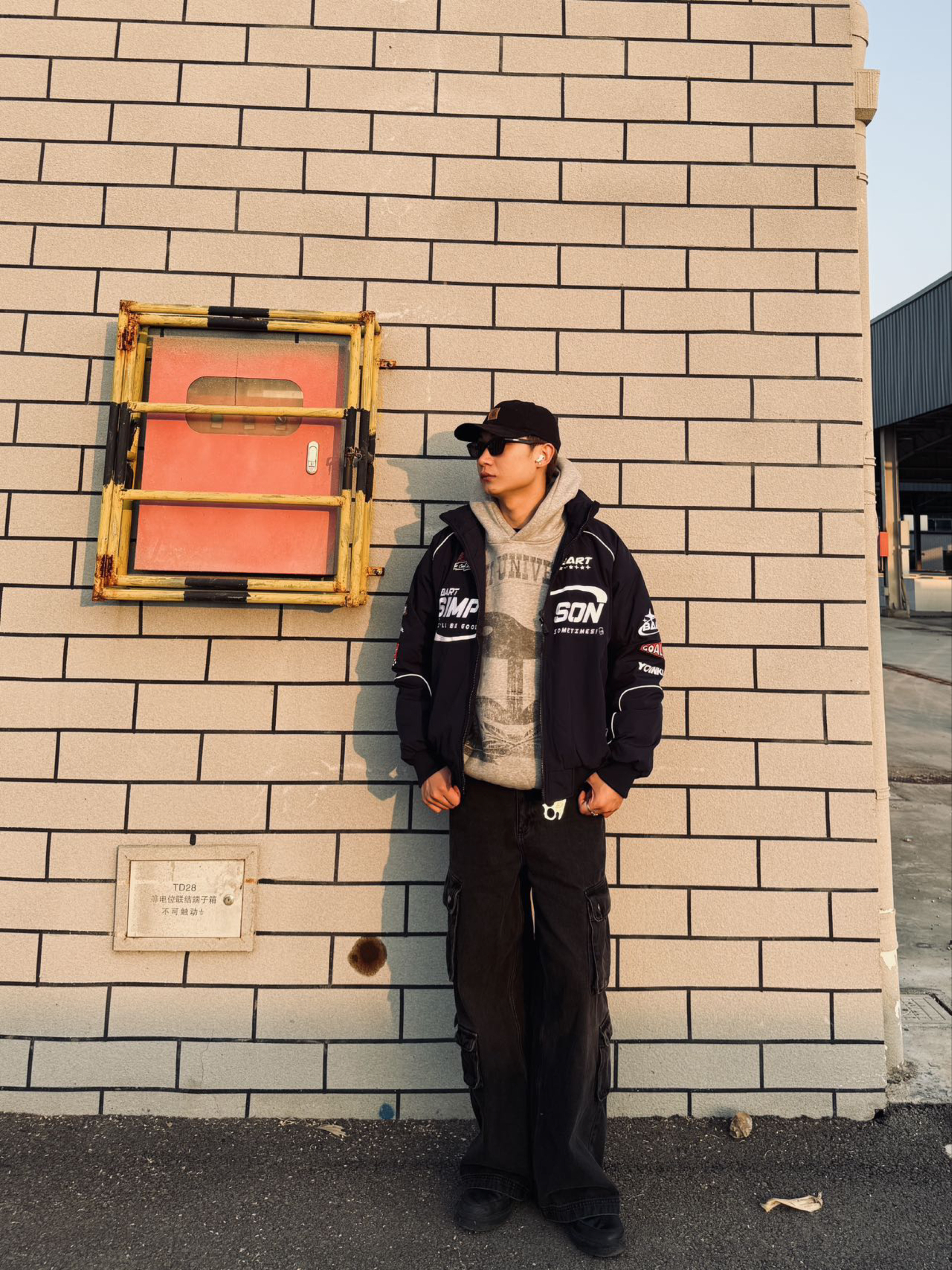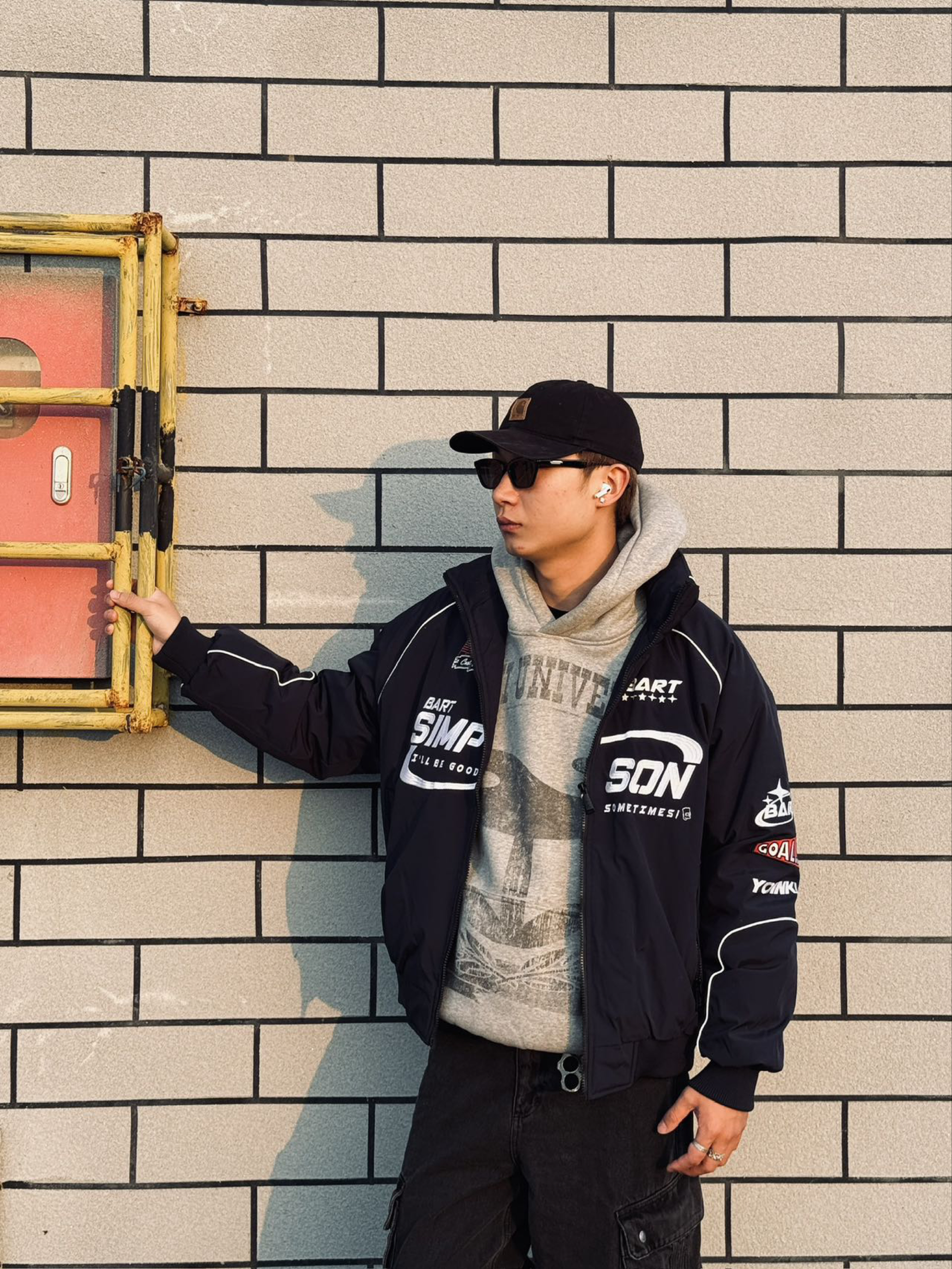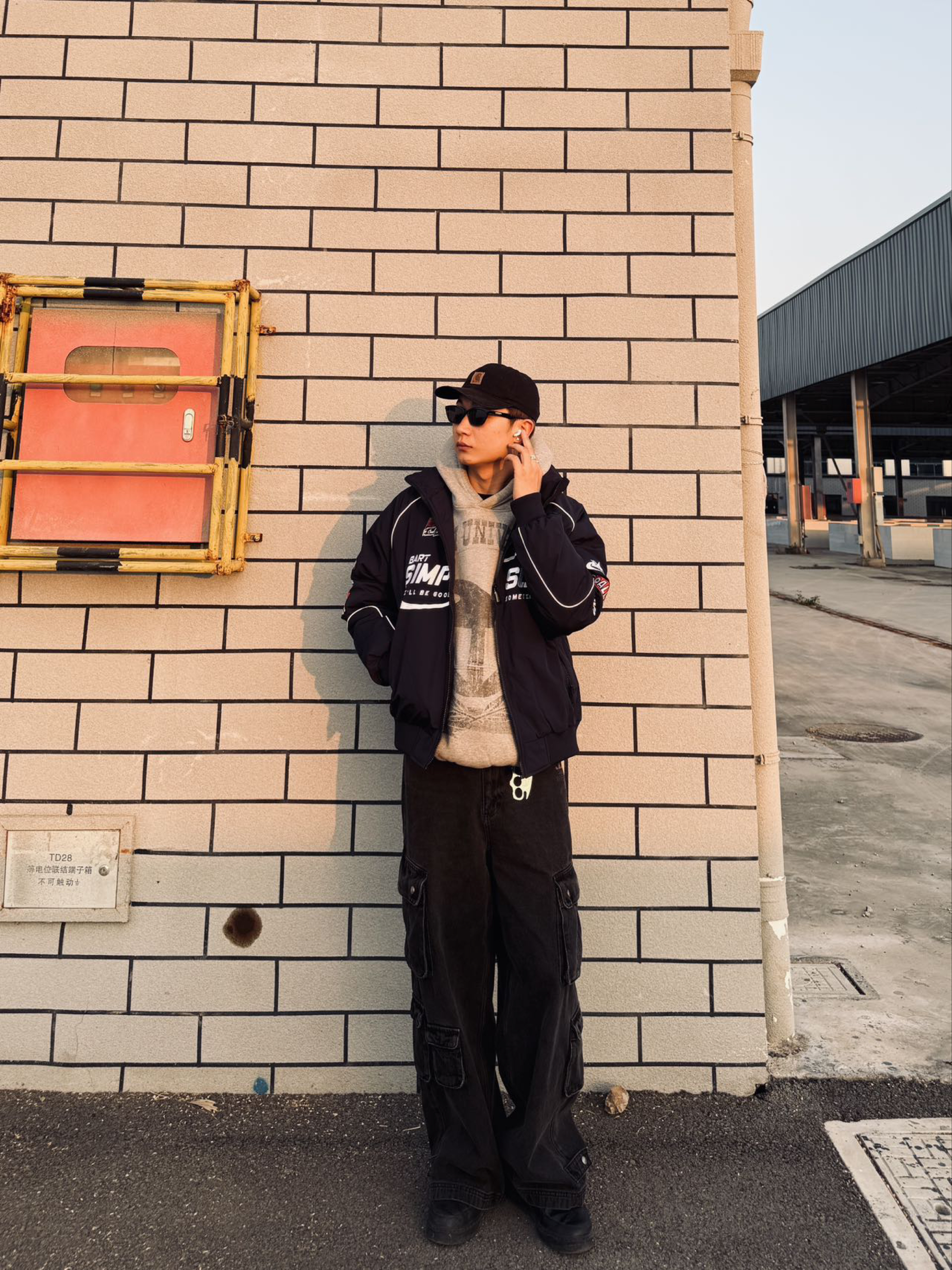 冰美式今日年度穿搭 傍晚溜老厂区 靠米砖墙站着 降温的风裹过来🌊 这套刚好兜住暖意 近期通勤常穿的一套 松垮不邋遢还够实用🌧️ — 👔藏青外套是美式高街调 大字母刺绣带复古感 撞色线条像赛车服 立领拉满能裹紧脖子 防风赶地铁太刚需 加厚鸭绒真暖 揣兜站半小时没冻透🔥 选的L码 塞厚卫衣也不挤 叠穿空间足 — 👖黑工装牛太省心 多口袋装耳机钥匙 通勤不用背包 中腰面料带保暖感 秋冬穿不凉腿 XL码...