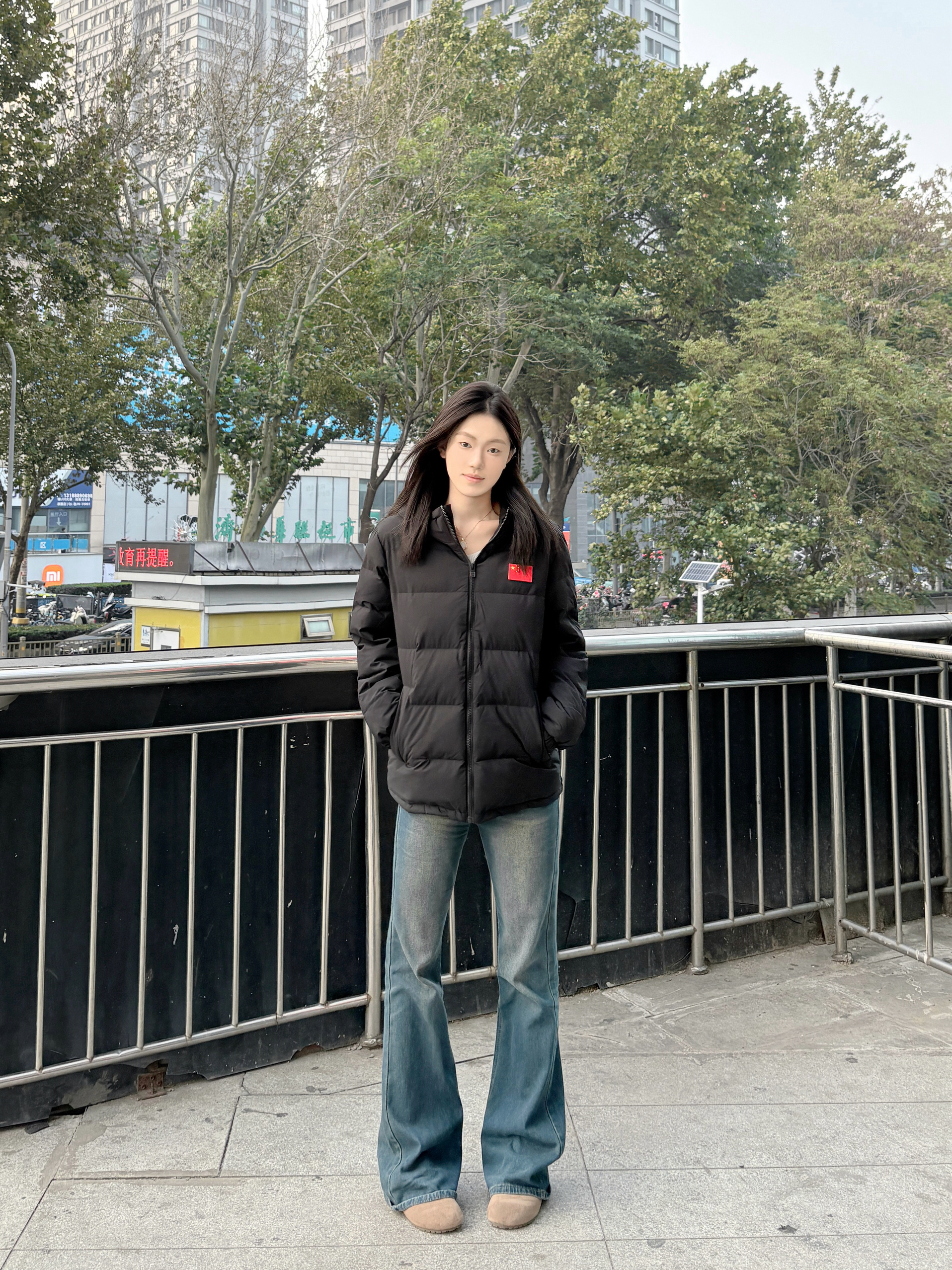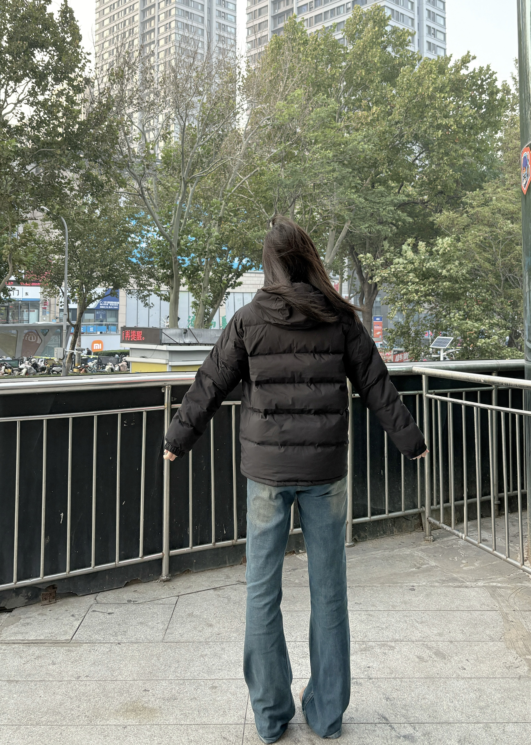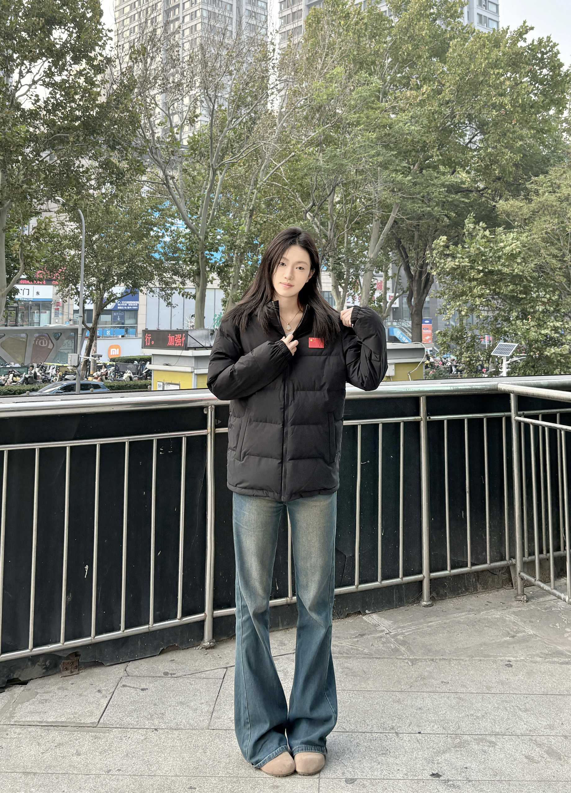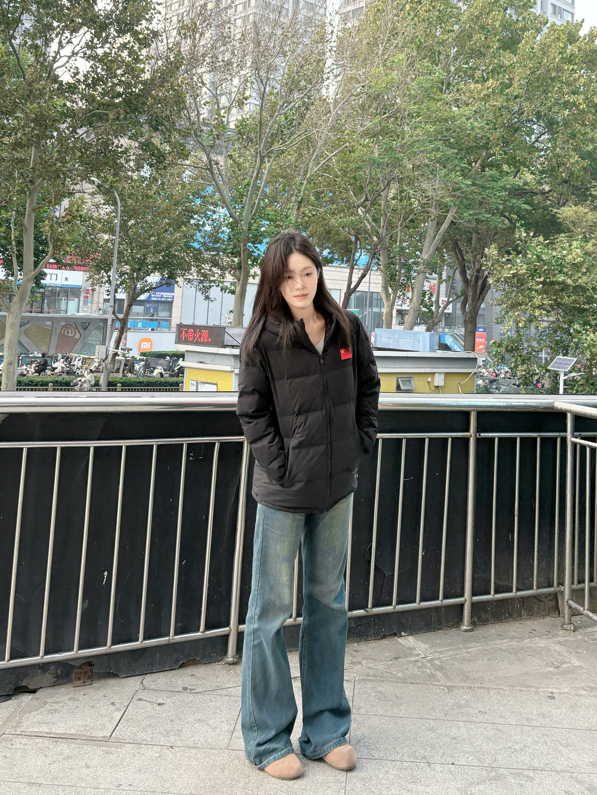 这件黑色短款羽绒是很省心的穿搭选择——版型利落不臃肿,套厚内搭也不会显壮,立领拉起来能裹住脖子,防风刚好 胸前的标识是亮眼的小细节,不夸张但很有辨识度;面料摸着手感顺滑,口袋是插袋设计,揣手或者装小物件都方便 配阔腿牛仔裤不用费心思搭,休闲又显利落,日常出门、通勤穿都舒服,保暖度也够应付降温天