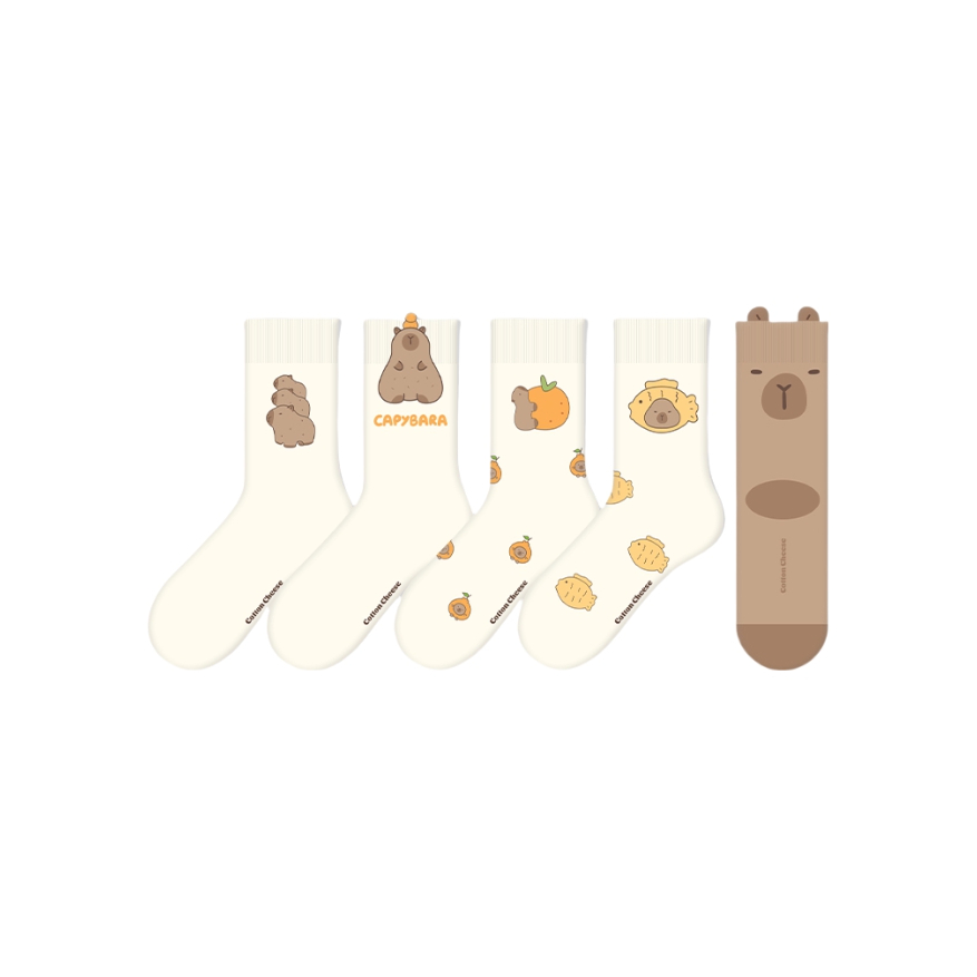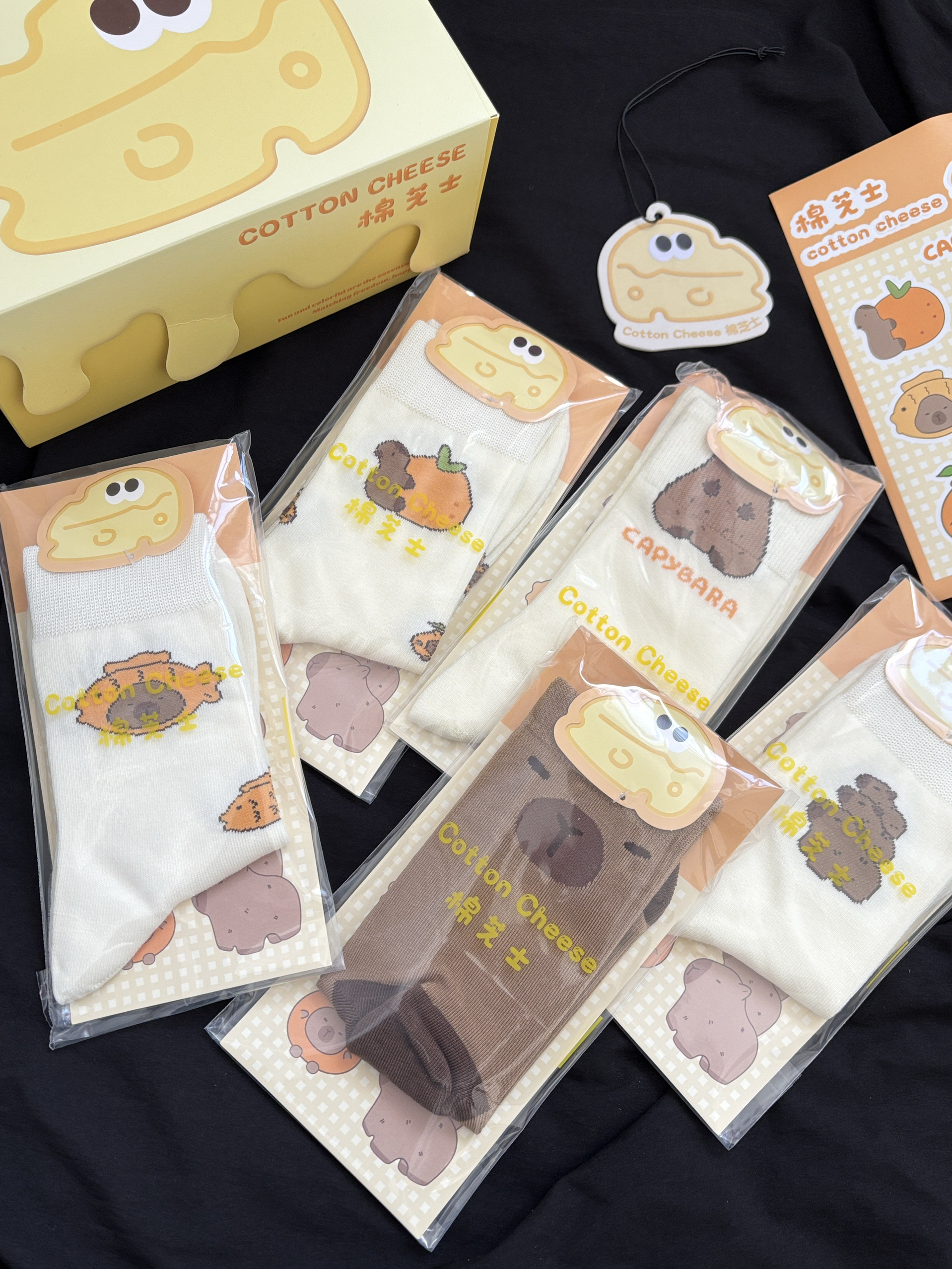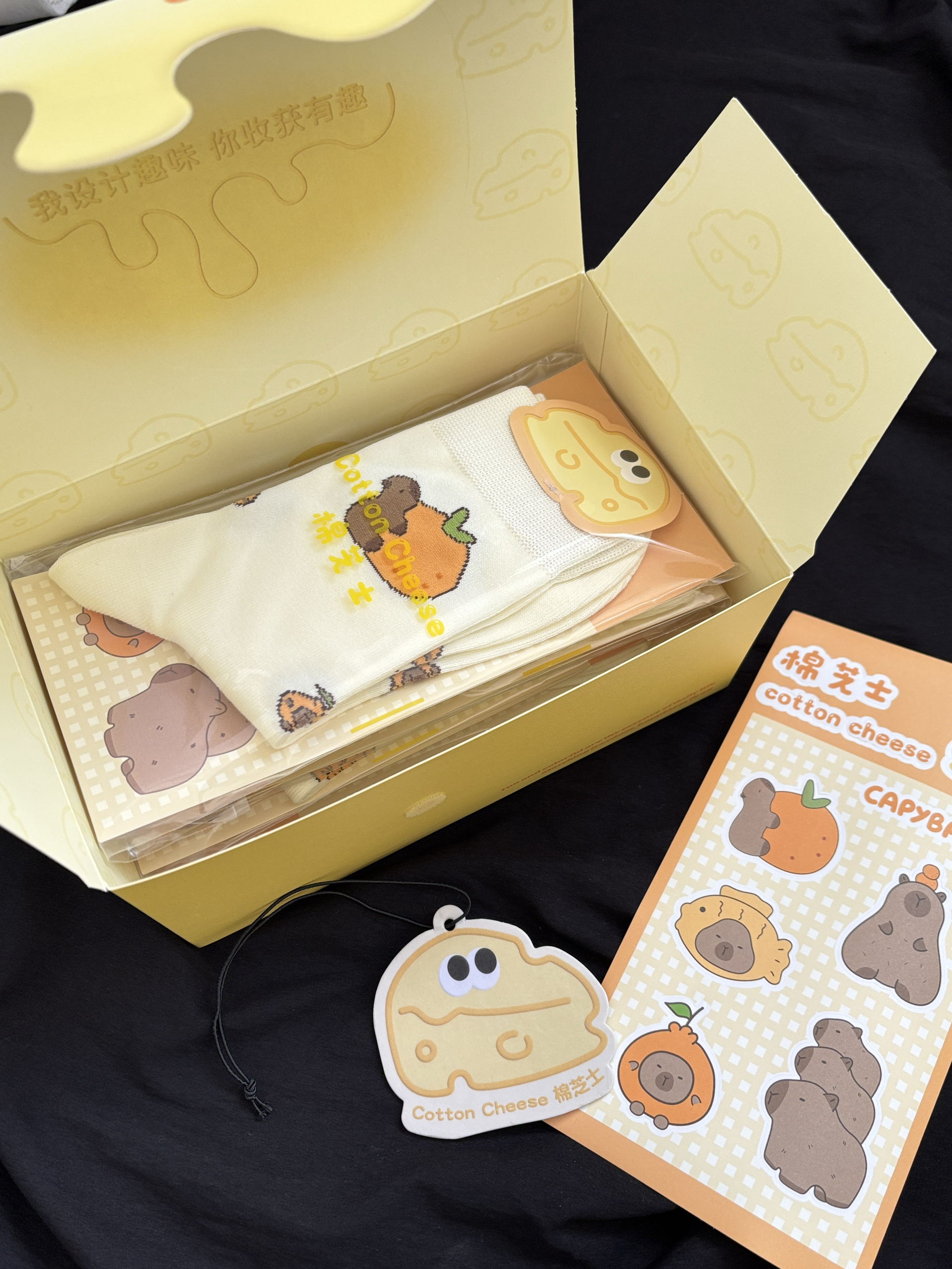 收到手打开盒子那一瞬间先被这个包装萌鼠了 像块奶黄色的芝士小蛋糕🍰(⋟﹏⋞) 我买的是卡皮巴拉系列的最近被这个吸引住了 里面是5双不同图案的袜子敲可爱嘟 软软 fufu 的纯棉材质穿着可舒服 透气舒服脚感挺好穿了一阵也没起球 日常搭配休闲鞋板鞋啥的我感觉都不错挺百搭的✌️