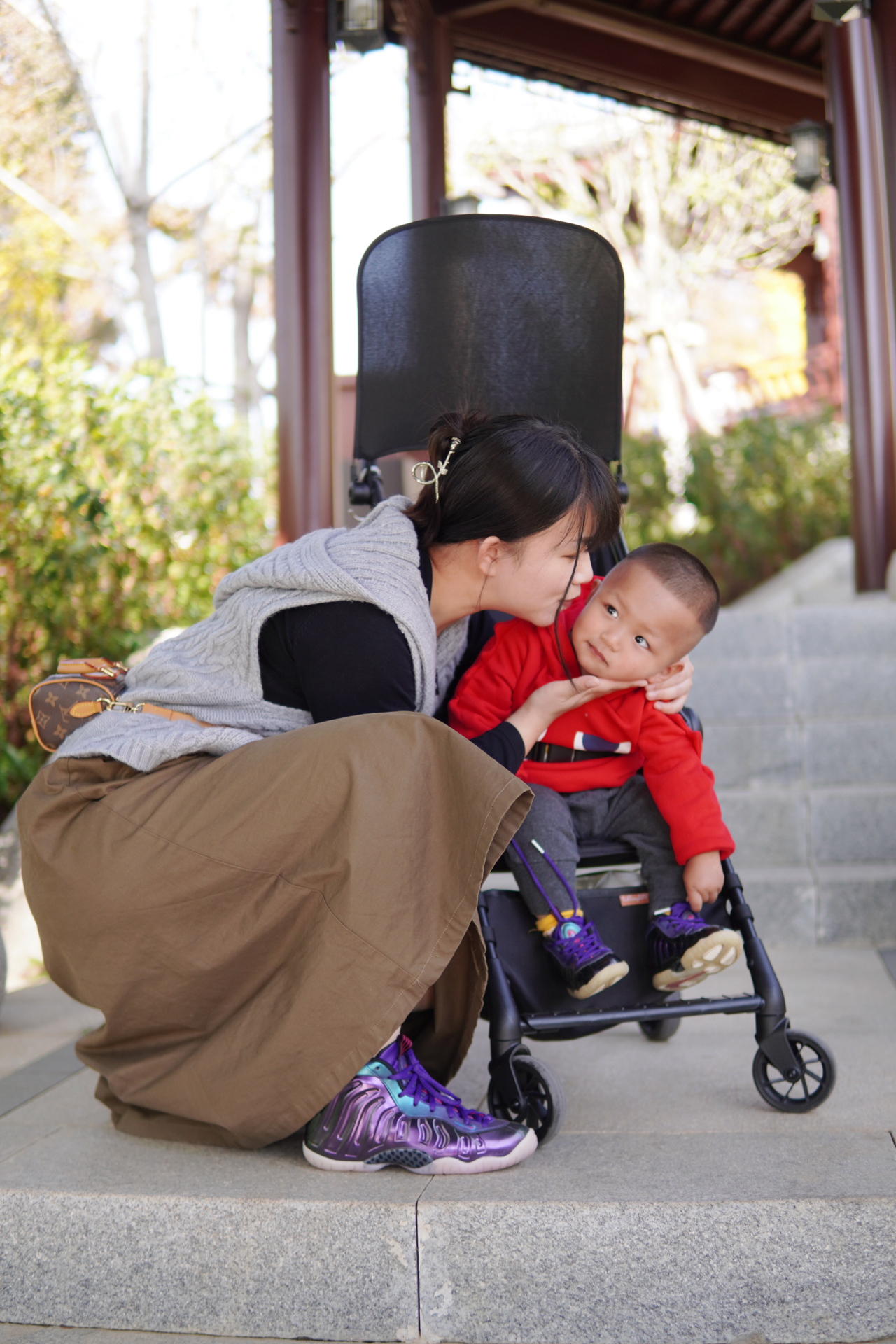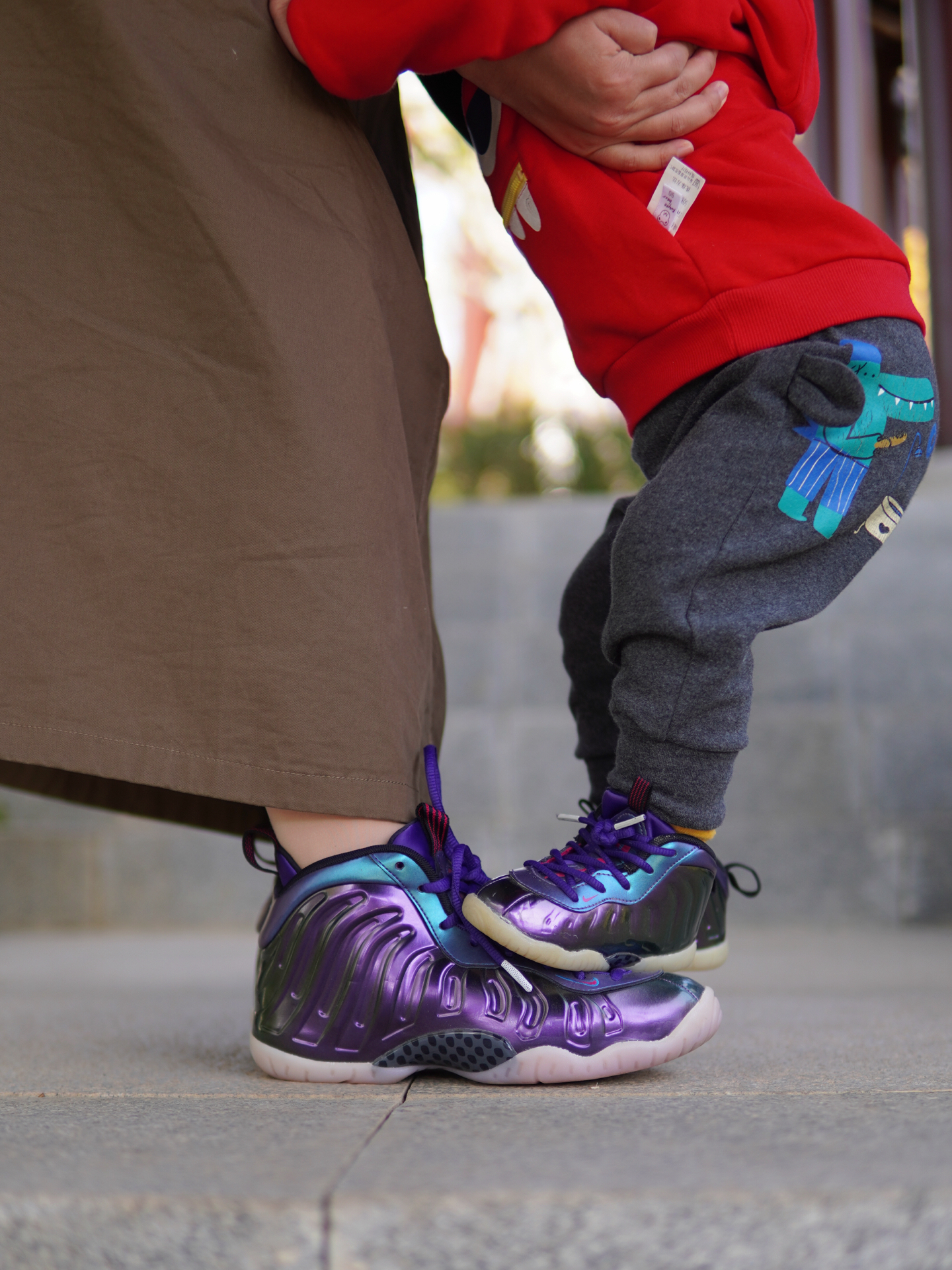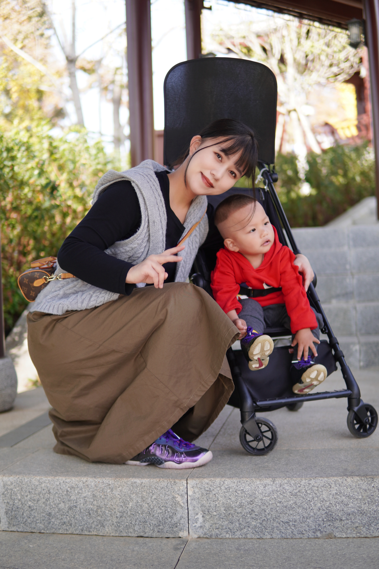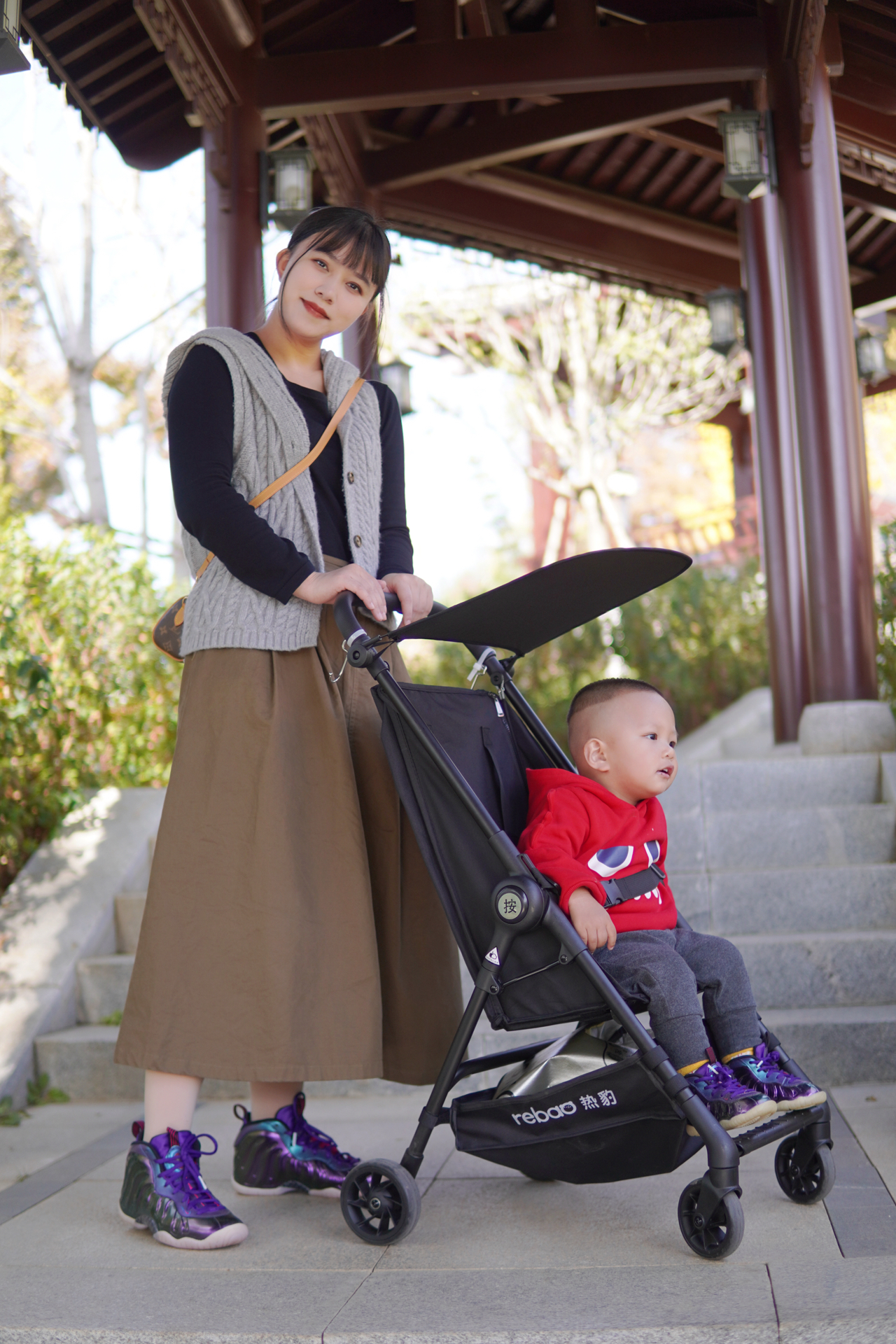 #一人一件过冬好物 今天武汉的天气非常好20℃ 带着妈妈和宝宝出门晒太阳🌞 顺便拍一组好看的亲子鞋照片 ▪️ 婴儿车: 这个宝宝的口袋车真的很好用 我也是昨天才收到的 打开和收纳都很方便 最主要的是比较轻便 质量杠杆的~ ▪️ 鞋子: 1️⃣我穿的是大童37.5码的耐克喷泡 这个紫色超炫酷 上脚比较舒服的一点就是足弓那块支撑特给力 拍照片也是很亮眼 今天穿着它走了1w多步没有感觉到不舒服 全程无...