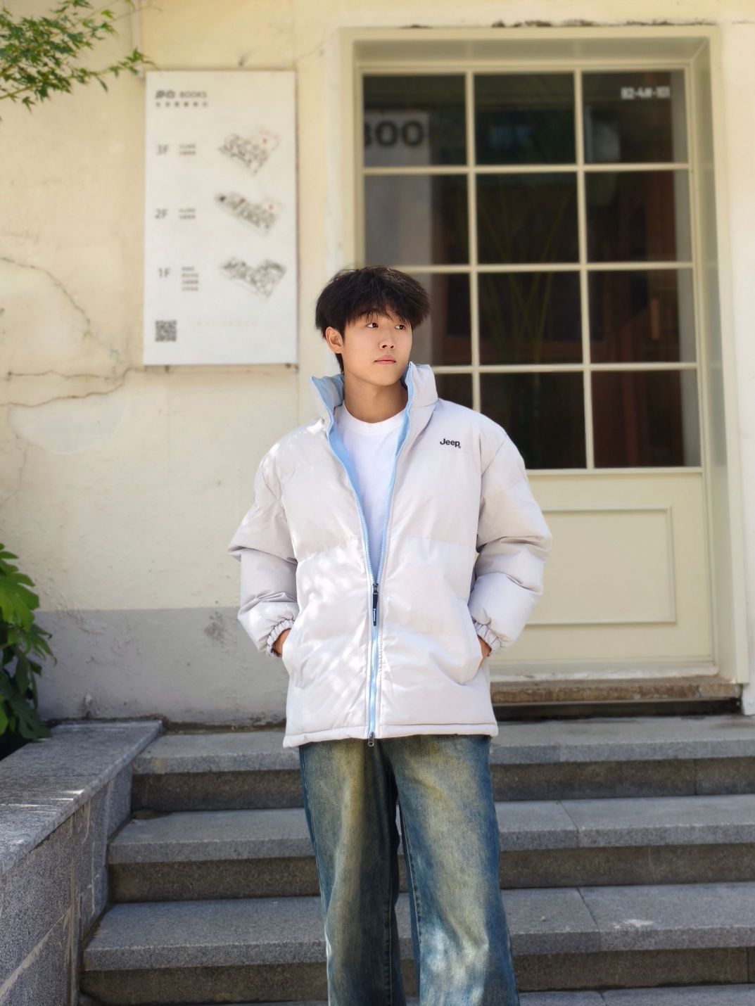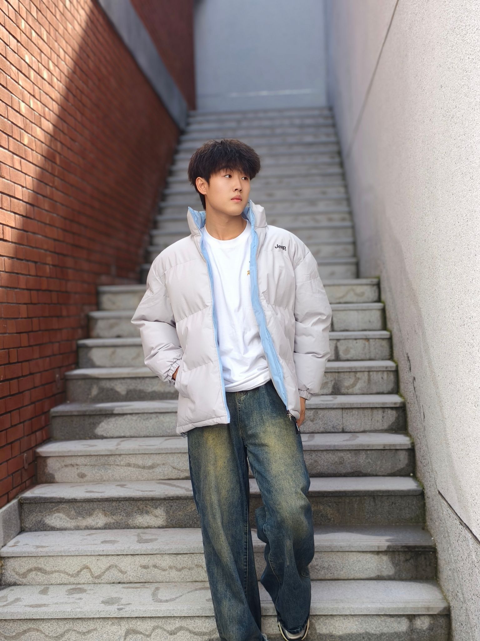 谁懂啊家人们!这件浅灰色面包服真的挖到宝了💙 软乎乎的面料贴身穿都不扎,撞色的浅蓝拉链是点睛之笔,内搭随便套件纯色打底就超有层次感~ 下装选了做旧水洗的阔腿牛仔裤,版型巨藏肉,对梨形身材/微胖男生超友好,裤脚堆在鞋面上的慵懒感,直接把韩系街头那味儿焊在身上😌 不用费脑的搭配公式,出门随便站站都出片,秋冬不想穿得臃肿又想有风格,这套直接抄作业!