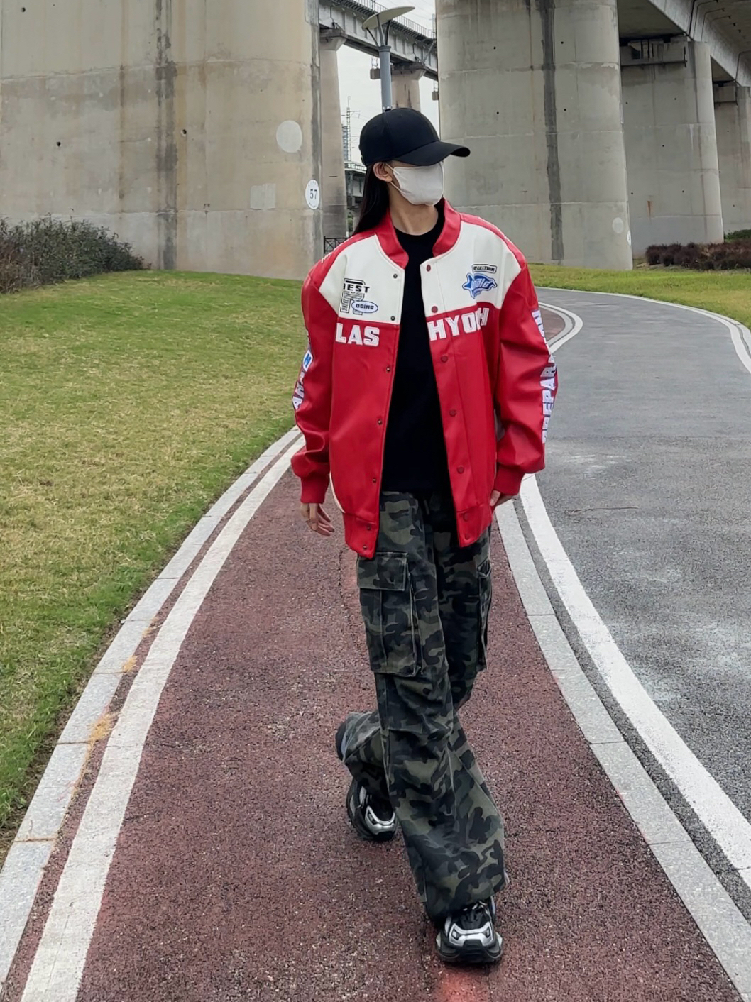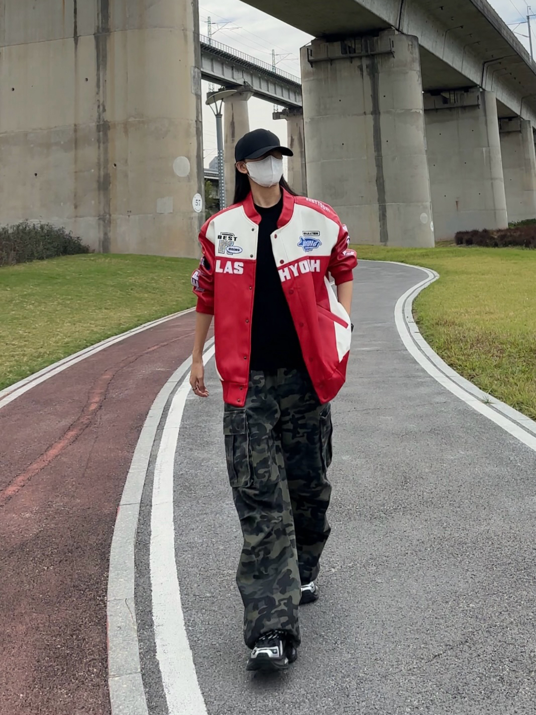 红白色棒球服自带复古buff,撞色拼接+字母印花直接把潮流感拉满,内搭基础黑T平衡视觉,下装选迷彩工装裤增加硬朗质感,宽松版型适配各种身形,走在城市步道上,松弛感直接焊在身上!