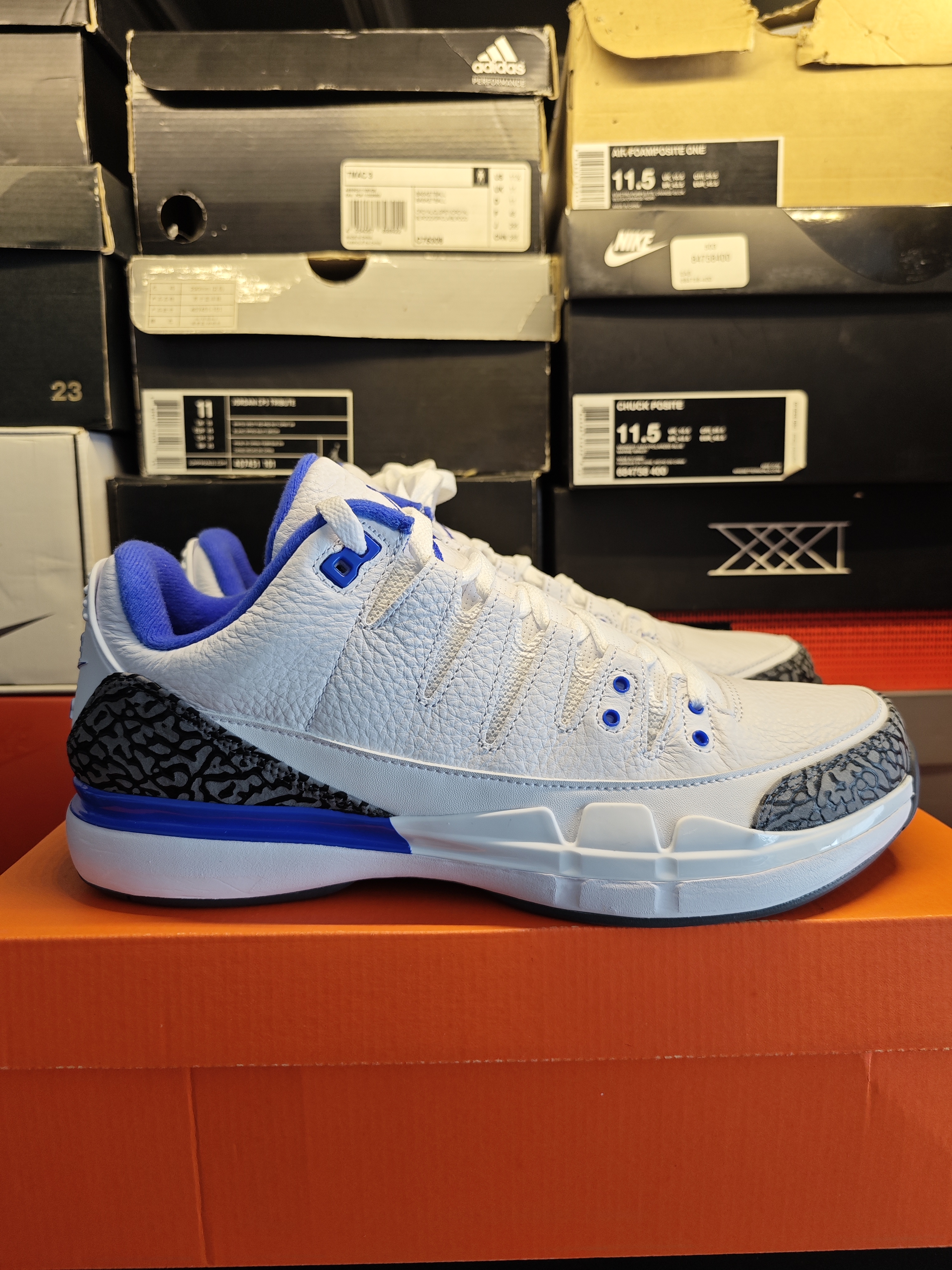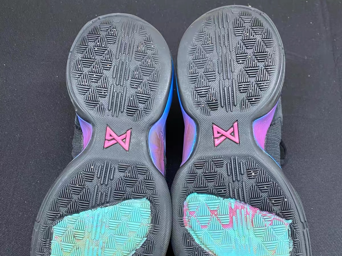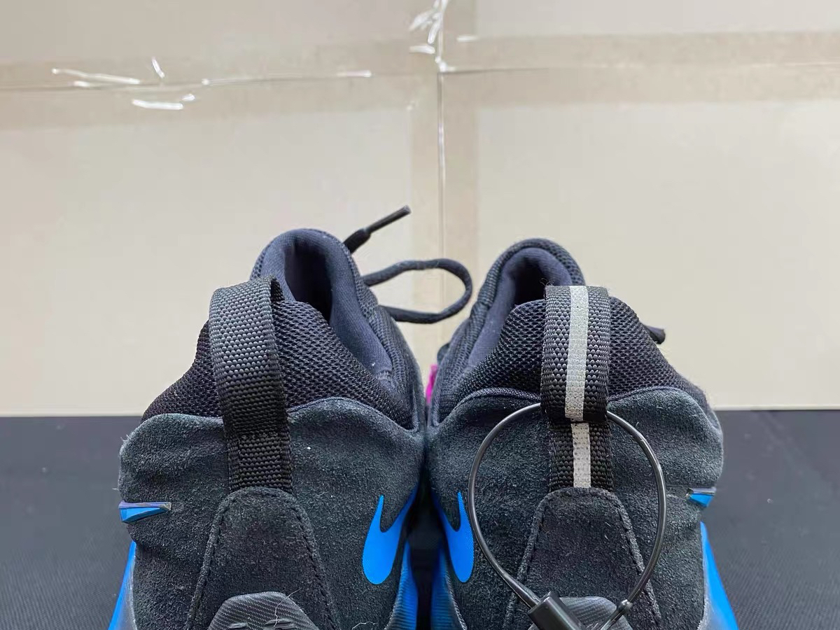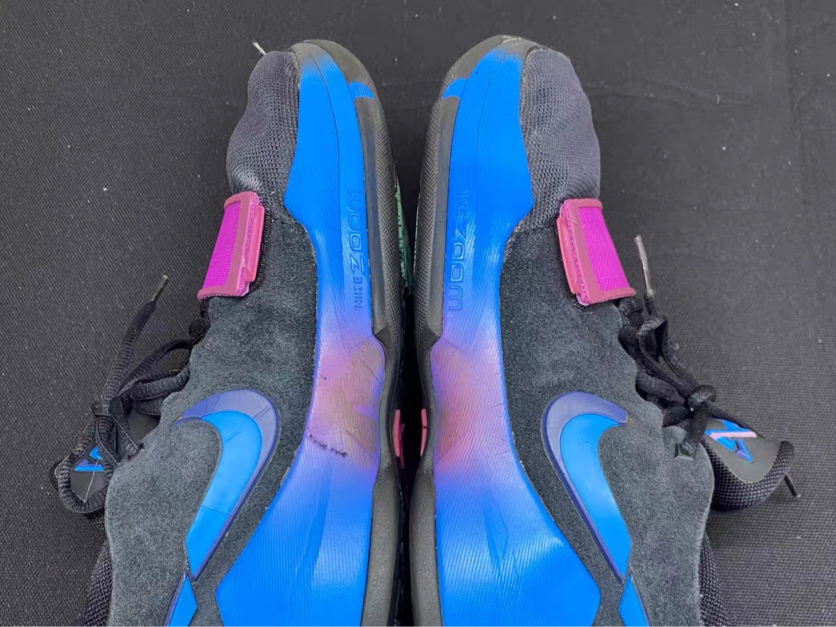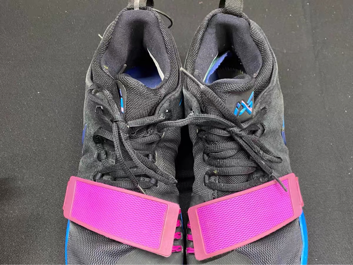 这双PG1复刻版拿到手真的被年代感美学暴击了!鞋面用纯白皮革打底,侧墙Swoosh玩起断勾隐身术——黑银渐变勾边像被刀锋削过,光线下转角度才浮出金属光泽,远看简约近看藏着「印城将军」的冷兵器美学!最绝的是魔术贴彩蛋——紫罗兰绑带底下压着乔治手绘草稿暗纹,撕拉时像解锁2017年时空胶囊,后跟13号刺绣直接把情怀党拉回步行者时代,突破变向瞬间梦回「季后赛抗詹岁月」!