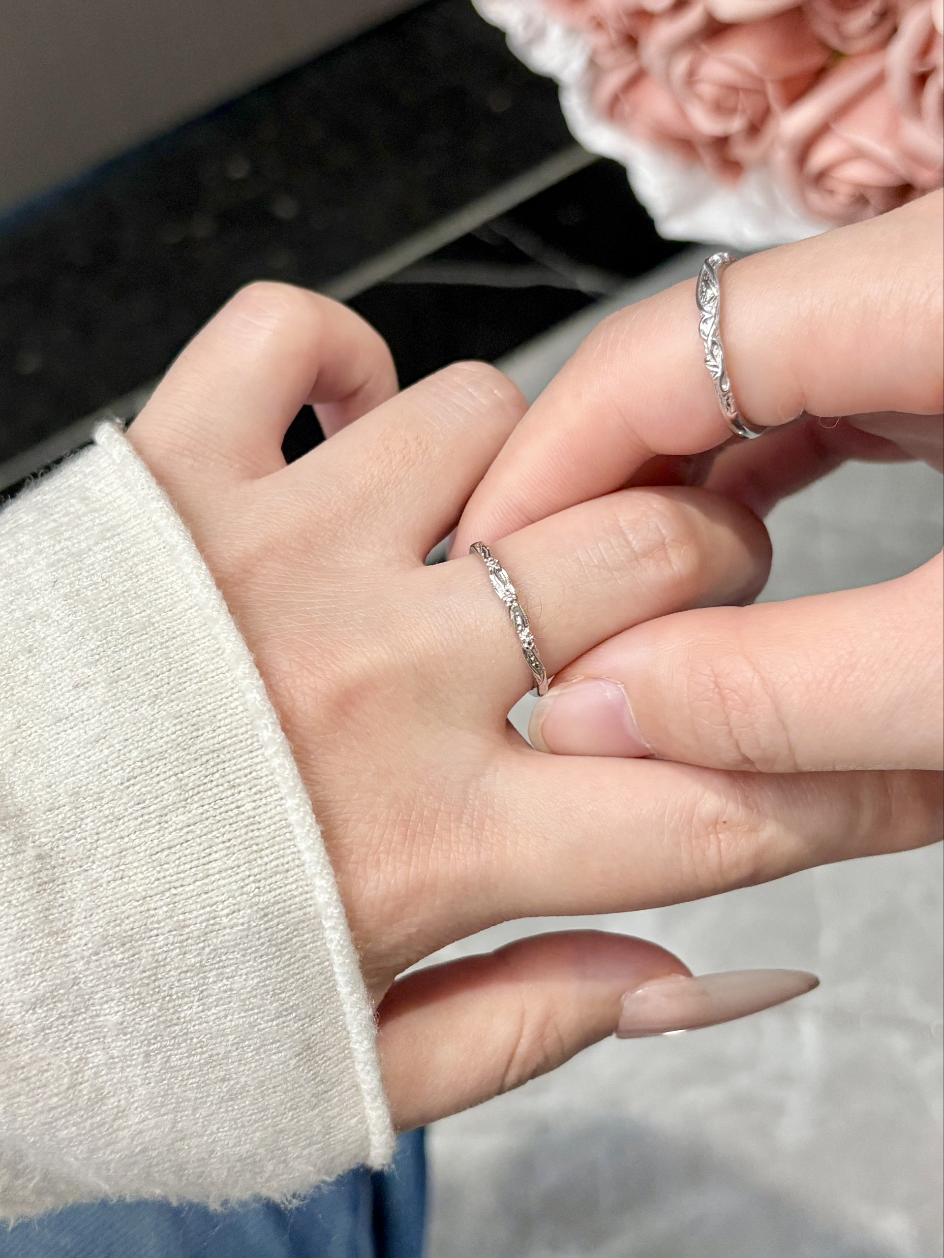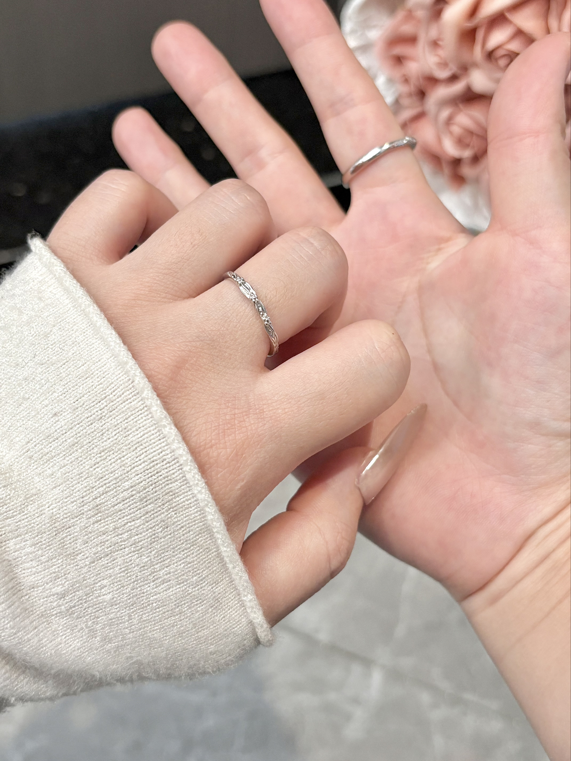 这个相思藤情侣对戒哇 我觉得这个设计还蛮特别的 是相互缠绕的花蔓尊滴很精致哦 日常戴在手上温柔还百搭 我介个戴了有一段时间啦 还亮亮的有光泽 要我说恋爱期戴情侣同款也泰甜蜜了吧