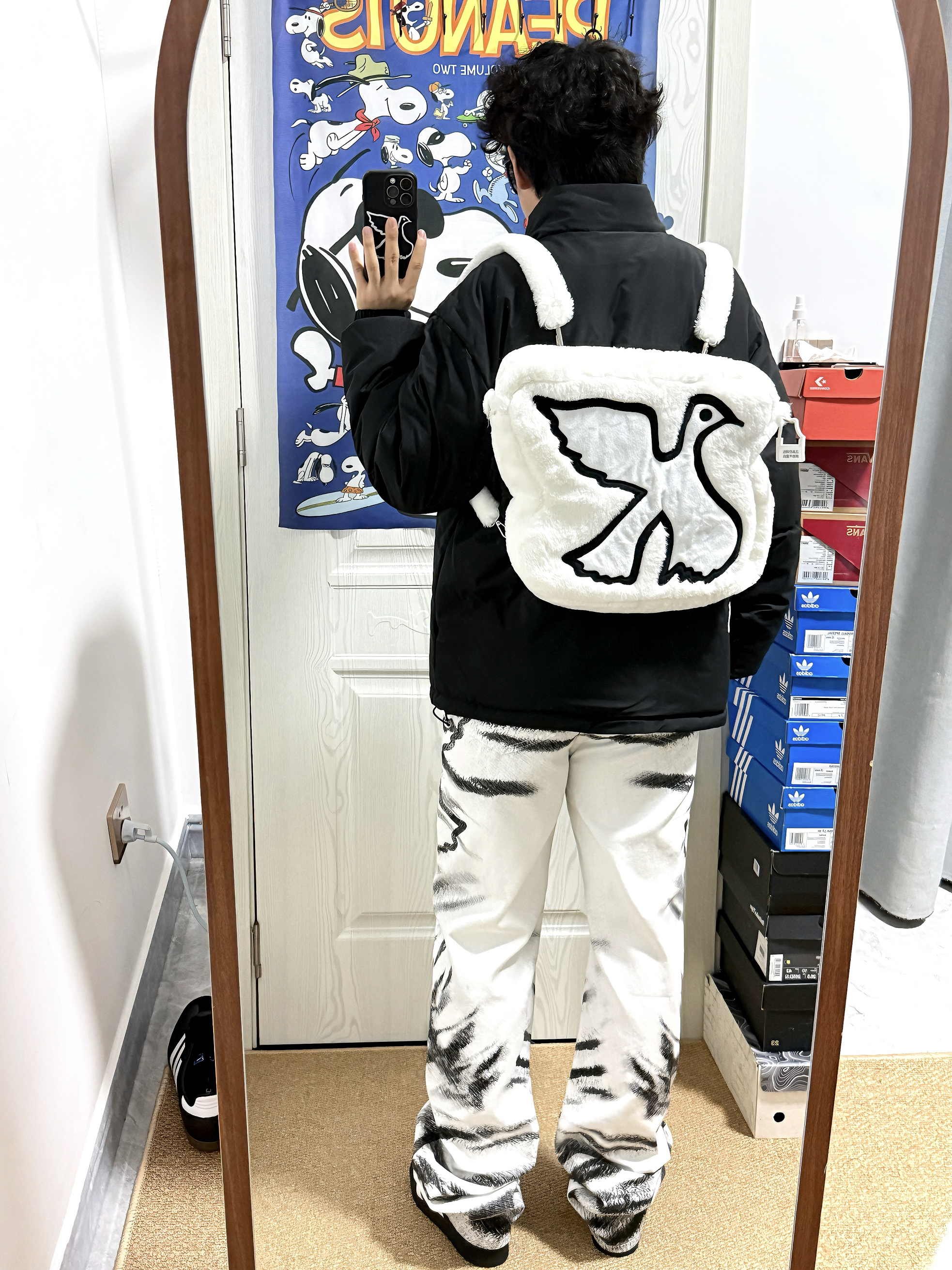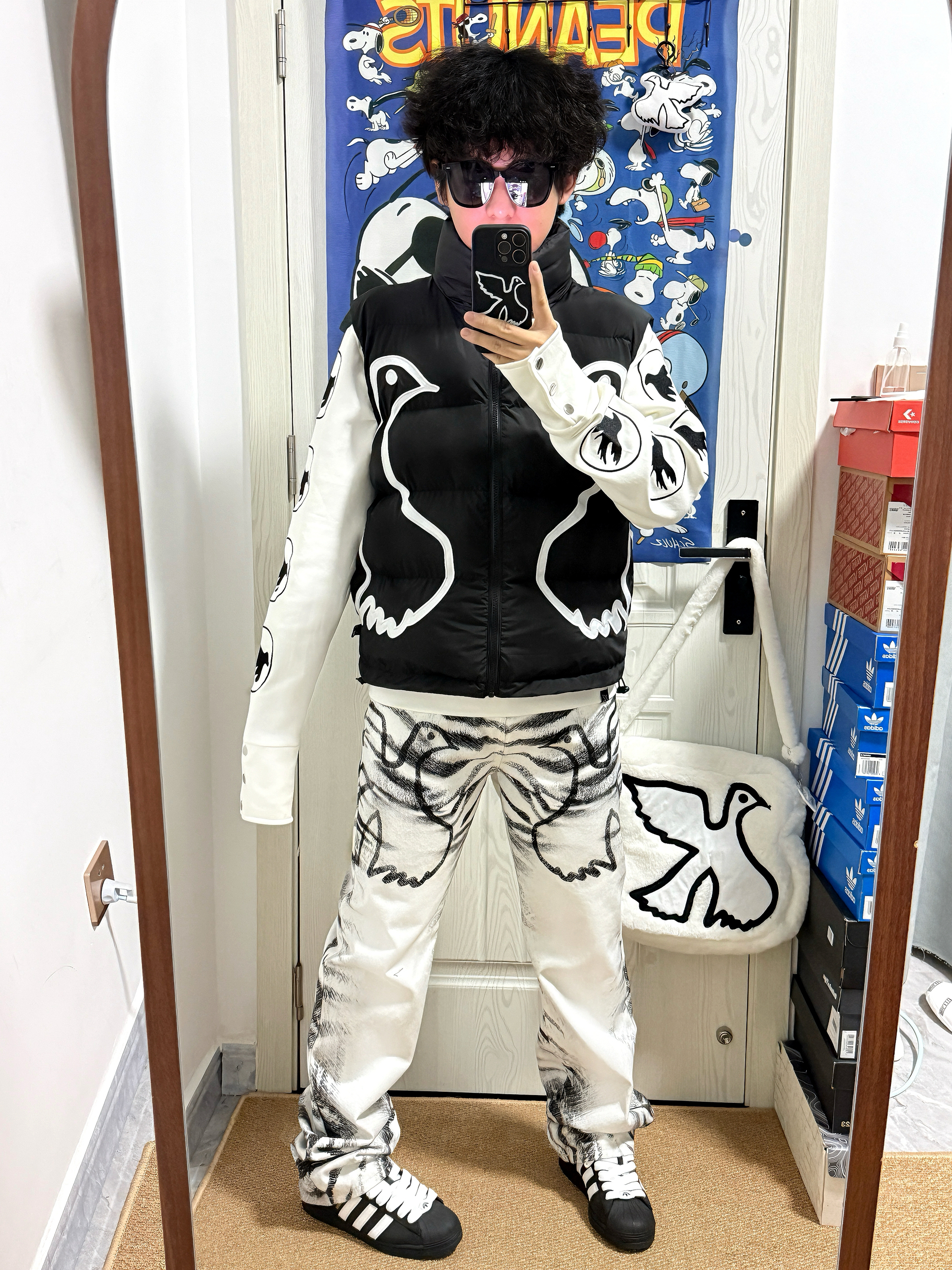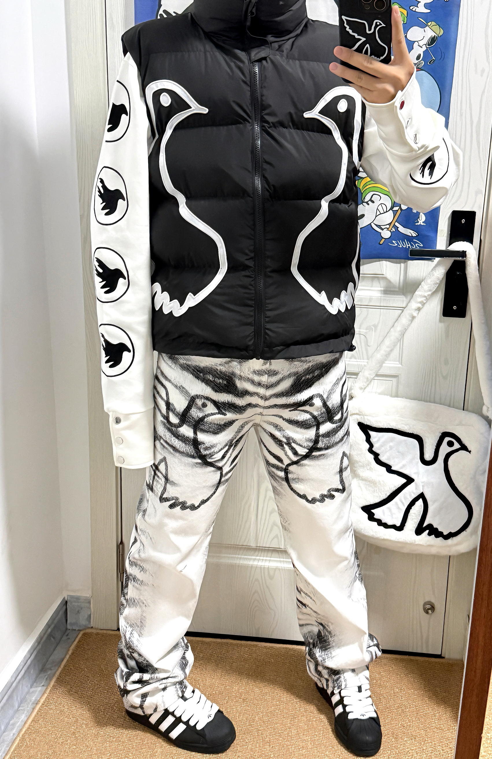 最近河南🌨️好冷呀🥶 我给自己安排上了/Vinkid鸽系三件套👀 立领棉马甲➕太空棉卫衣➕虎纹白牛 穿上身软乎乎的🤓 立领棉服挡风🌬️又不臃肿 太空棉卫衣穿贴身也很暖🔥 满印鸽元素是小众 但不夸张的街头感 喜欢美式风的boy可以试下这套!