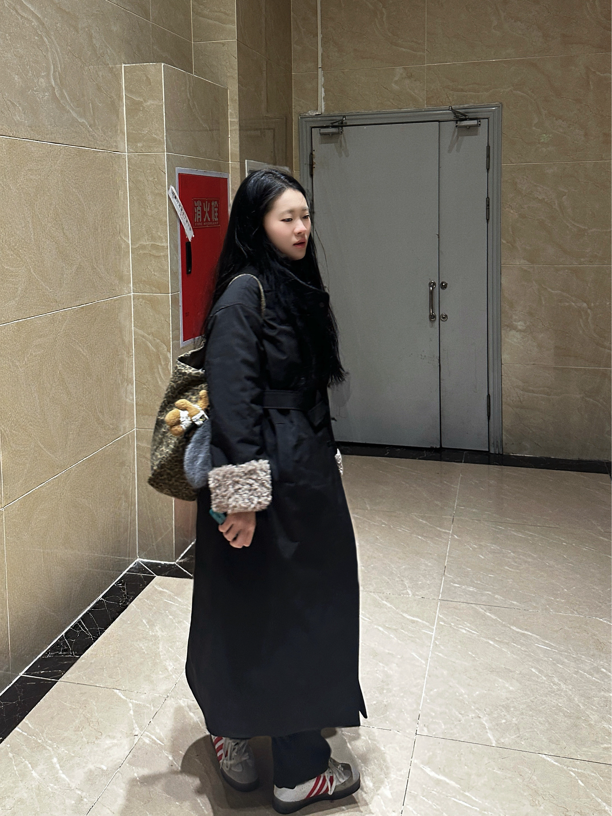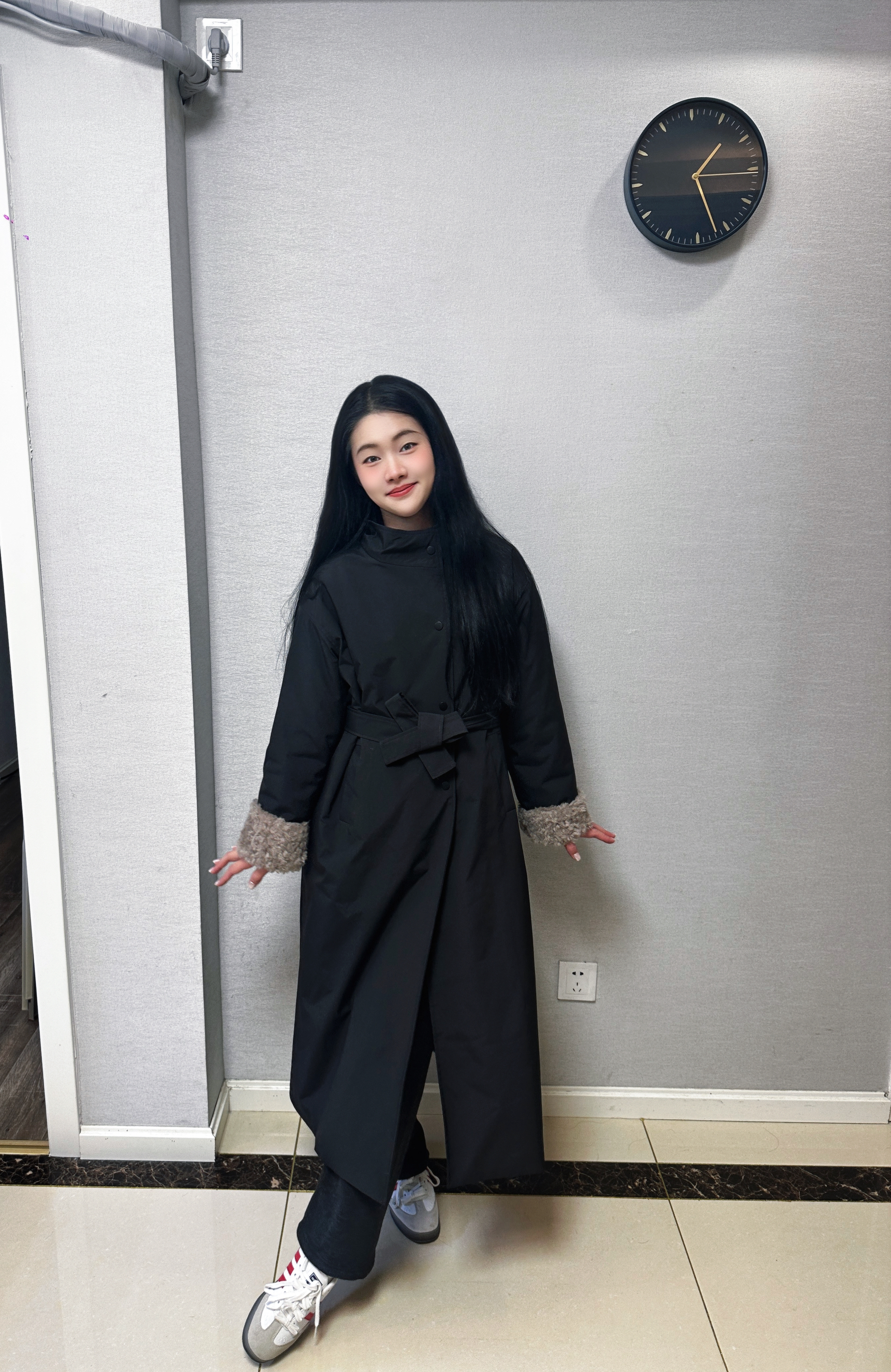 长款黑色立领大衣利落显贵🧥,挺括版型自带强大气场,保暖又压风!搭配黑色阔腿毛呢裤,垂顺面料遮肉显瘦,秒 get 三七分优越比例🦵~ 点睛之笔是红白色阿迪达斯 Hello Kitty 联名鞋!蝴蝶结细节软萌戳心🎀,红白色调打破全黑沉闷,运动感中和大衣厚重感。整套 look 甜酷碰撞,通勤、逛街都吸睛,舒适又时髦,冬日氛围感直接拉满🌟~