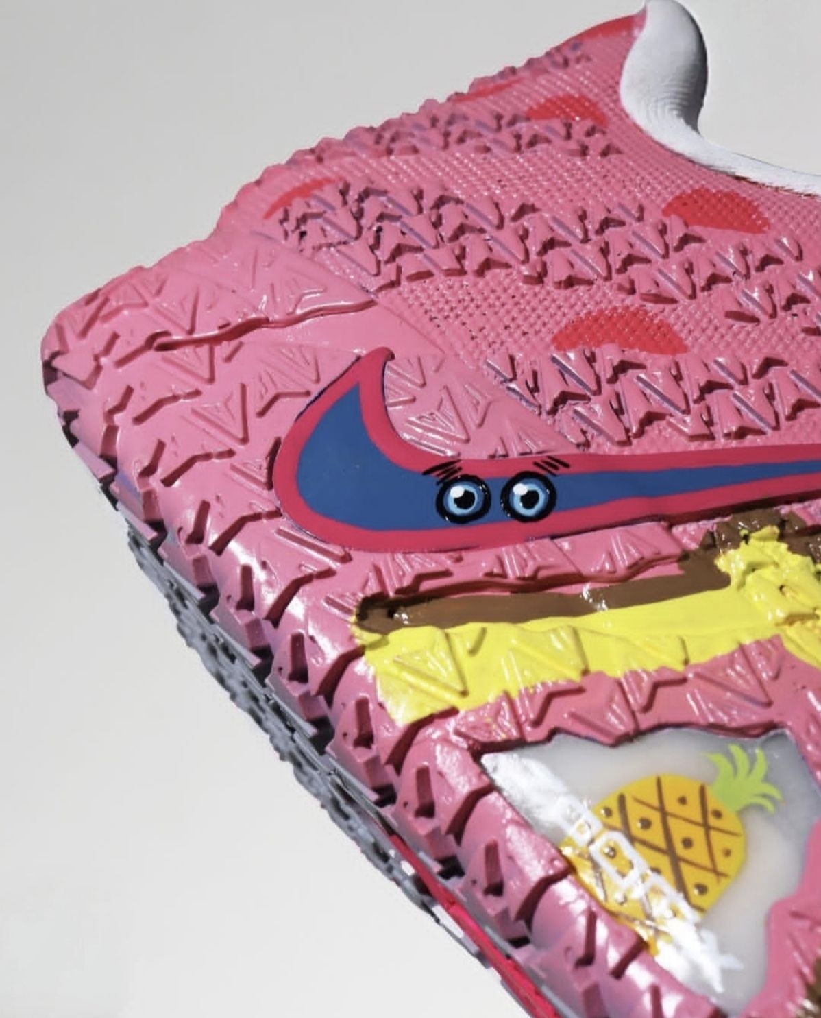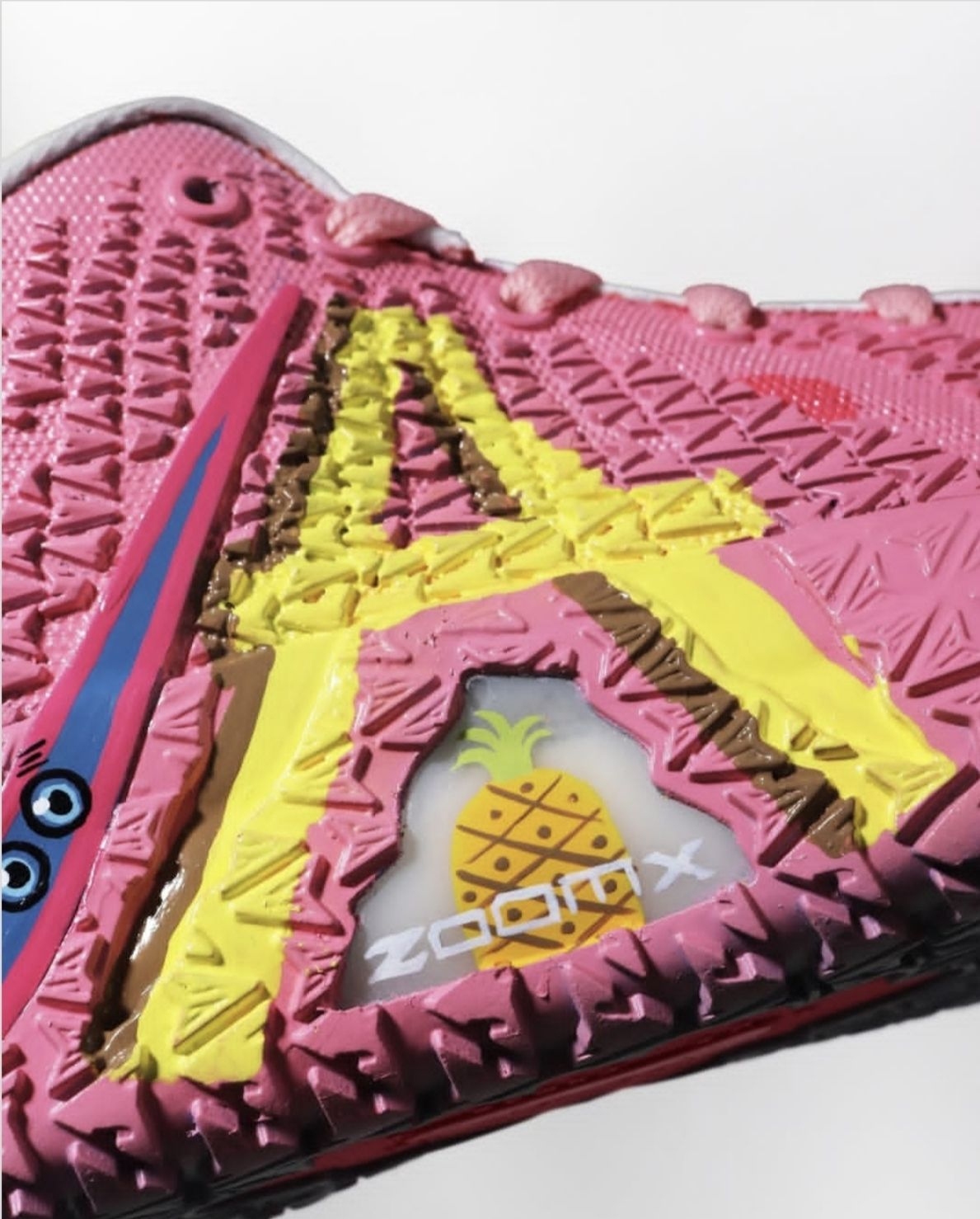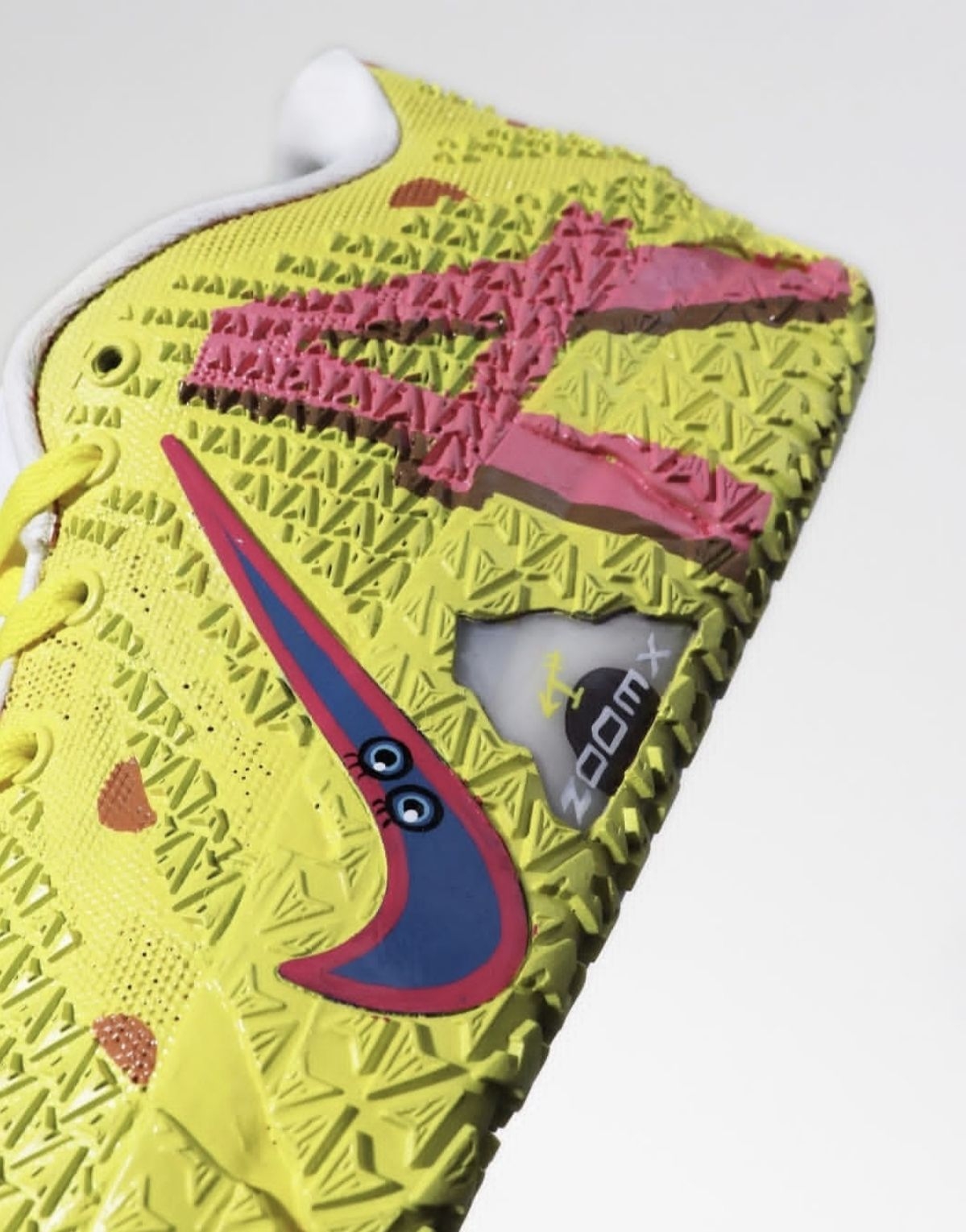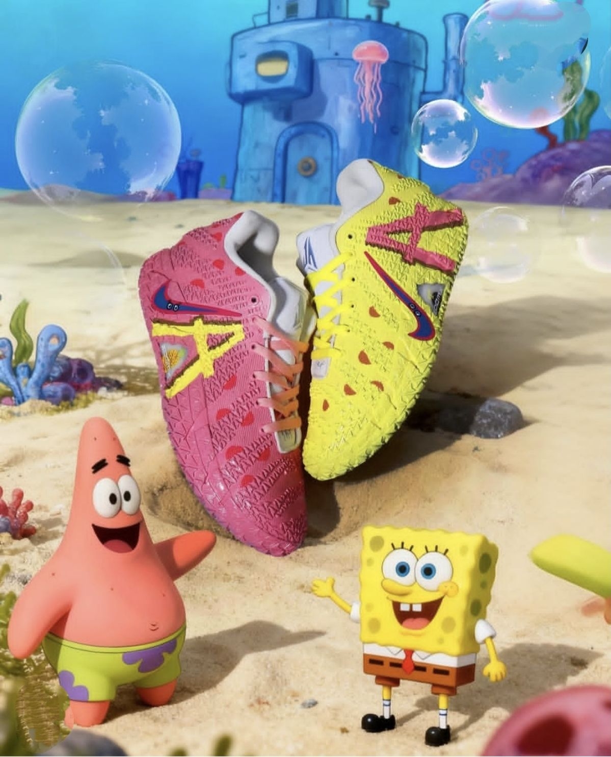 外观设计:把比奇堡穿在脚上 海绵宝宝款(粉黄撞色) - 鞋面:粉色编织网布模拟海绵宝宝的「海绵质感」,黄色泼墨纹路还原菠萝屋外墙肌理 - 细节:鞋侧Swoosh用荧光黄勾勒,鞋带孔点缀卡通气泡图案,后跟刺绣海绵宝宝笑脸 派大星款(黄紫渐变) - 鞋面:亮黄色发泡材质打造「海星肌理」,紫色渐变中底模拟海底光影 - 细节:鞋舌绣有派大星标志性绿色短裤图案,鞋底印有卡通脚印纹路 ...