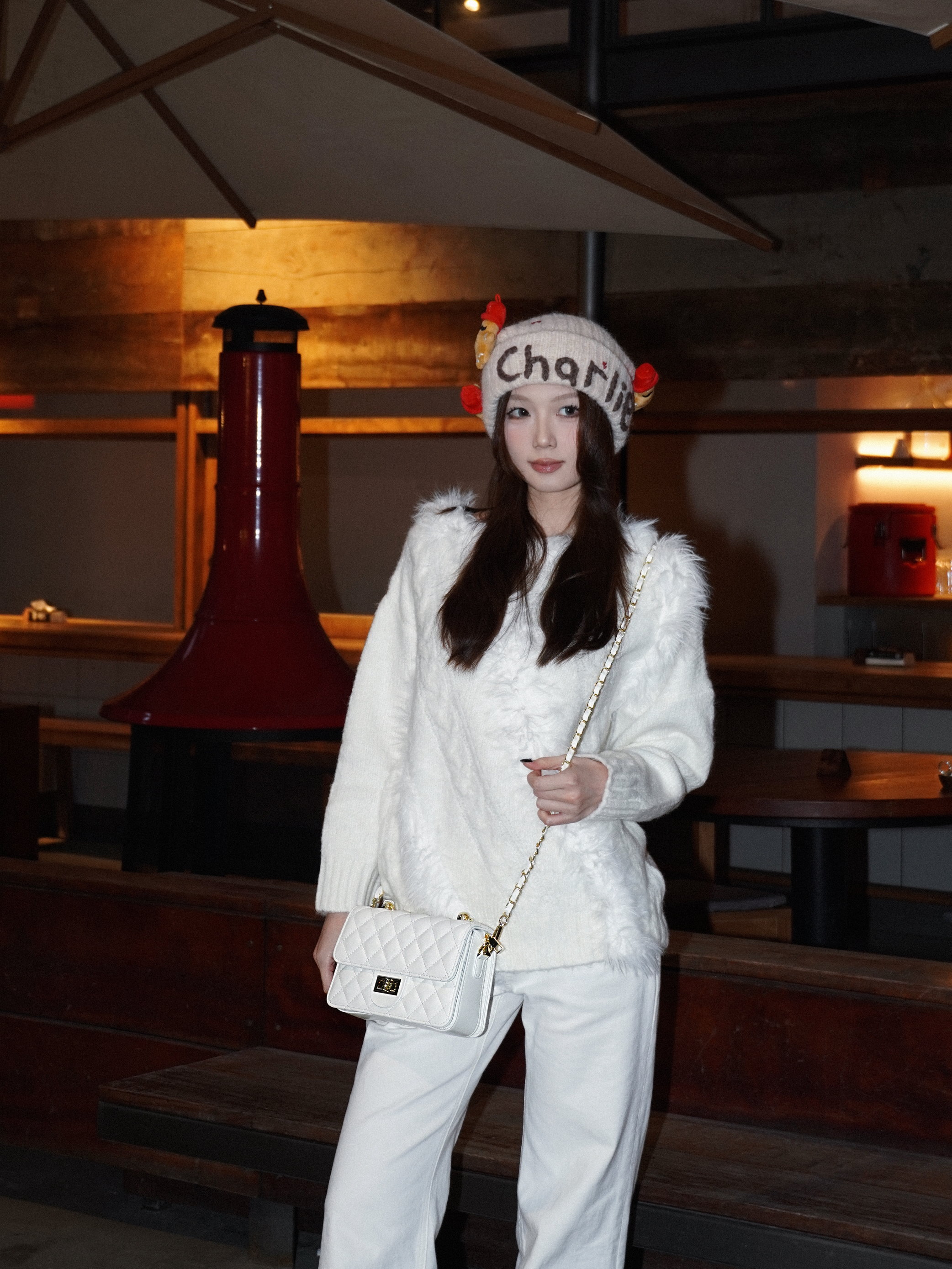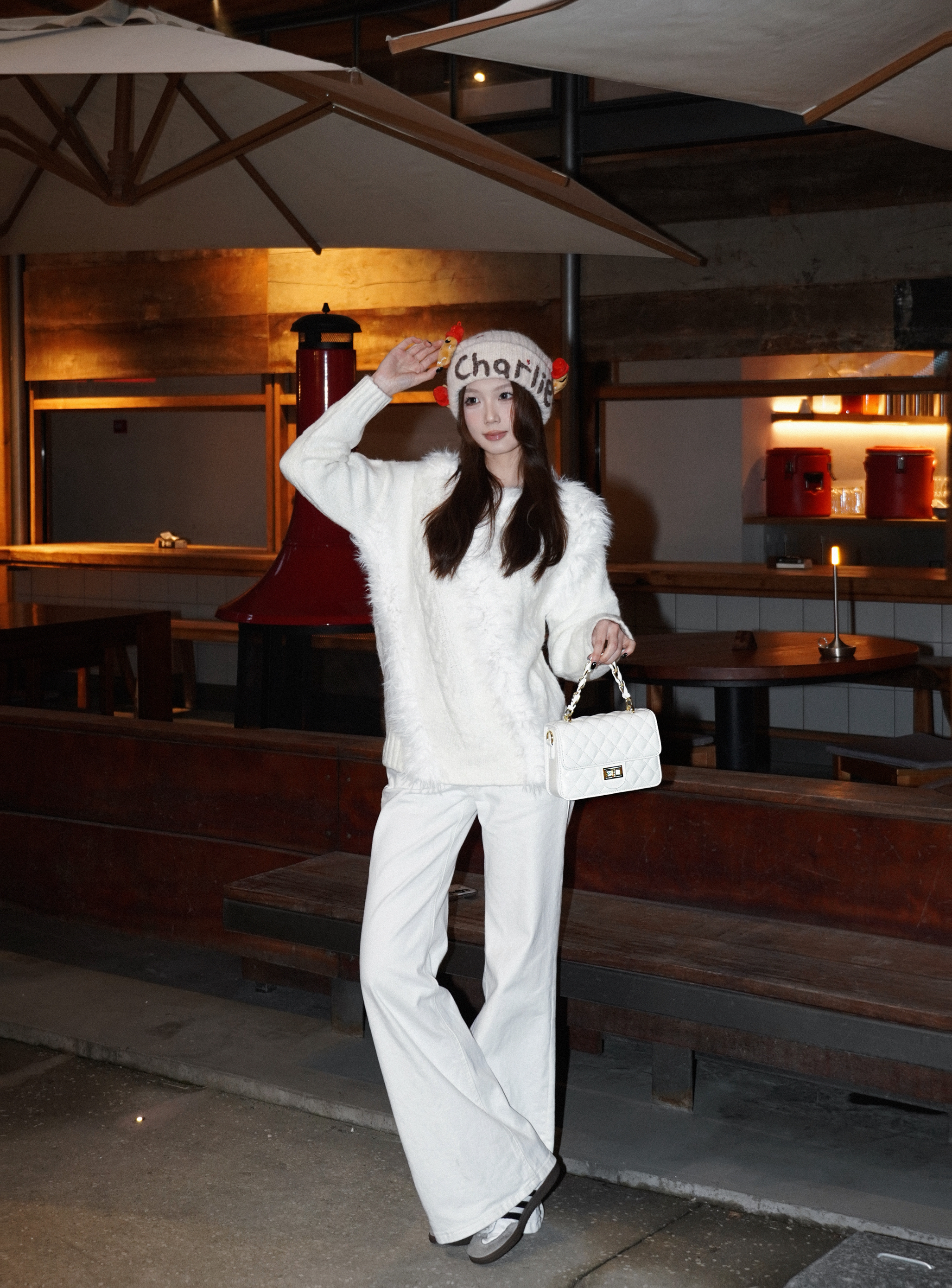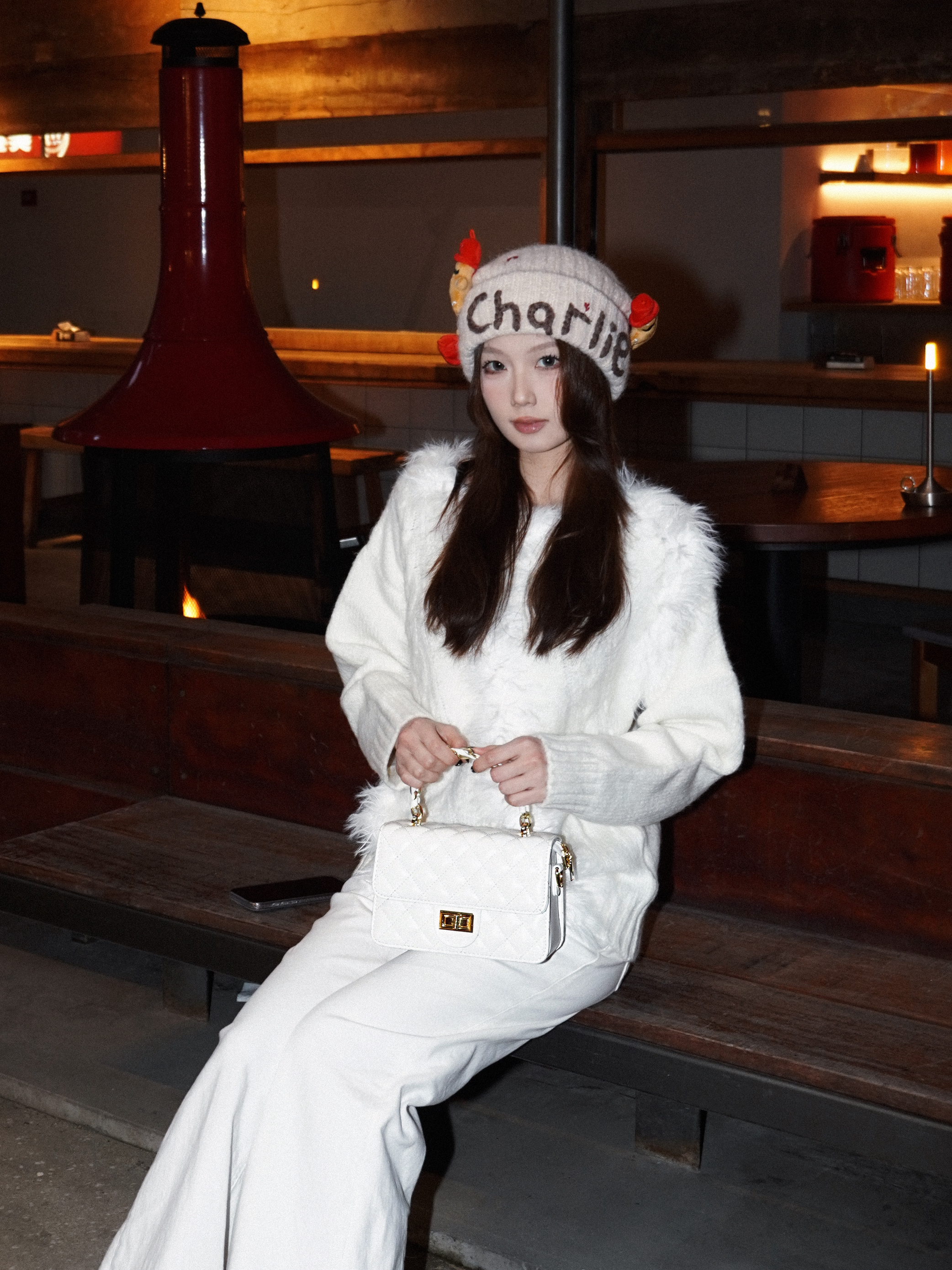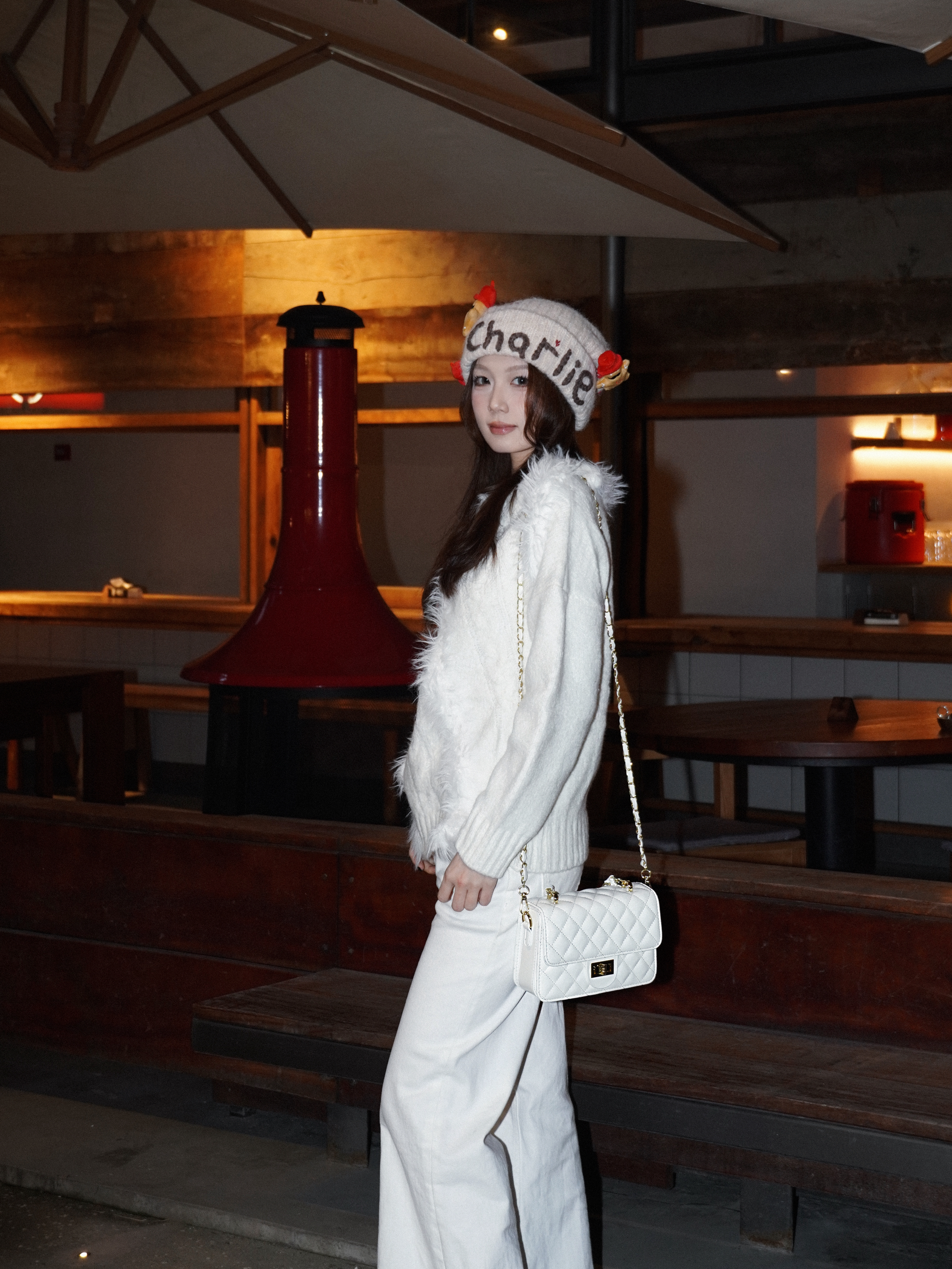 如果这个冬天只能选一种配色 那我一定会毫不犹豫选择白色系🤍 像移动的圣诞甜点 氛围感十足 白色的针织毛衣 可以当一字肩去穿☁️ 再搭配白色微喇裤 又高又瘦 姜饼人针织帽可爱到犯规 戴上立刻有圣诞内味儿了🎁 白色菱格小方包精致又不失实用 可斜挎的随性 可手提的优雅👜 棕色木质餐厅+温暖的壁炉 和全白穿搭形成绝妙反差 仿佛置身北欧圣诞电影场景🎞️