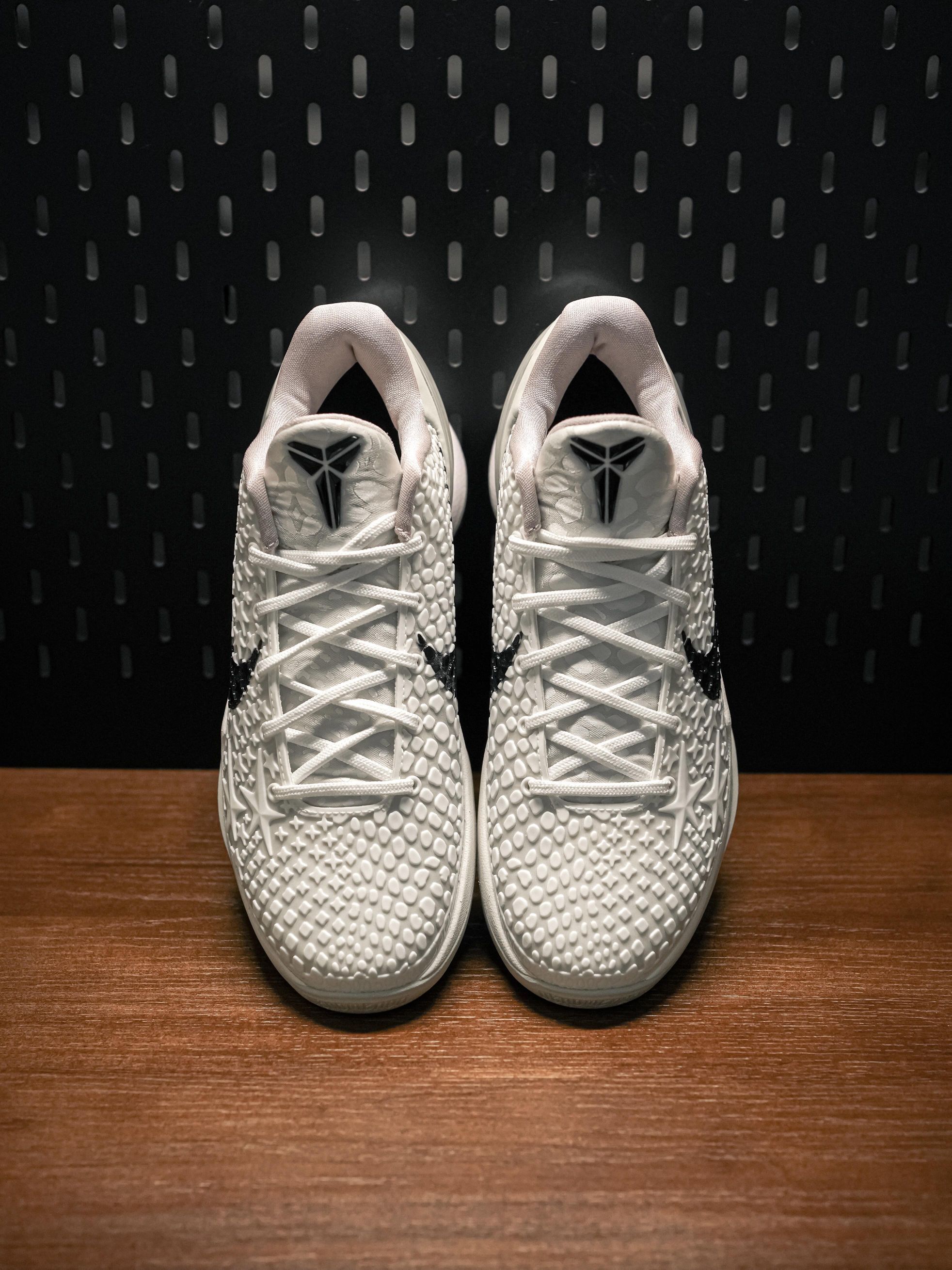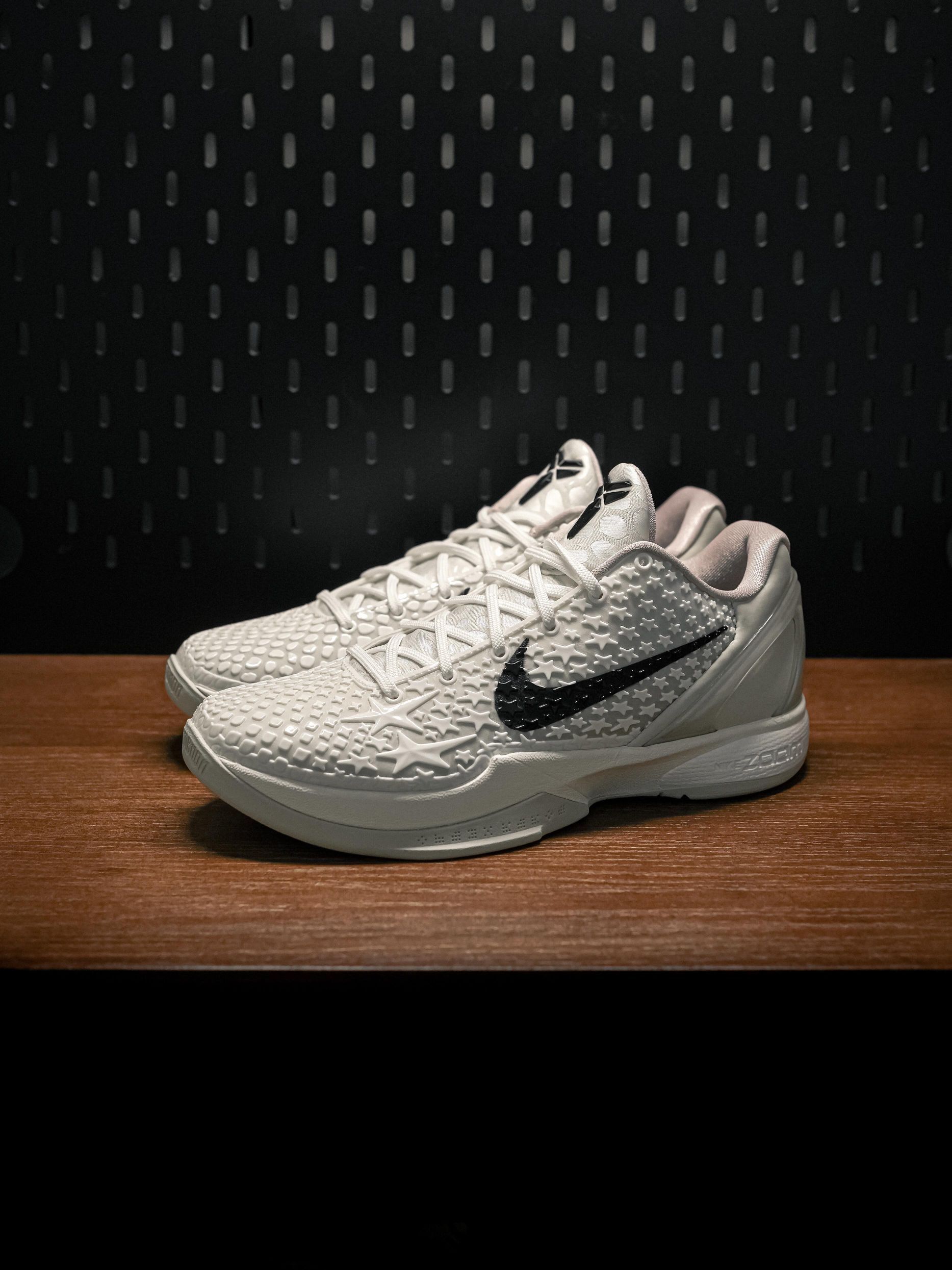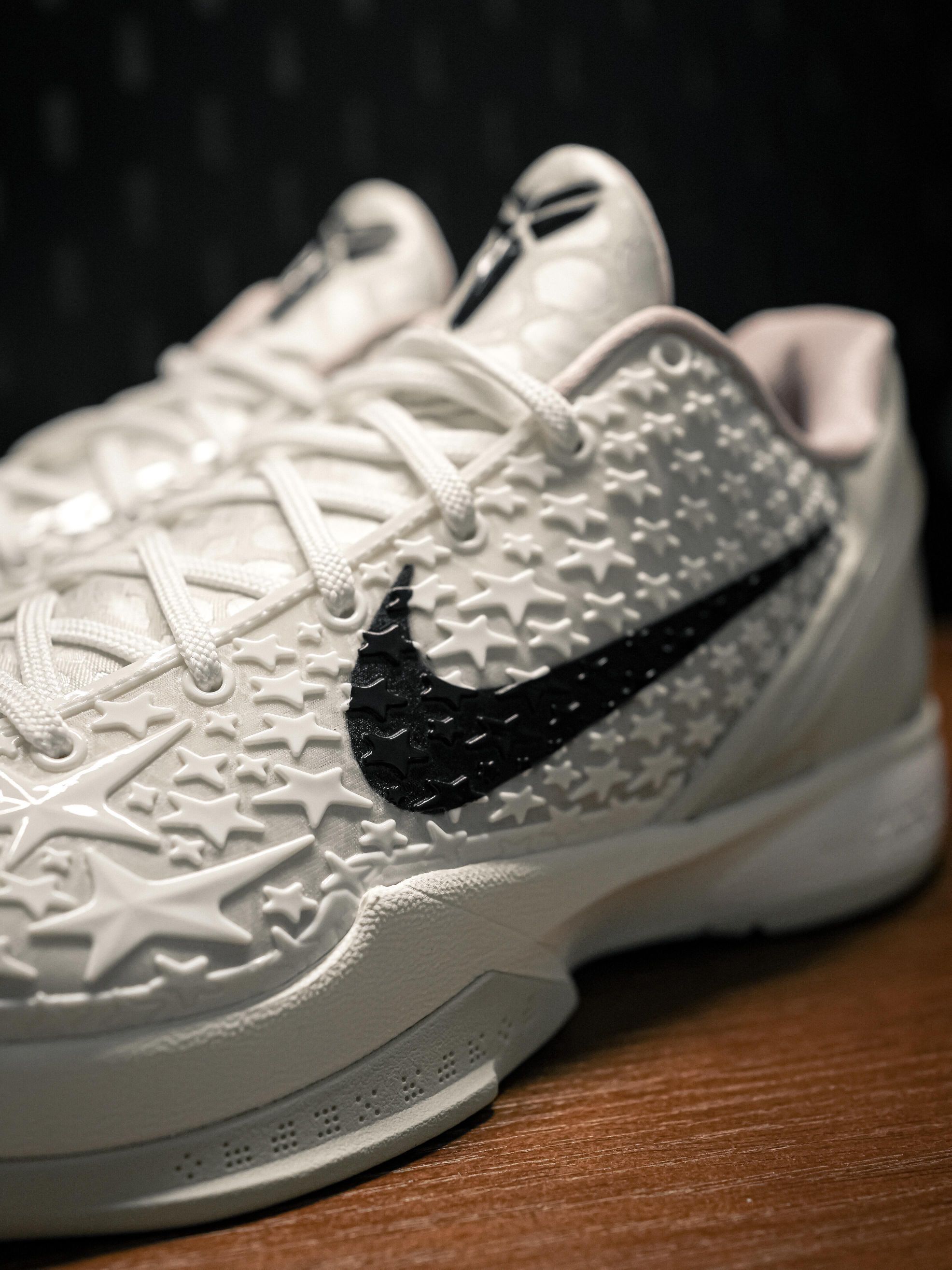 这双是Nike Kobe 6 Protro "White/Black"(也被鞋友称为“白星”配色),是科比经典战靴的复刻版本。 鞋面延续了科比6代标志性的“蛇鳞”纹理,这次换成了满布的白色星星压纹,搭配黑色亮面Swoosh和鞋舌处的科比个人Logo,细节里全是情怀——星星元素既呼应了科比“曼巴精神”的璀璨,也让这双鞋在简约白里多了几分梦幻感。 中底搭载了Zoom气垫,延续了原版的场地感和反...
