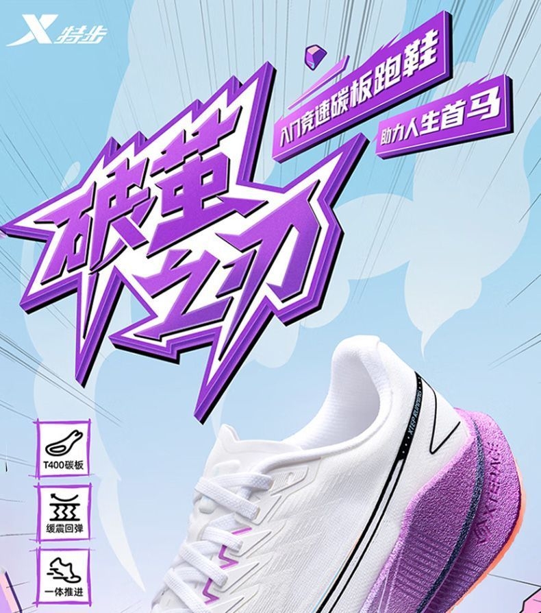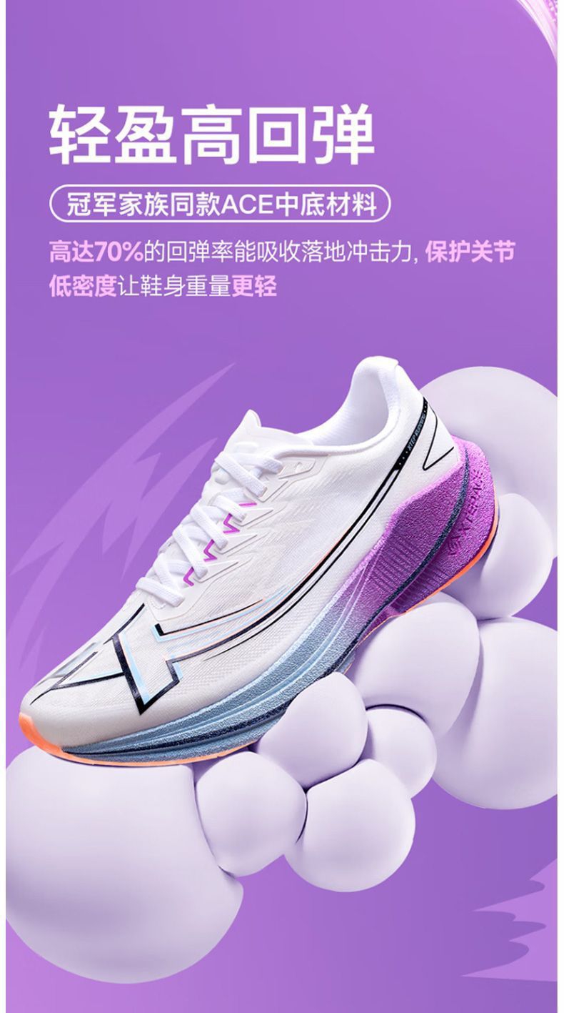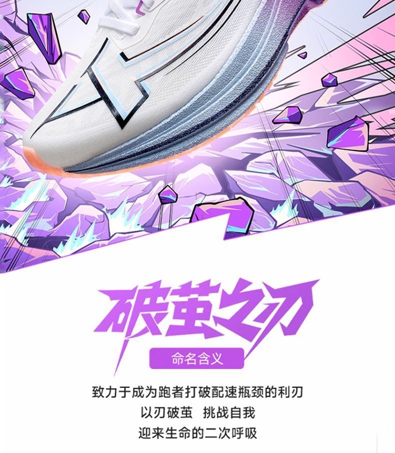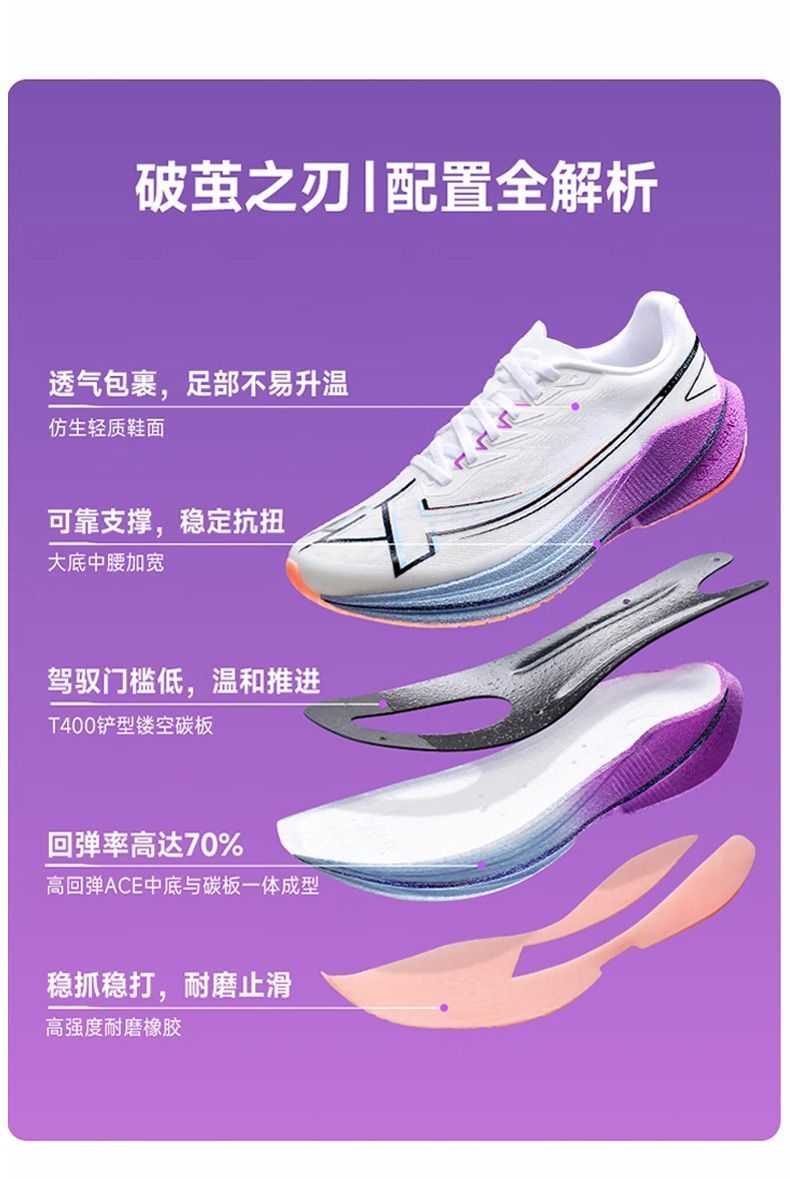 被“破茧之刃”的名字戳中,果断入了特步这双紫白配色的跑鞋——拿到手就惊了:鞋身渐变紫+流线型设计,搁鞋架上都像个潮玩摆件,摸着手感也比同价位跑鞋扎实。 今天晨跑穿它冲了5公里,本来怕新鞋磨脚,结果上脚裹脚感刚好,足弓处的支撑很贴腿,每一步蹬地都能感觉到鞋底的缓震回弹,跑完膝盖居然没往常的酸胀感。鞋面是透气网布,大冬天跑出汗,脚底板也没闷得发黏。 后来才知道这是斩获451个马拉松冠军的同款鞋...