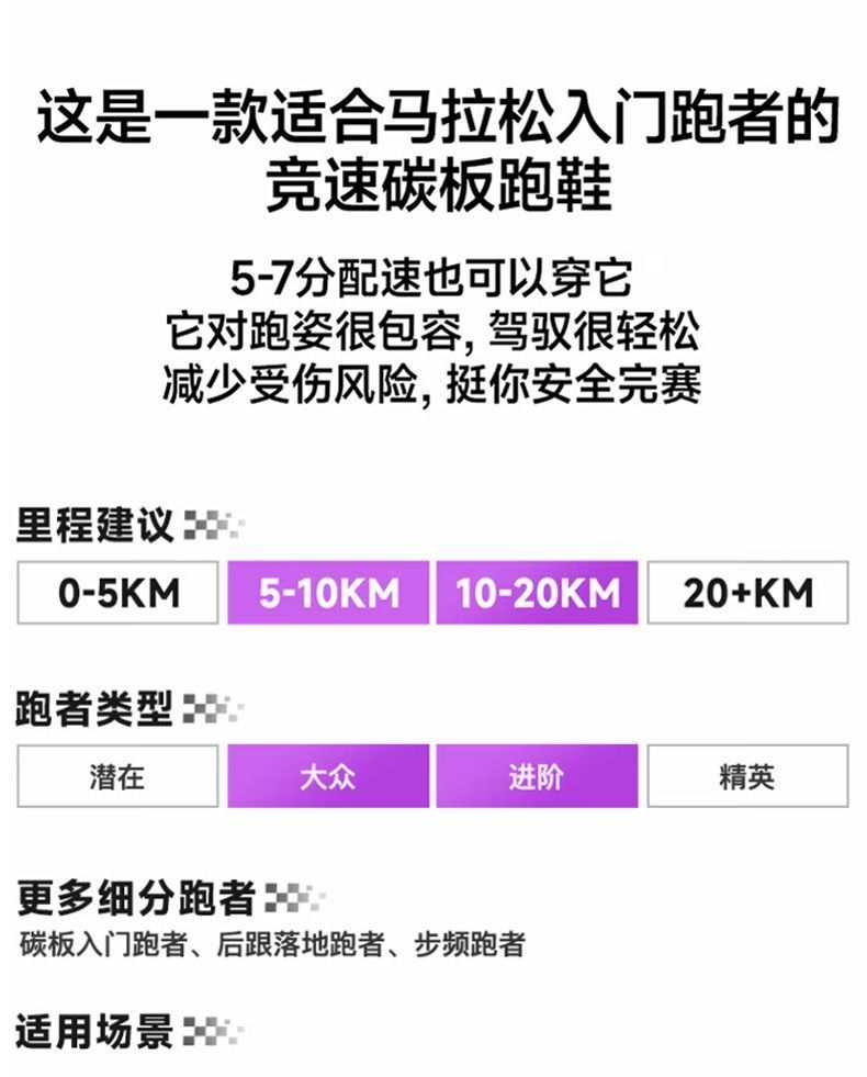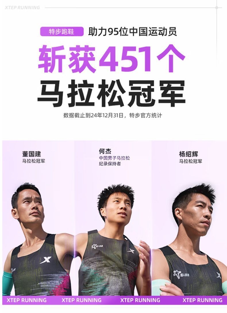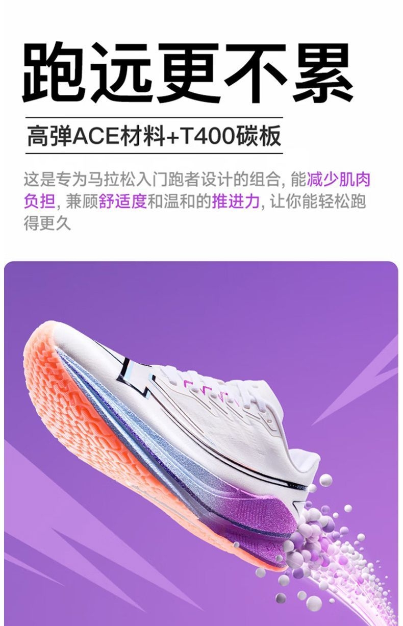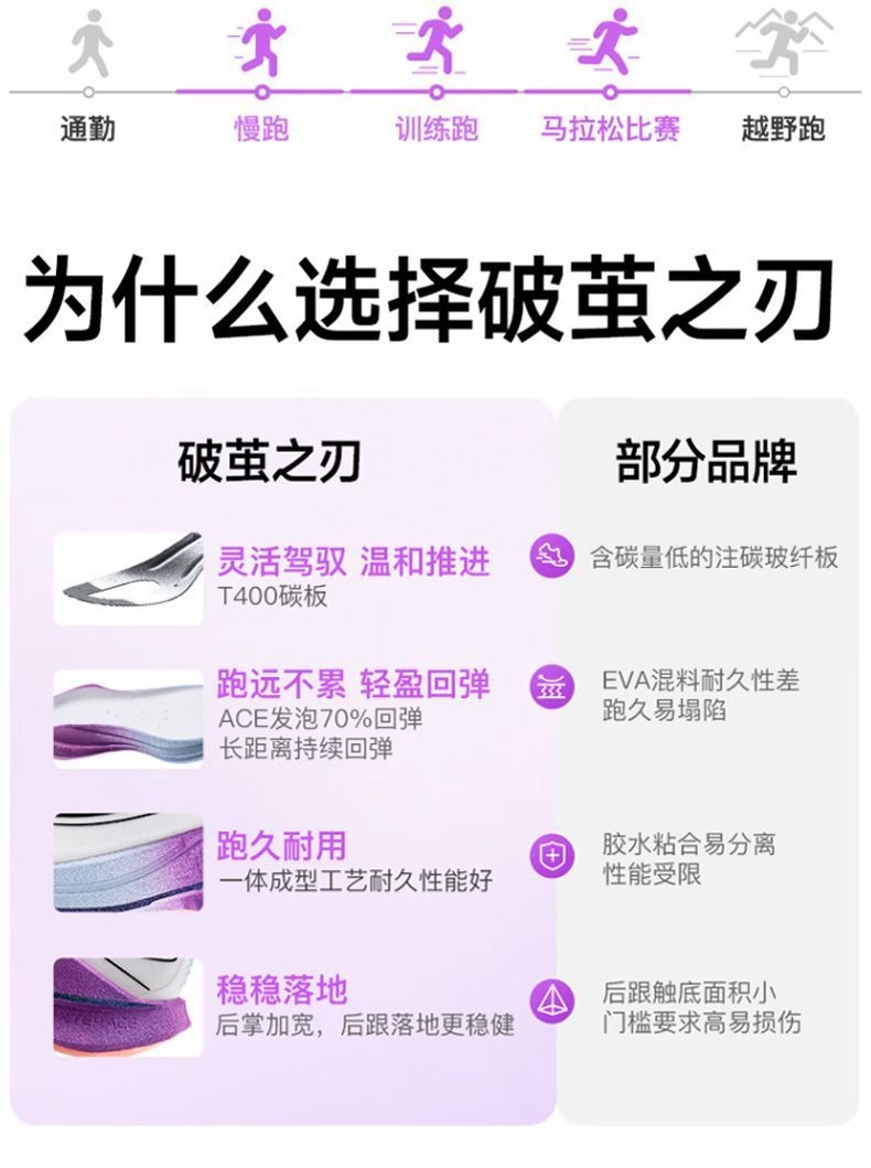 被“破茧之刃”的名字戳中,果断入了特步这双紫白配色的跑鞋——拿到手就惊了:鞋身渐变紫+流线型设计,搁鞋架上都像个潮玩摆件,摸着手感也比同价位跑鞋扎实。 今天晨跑穿它冲了5公里,本来怕新鞋磨脚,结果上脚裹脚感刚好,足弓处的支撑很贴腿,每一步蹬地都能感觉到鞋底的缓震回弹,跑完膝盖居然没往常的酸胀感。鞋面是透气网布,大冬天跑出汗,脚底板也没闷得发黏。 后来才知道这是斩获451个马拉松冠军的同款鞋...