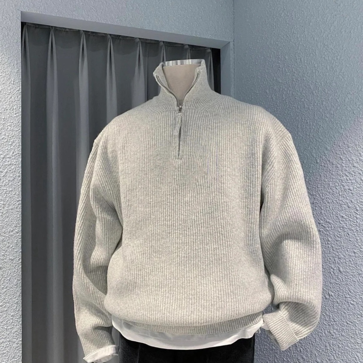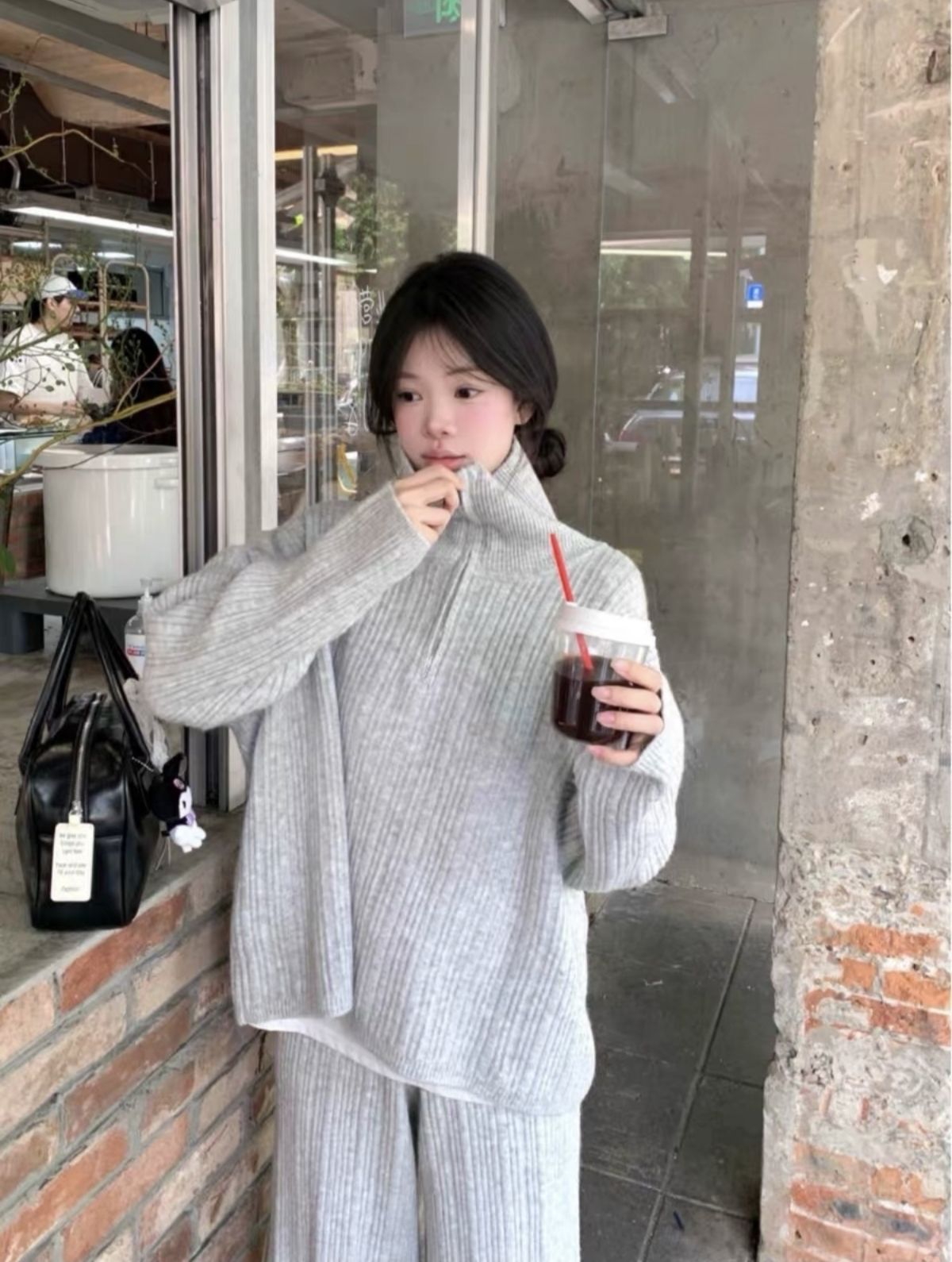 以舒适为宗旨,浅灰色半拉链针织上衣, 触感细腻,搭配宽松阔腿裤 ,让身体告别束缚, 每一步都迈得自在又惬意,诠释慵懒时尚美学。