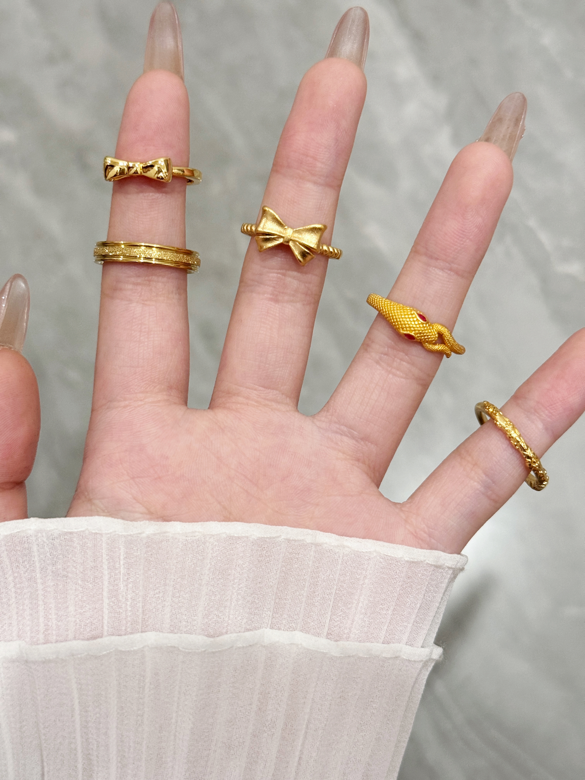 最近被中国黄金的新款戒指美到失语—— 不是刻板印象里的老气款式,是带着蝴蝶结、小蛇这些灵动设计的轻甜黄金戒! 细细的戒圈裹着足金的光泽,叠戴在手上像给指尖缀了层碎金✨ 蝴蝶结款软萌又精致,小蛇款带着点冷艳灵动感,单戴清爽、叠戴华丽,日常配T恤或约会穿小裙子都能搭。 关键是足金材质保值又有质感,戴出去既有“小金饰”的贵气,又不会显得刻意厚重~