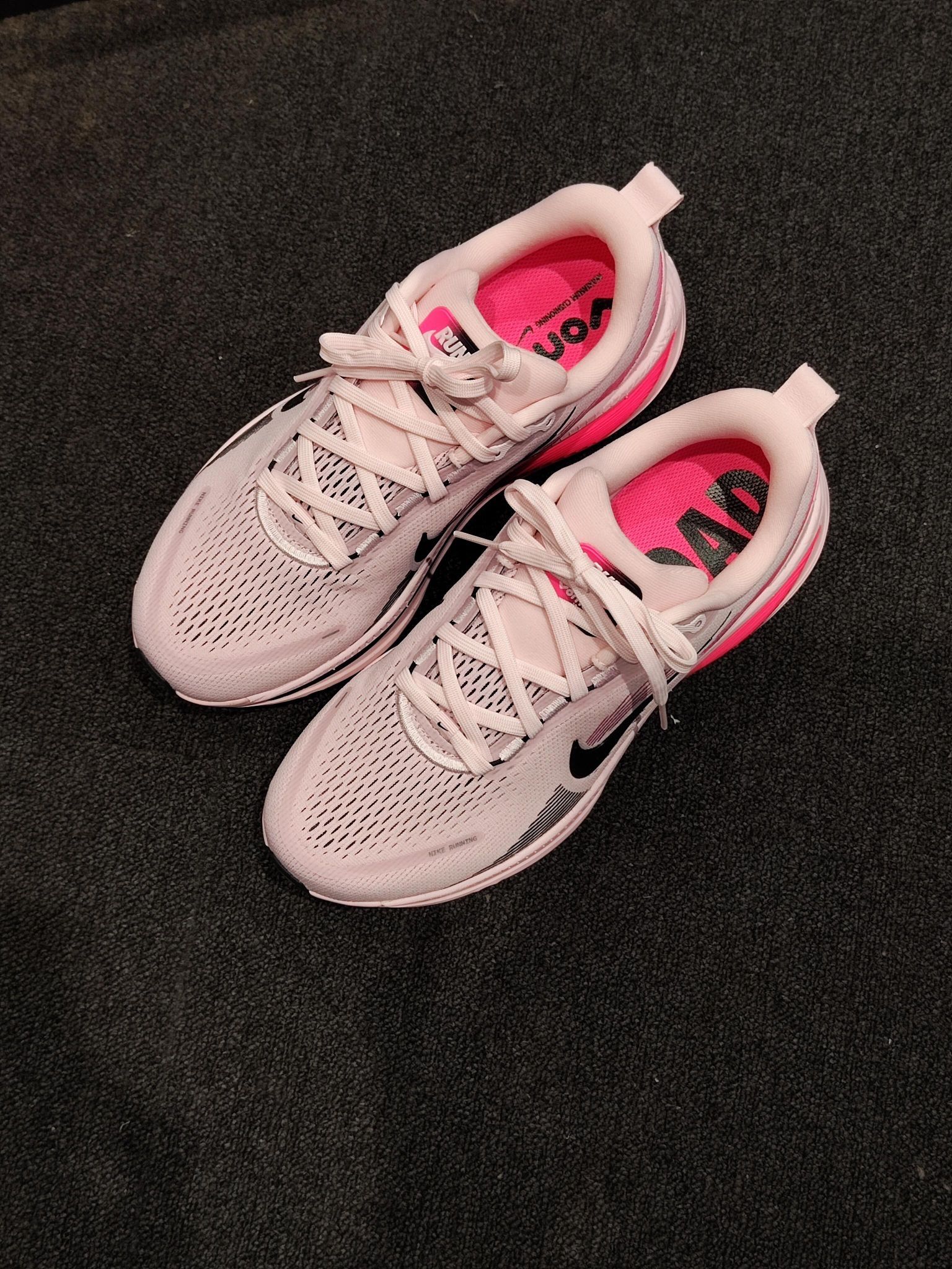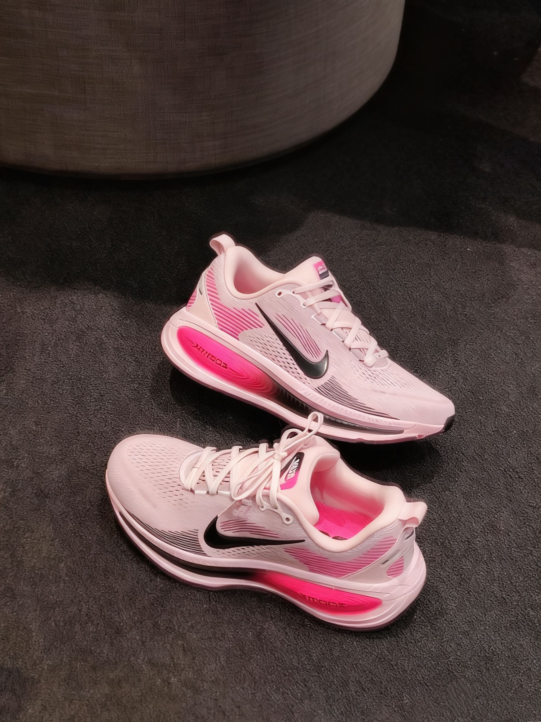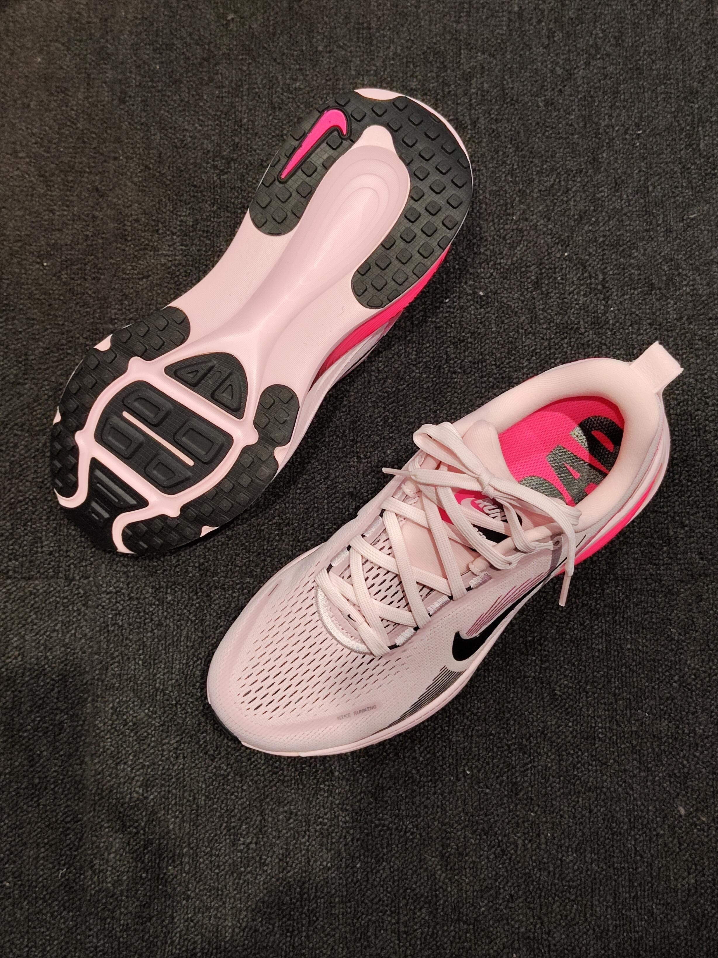 ✅ 核心亮点 1️⃣ 色彩密码:淡粉主调邂逅黑粉撞色钩,3M反光纱线暗藏星耀效果 2️⃣ 细节彩蛋:鞋舌RUN字样采用温变油墨,运动时逐渐显现 3️⃣ 透气系统:激光穿孔网面搭配动态编织技术,实测散热效率提升50% 🔥 穿着体验 ・ 全掌ZoomX泡棉实现公里级持续回弹 ・ 足弓碳纤维板在配速4‘30“时触发推进效应 ・ 鞋口记忆棉完美解决磨踝骨痛点