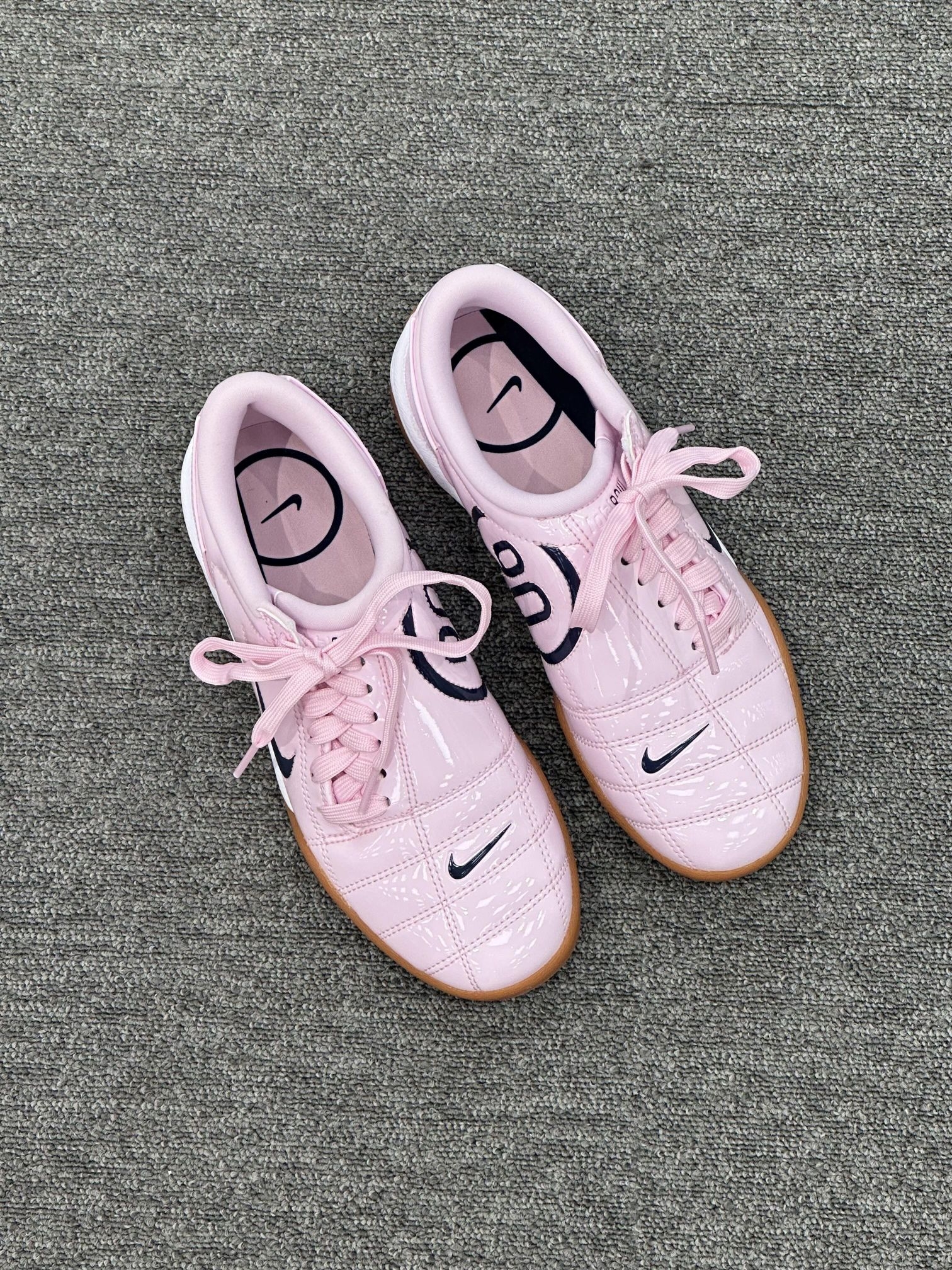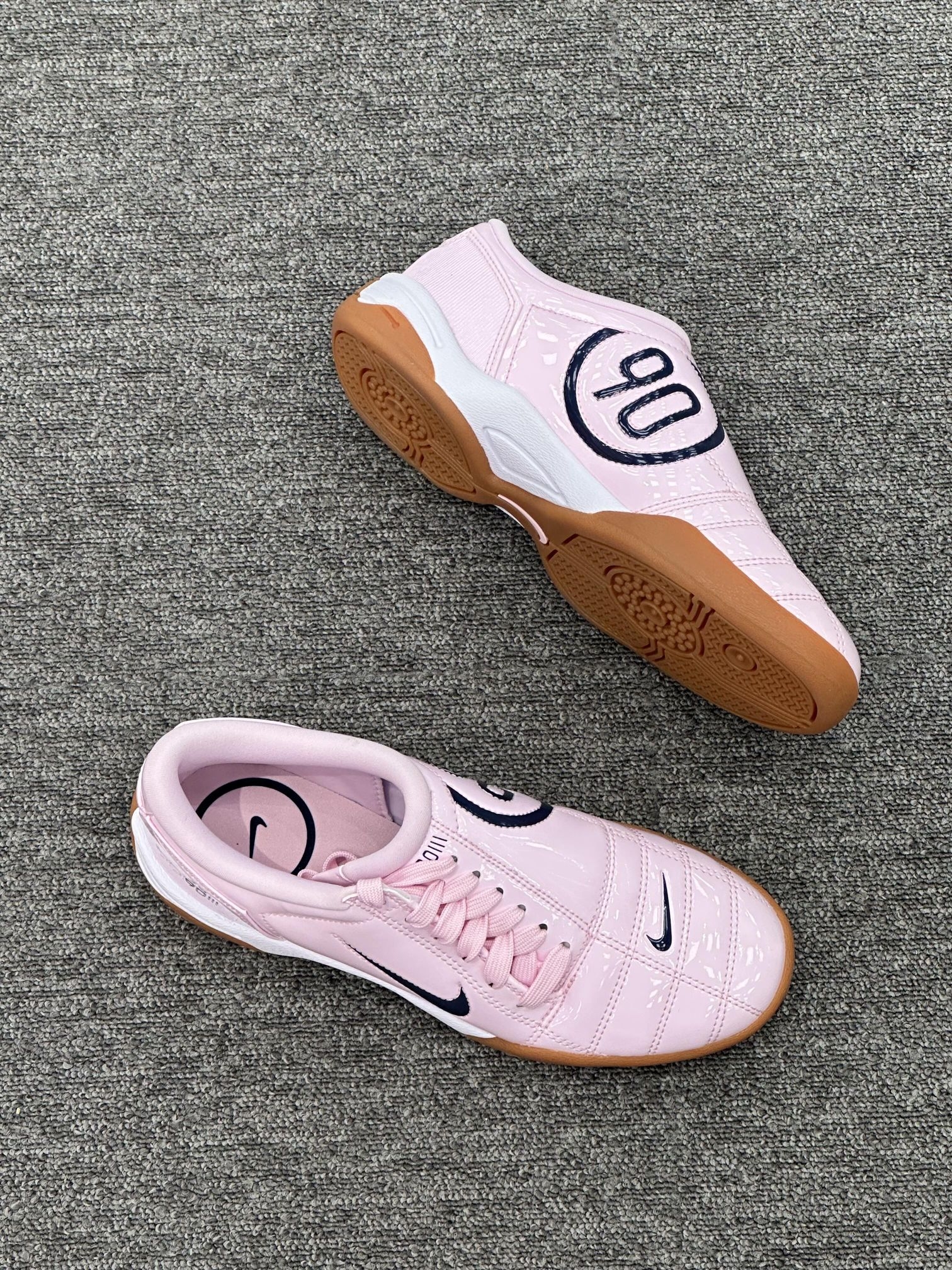 ✅ 核心亮点 1️⃣ 甜酷美学:漆皮粉搭配黑色勾边,3M反光条暗藏赛道基因 2️⃣ 实战性能:亮面合成革提供270度包裹,射门时足部锁定提升20% 3️⃣ 细节彩蛋:鞋侧数字标识采用温感油墨,运动后浮现隐藏图案 🔥 穿着体验 ・ 人造草球场急转测试防滑指数达9.1/10 ・ 鞋舌透气系统在35℃环境下仍保持足背干爽 ・ 后跟记忆棉首次穿着即实现零磨合体验