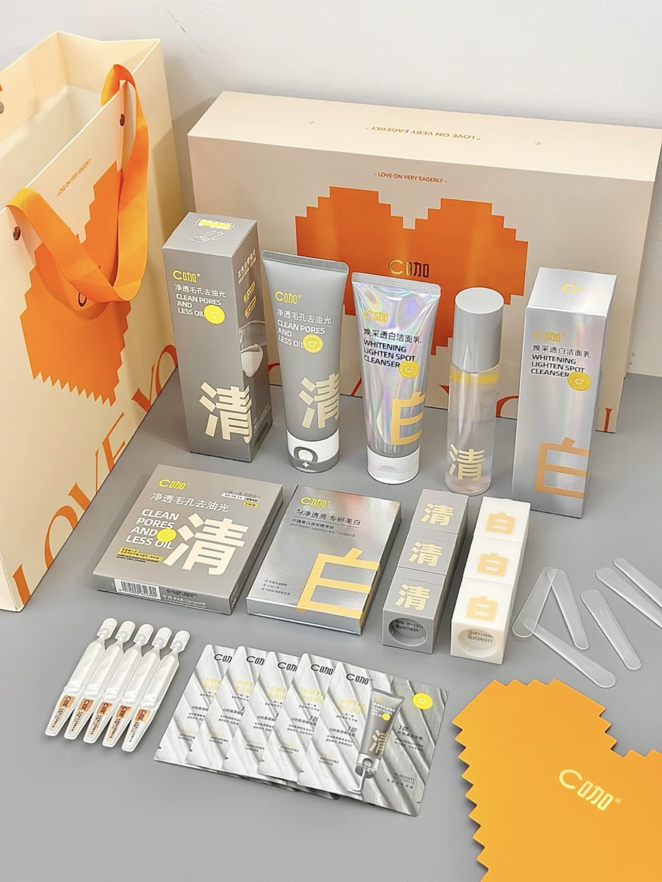 说真的,的确会被礼盒的设计小心思给吸引 到 银色礼盒礼袋设计高级又有质感 打开来里面是水乳和洗面奶 质地都是清爽好吸收类型 还有一张贺卡,可以DIY情话敲击浪漫嘟 还有赠送了小样,出门旅游方便携带 介一套仪式感满满的礼盒 哪个女孩纸会不爱啦