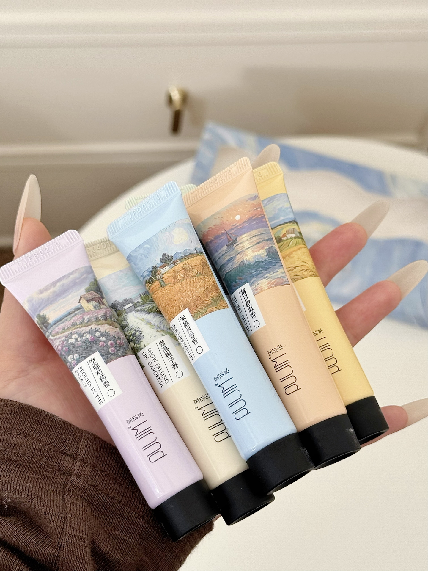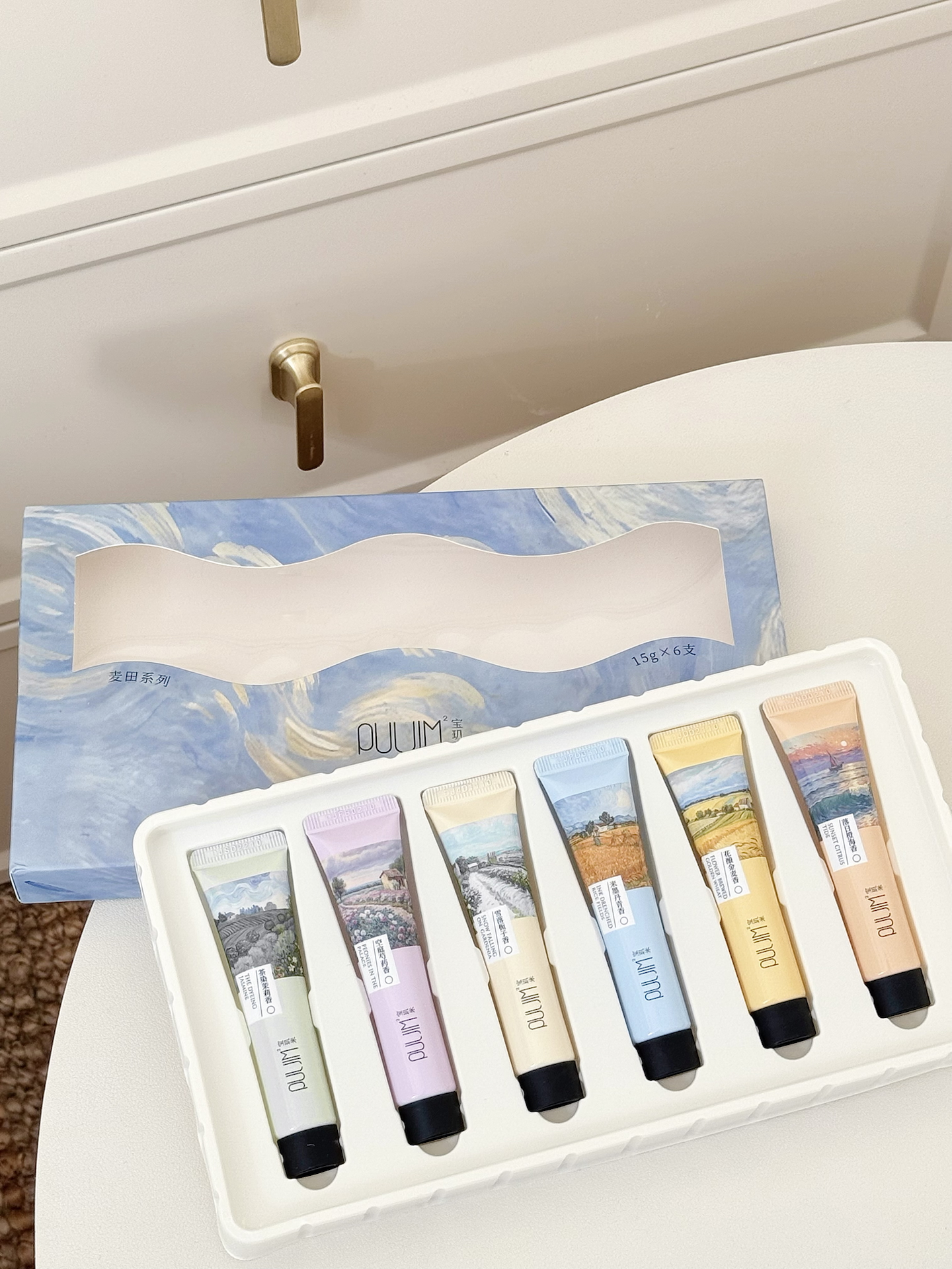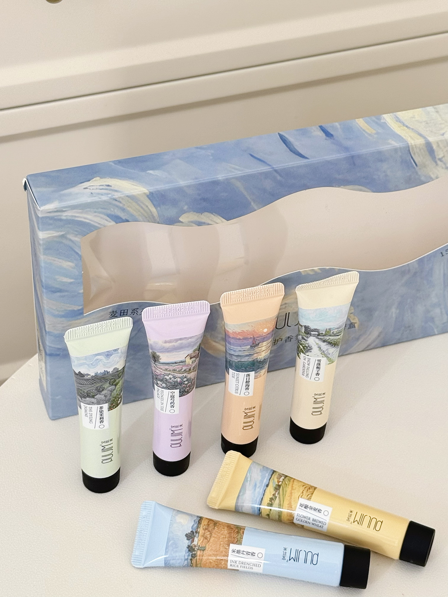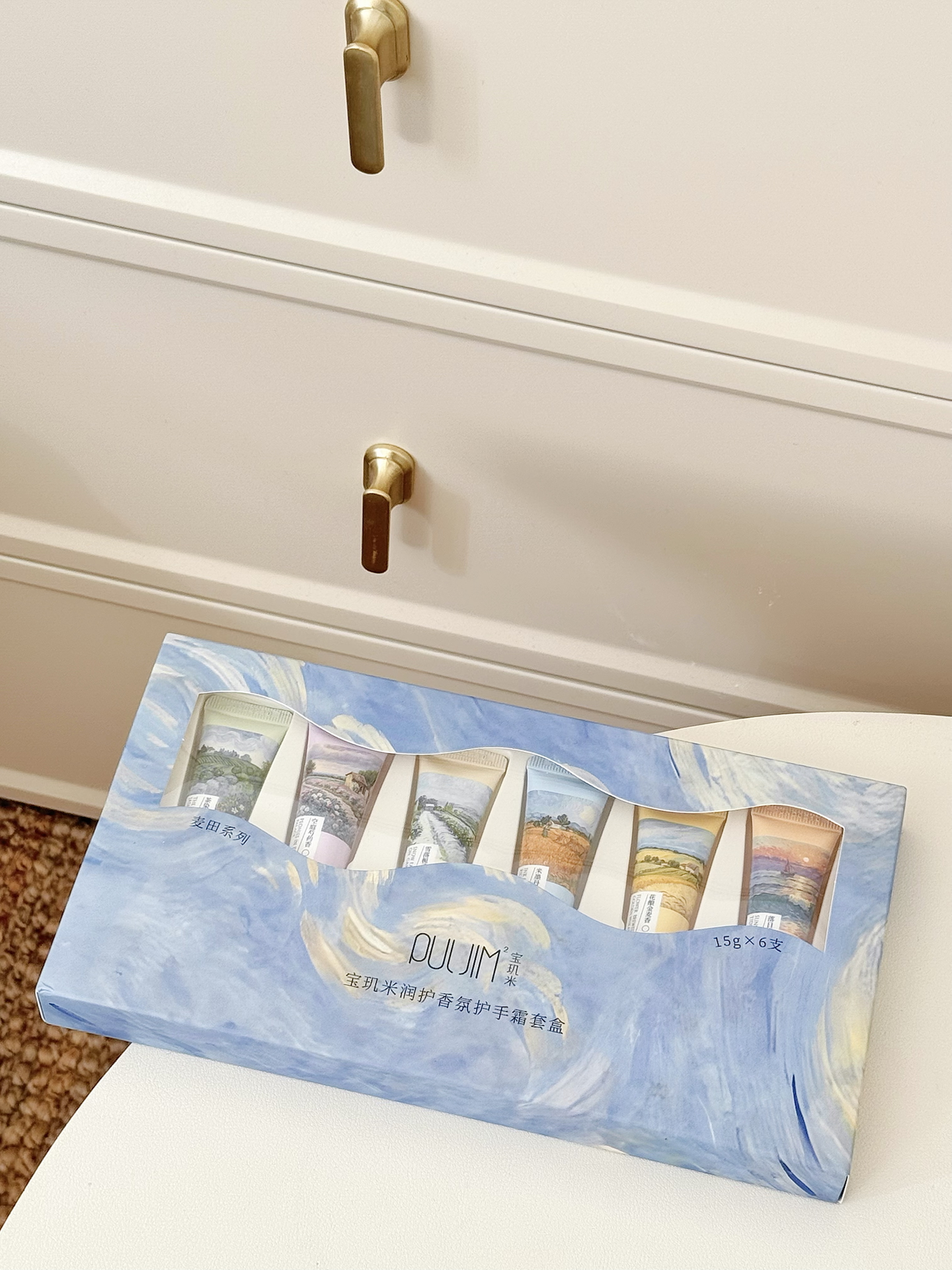 我挖到个护手霜礼盒!6支护手霜6种香调,每次涂都像换了种伪体香~质地滋润但不粘腻,小小支放包里也方便。不过香味持久度一般,补涂频率得高点~小几十能拥有这一套,性价比我觉得还可以🥰