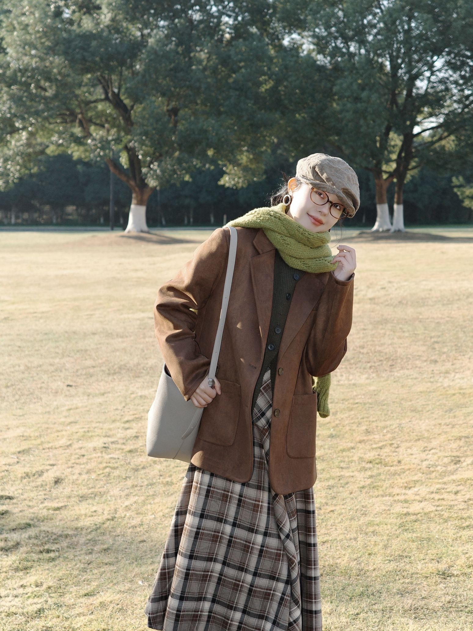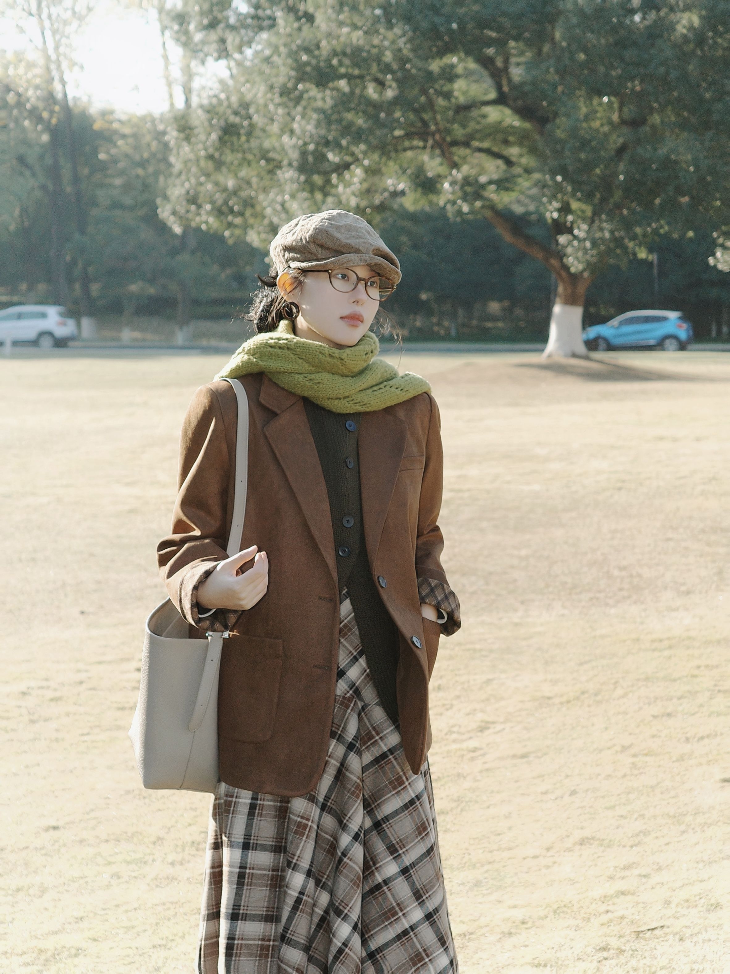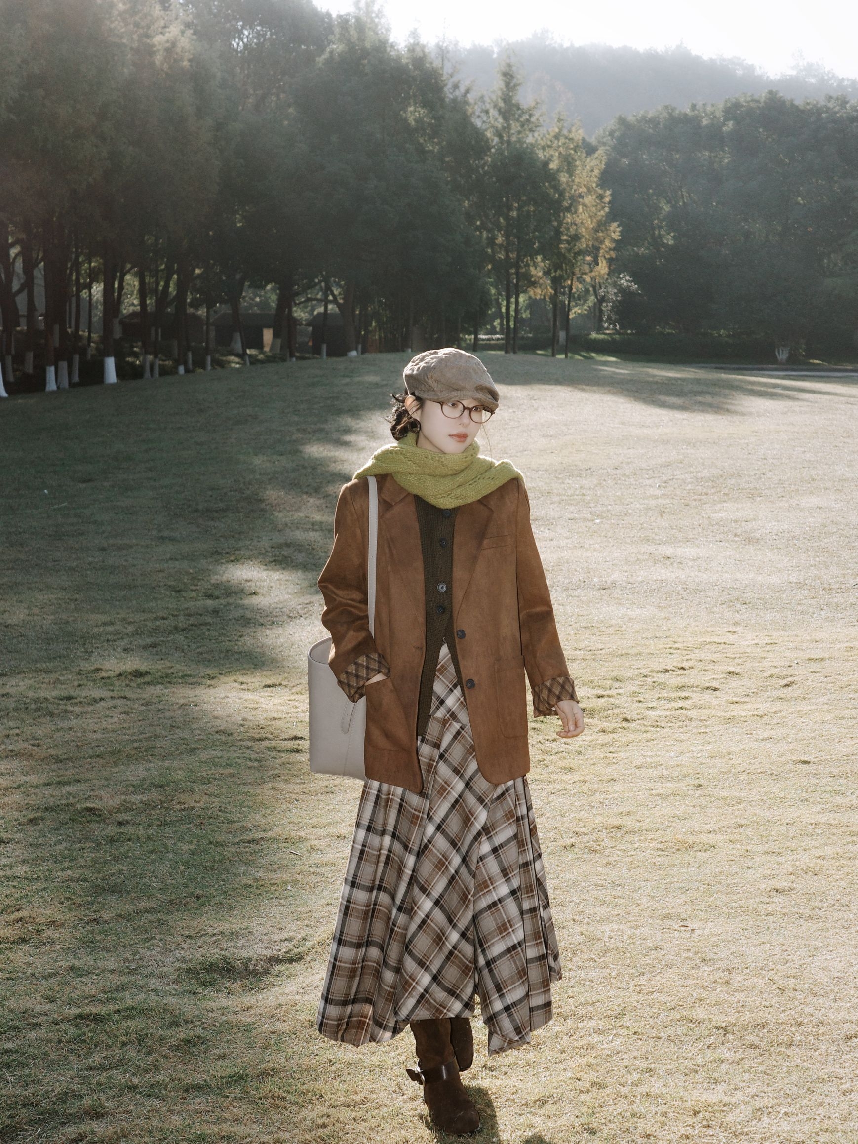 秋日里的焦糖系复古穿搭,把秋日氛围感拉满啦。 焦糖棕的西装外套质感超赞,软乎乎的黄绿色围巾绕在颈间,添了几分温柔的层次感~ 内搭深色针织衫,再配上棕白格纹的连衣裙,复古味儿一下子就出来了。 脚上的棕色短靴和整体色系呼应得刚刚好,再戴一顶报童帽、挎上简约的浅色托特包,暖调大地色系的搭配在秋日的草地上,温柔又慵懒,整个人都融进这秋日的阳光里啦。
