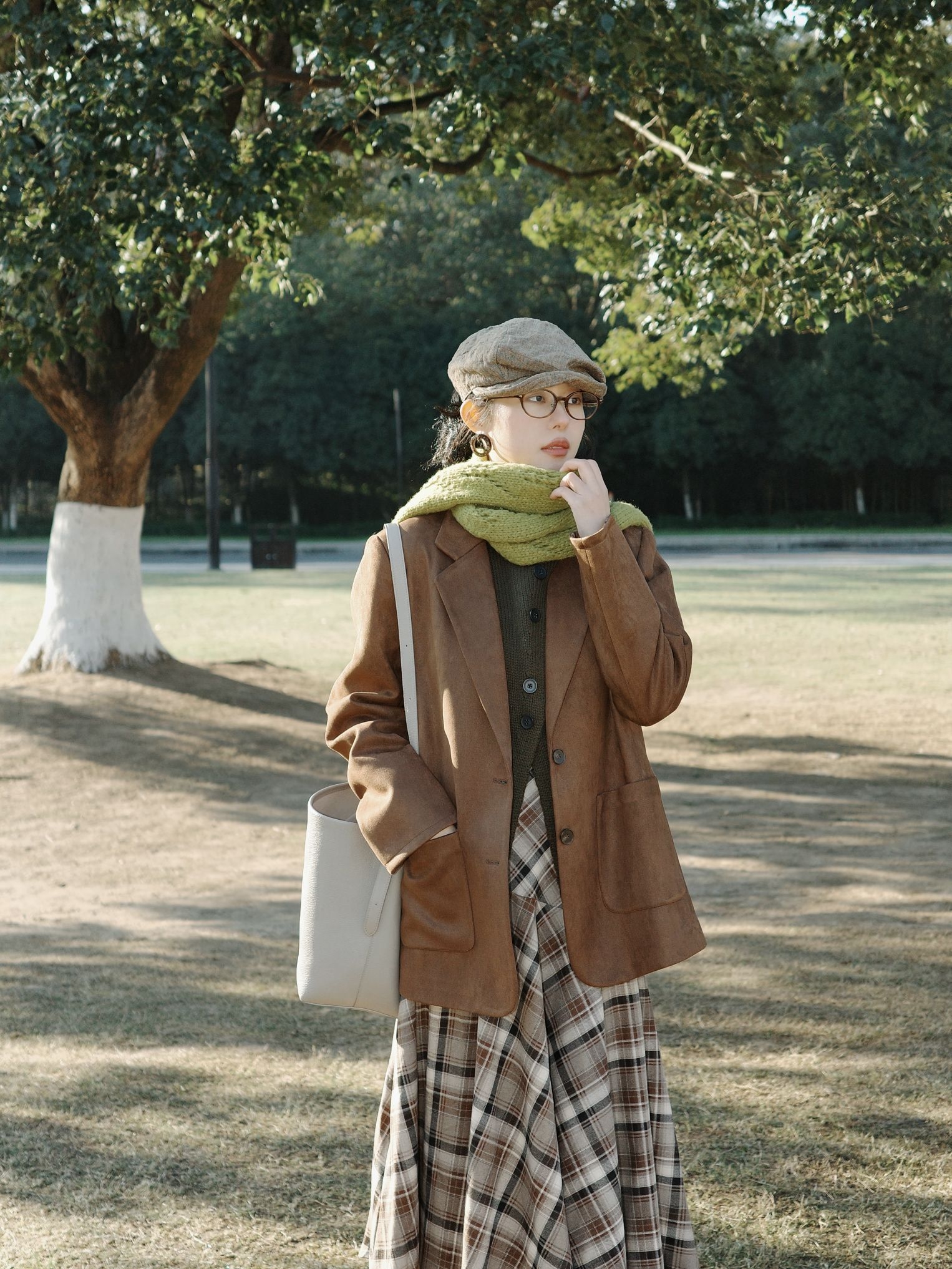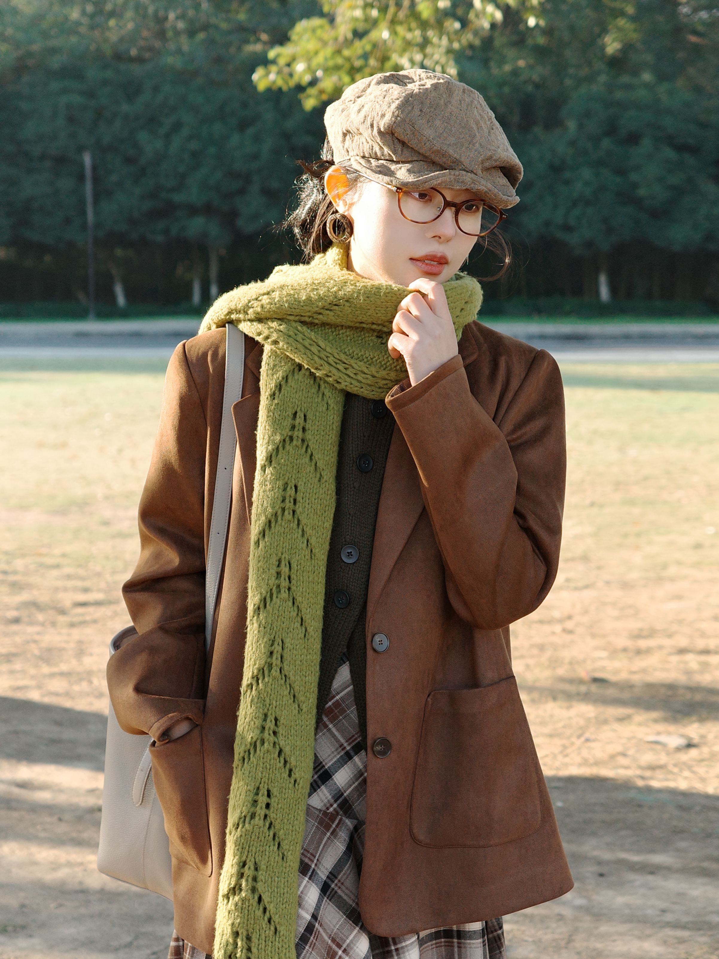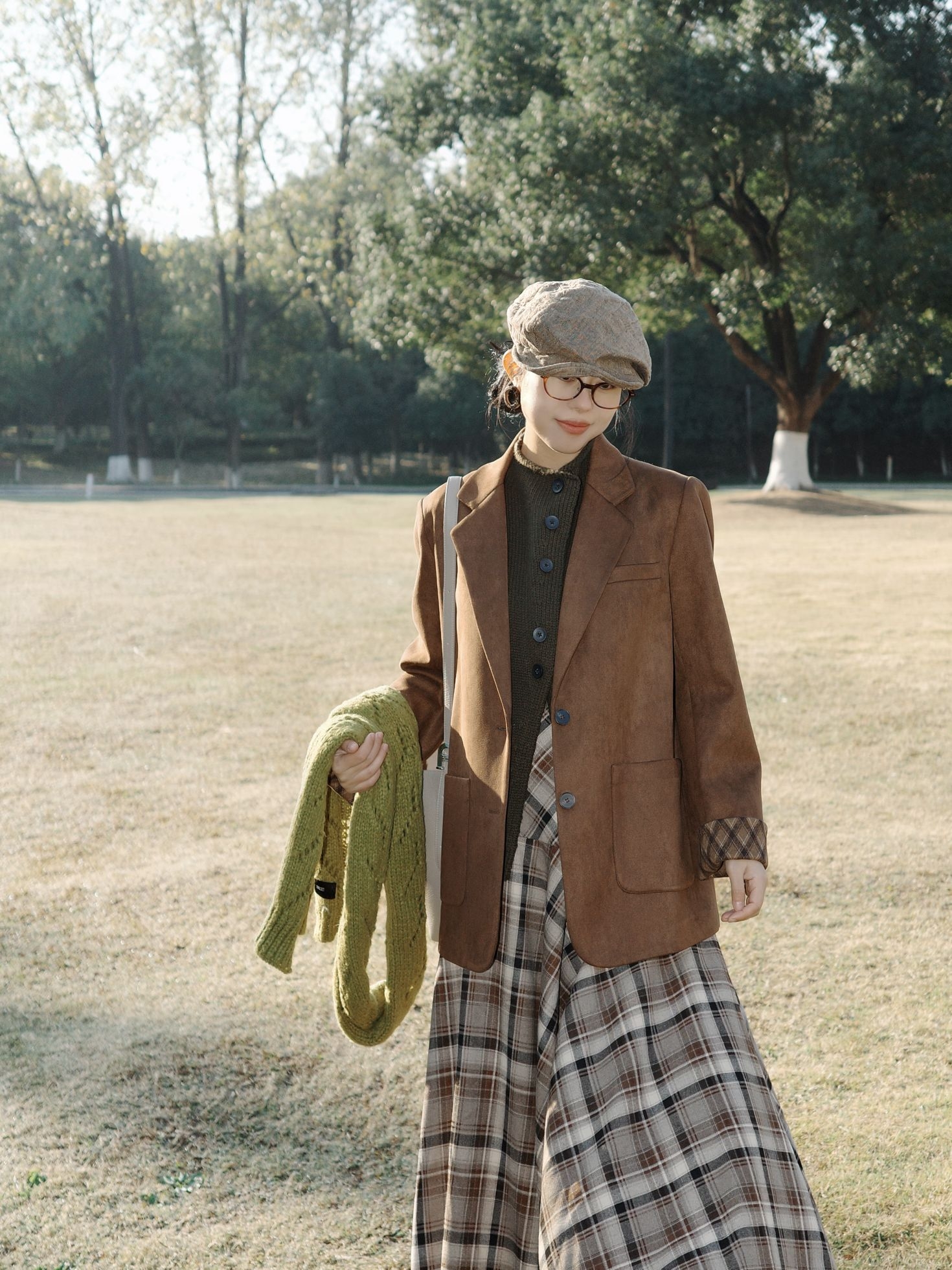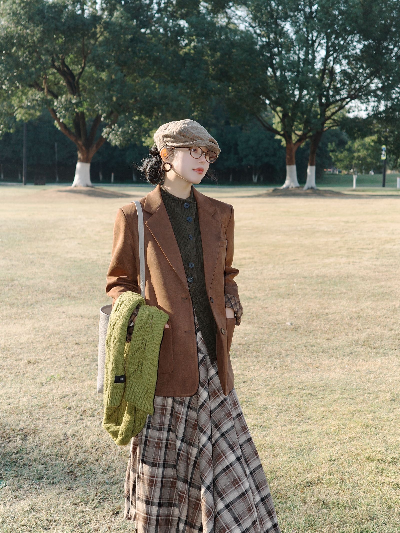 秋日里的焦糖系复古穿搭,把秋日氛围感拉满啦。 焦糖棕的西装外套质感超赞,软乎乎的黄绿色围巾绕在颈间,添了几分温柔的层次感~ 内搭深色针织衫,再配上棕白格纹的连衣裙,复古味儿一下子就出来了。 脚上的棕色短靴和整体色系呼应得刚刚好,再戴一顶报童帽、挎上简约的浅色托特包,暖调大地色系的搭配在秋日的草地上,温柔又慵懒,整个人都融进这秋日的阳光里啦。