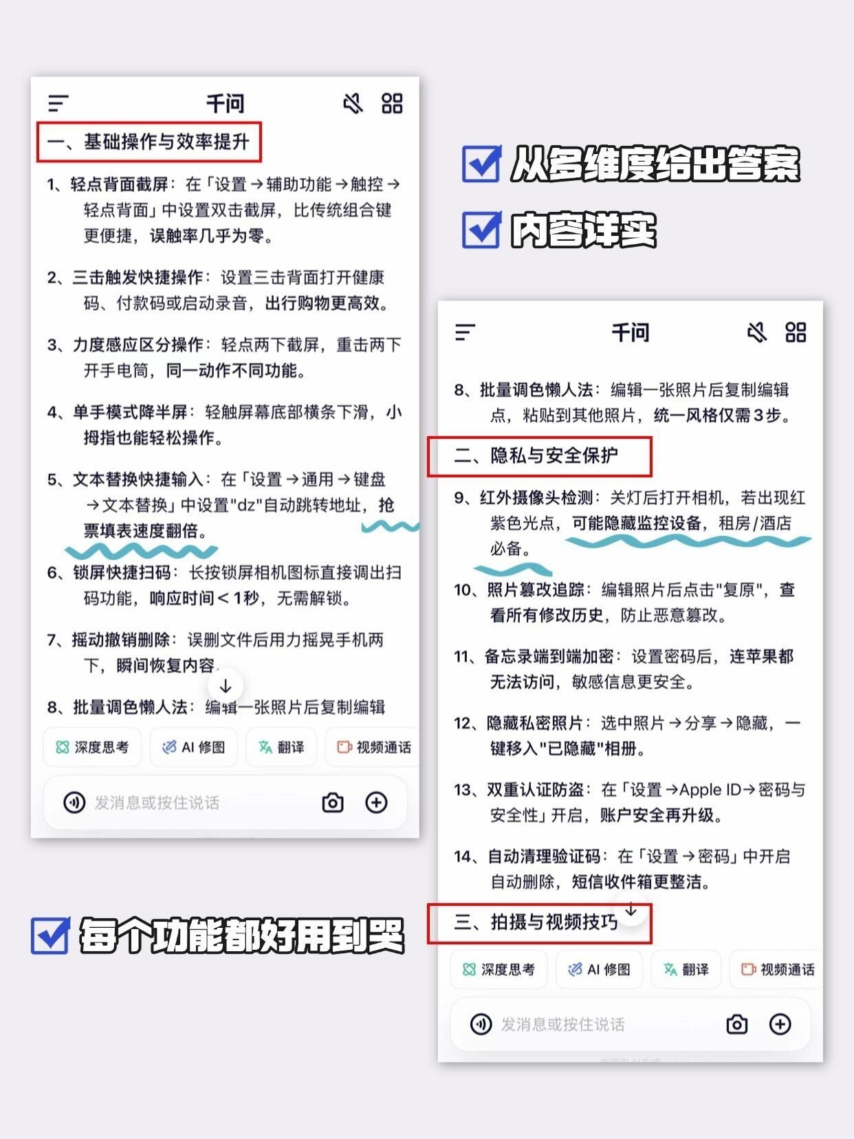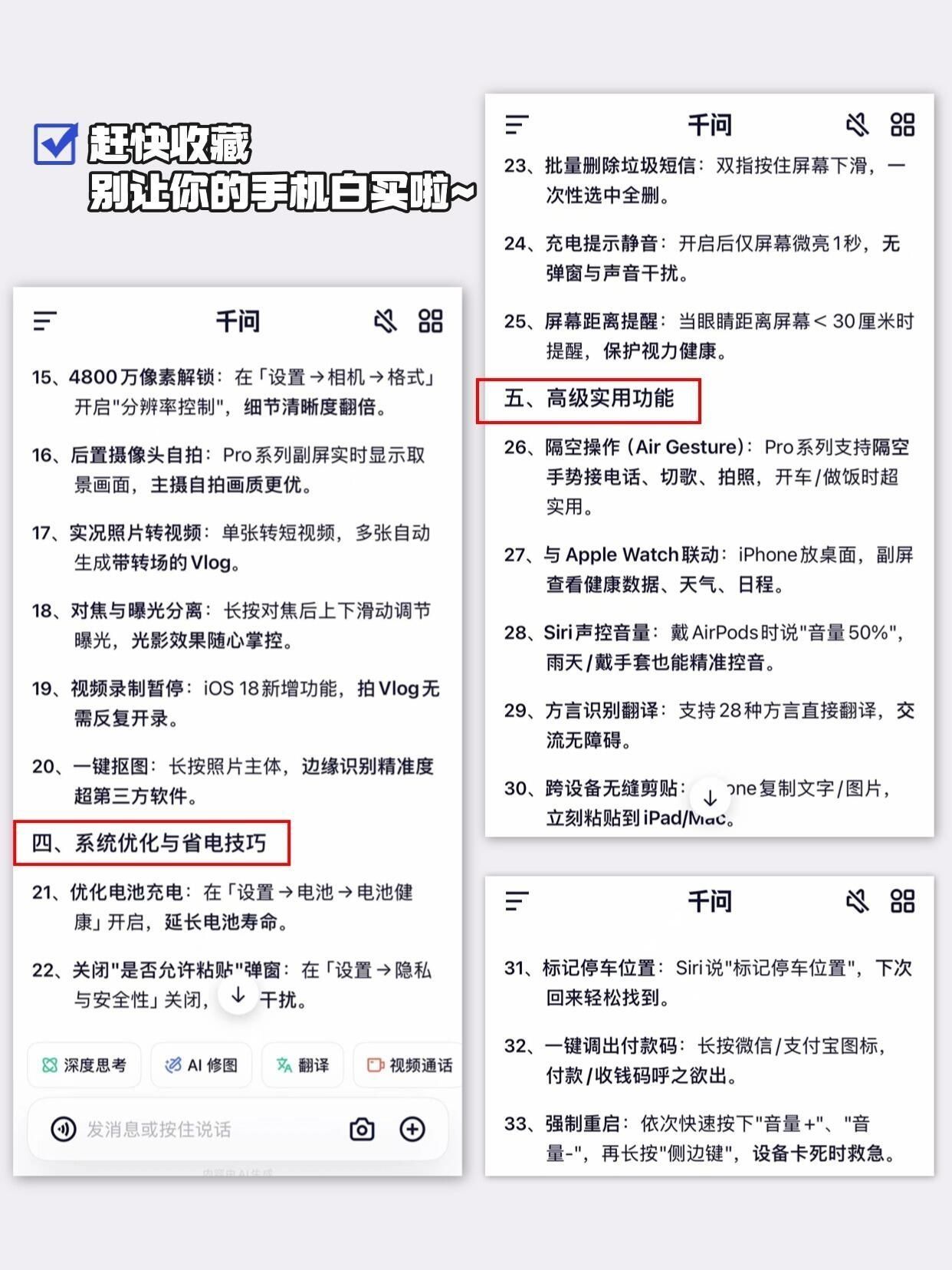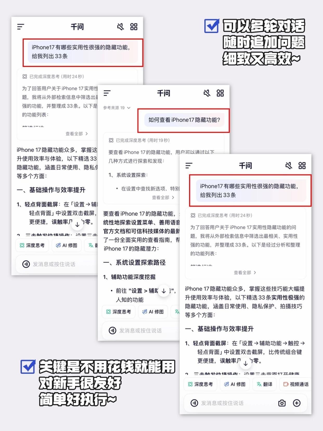 99%的人不知道❗iPhone17的33个隐藏功能|||谁懂啊!买了iPhone17却只用到基础功能,总觉得白花了钱😤 刷遍全网找隐藏玩法,不是步骤太复杂,就是教程零散没重点,新手看了直接劝退… 直到被千问狠狠拿捏!0元就能解锁全攻略,纯小白跟着操作也不踩坑,友好度拉满💥 它搭载了阿里Qwen最新最强的闭源模型,不用费劲搜关键词,直接用大白话跟它唠需求,比如 “iPhone17提升效率的隐藏功能”...