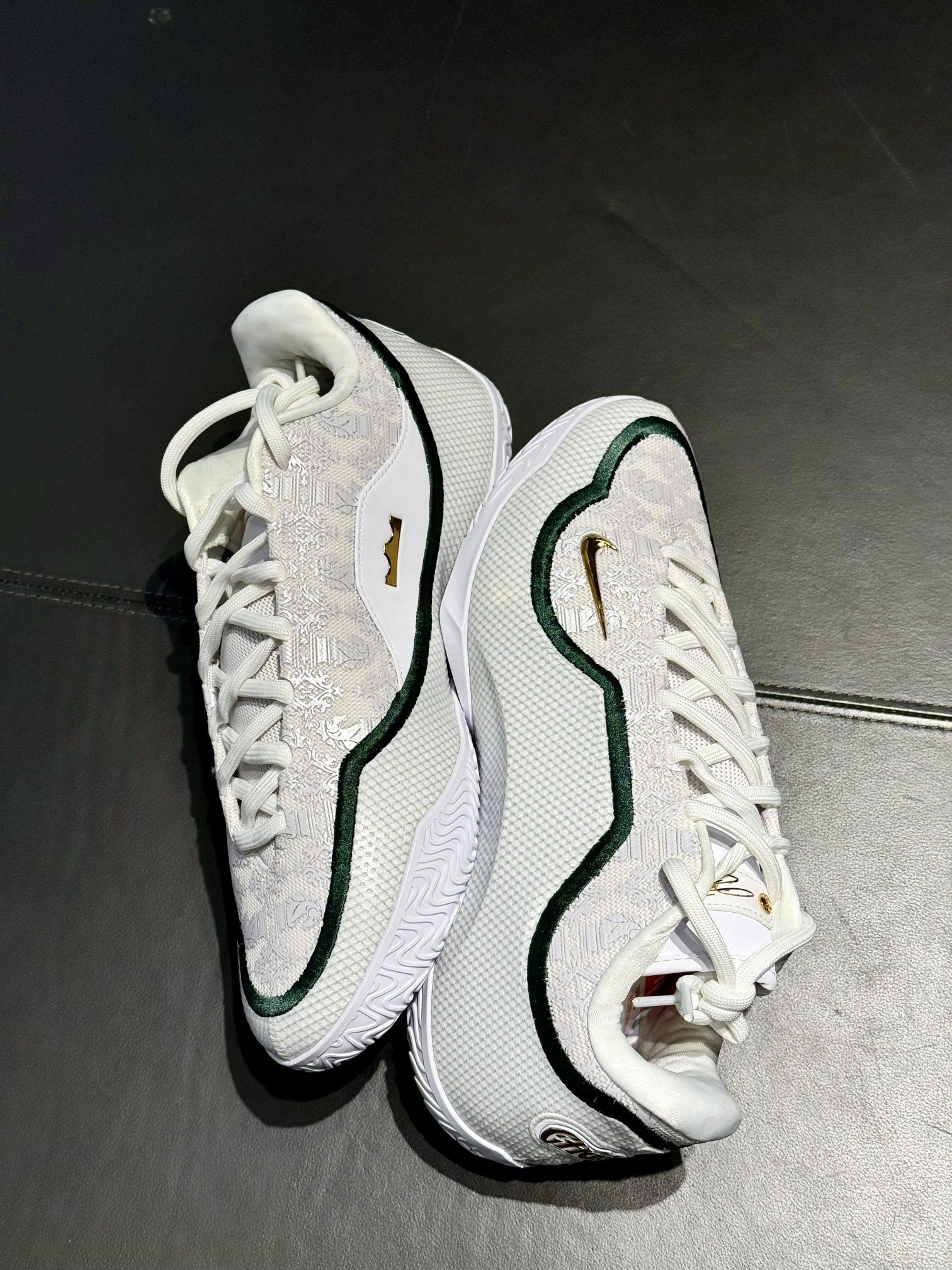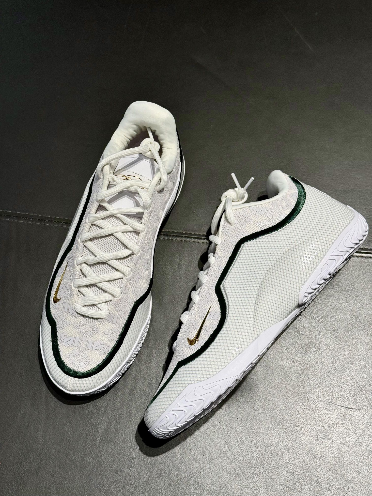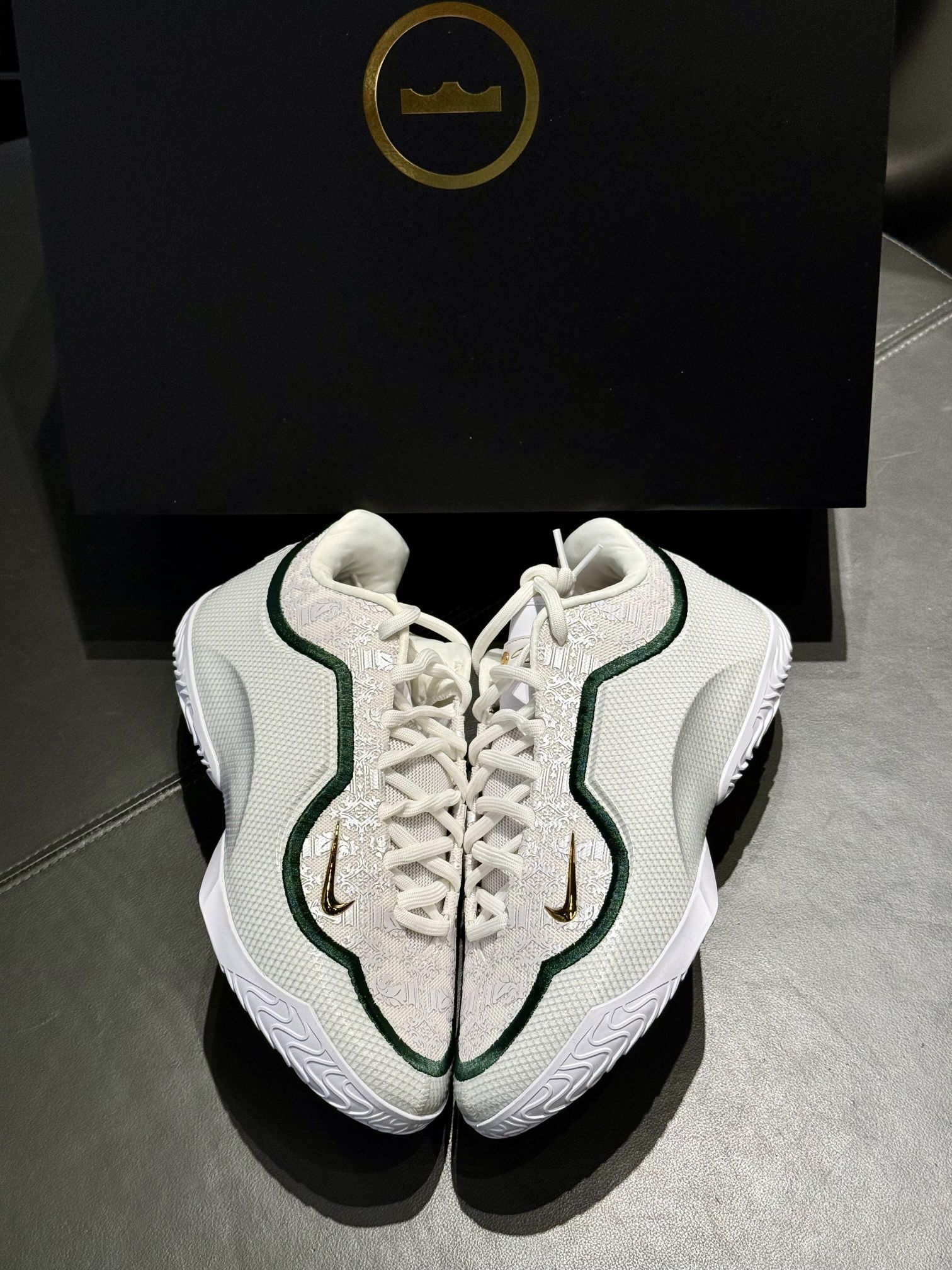 ✅ 核心亮点 1️⃣ 传奇配色:纯白鞋面搭配SVSM绿金细节,复刻2003年封面战靴原色 2️⃣ 珍藏细节:后跟烫金"CHOSEN 1"字样,鞋垫印有阿克伦地图坐标 3️⃣ 性能配置:全掌Zoom Air叠加后跟Max Air,缓震系统延续勒布朗系列基因 🔥 设计故事 ・ 鞋舌暗藏SVSM校徽浮雕,致敬传奇起点 ・ 外侧Swoosh采用军校勋章造型设计 ・ 中底碳板刻有选秀夜日期彩蛋