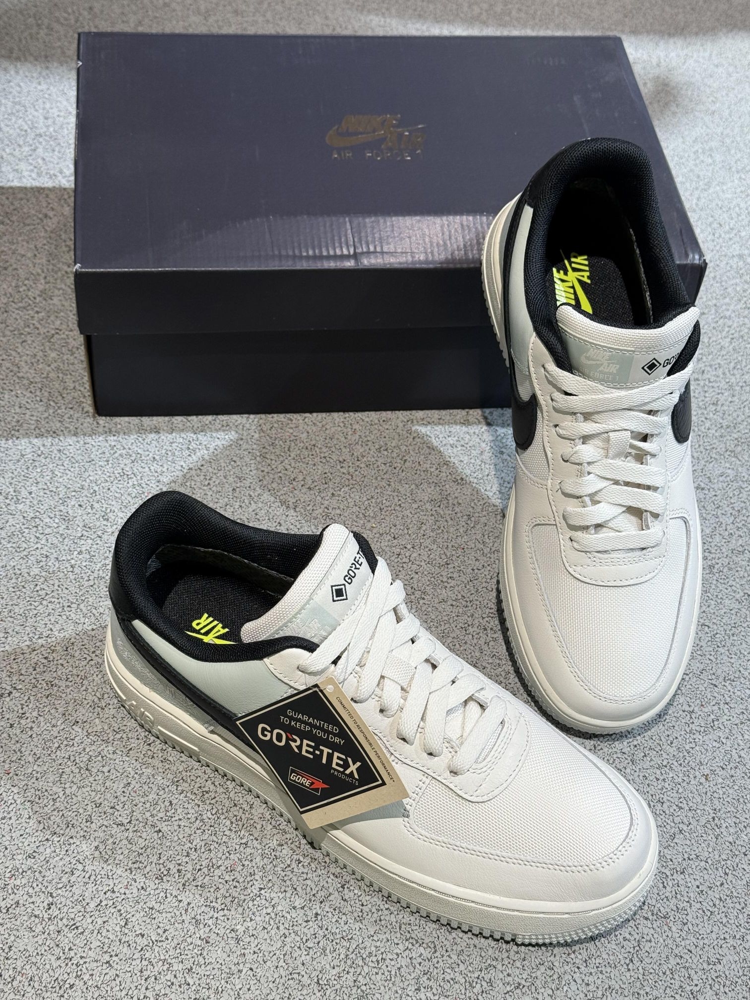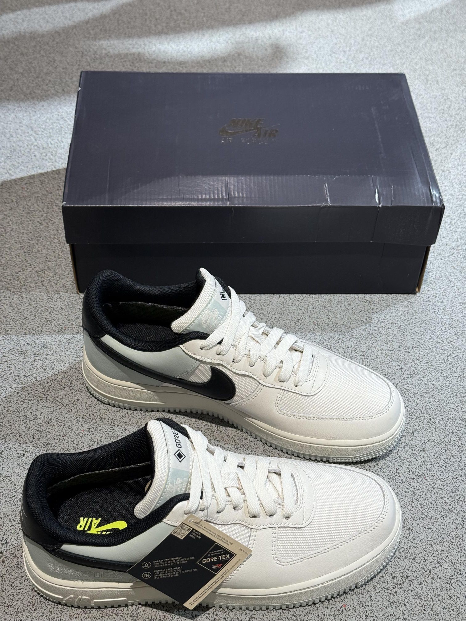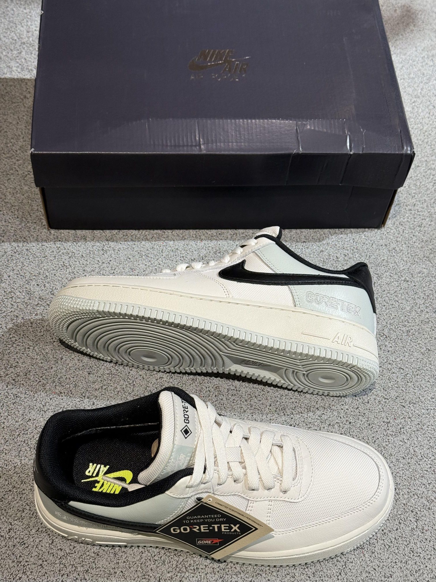 ✅ 核心亮点 1️⃣ 防水科技:Gore-Tex薄膜层有效阻隔雨水,鞋缘压胶工艺确保全方位防护 2️⃣ 质感配色:白灰渐变鞋面搭配磨砂黑Swoosh,呈现高级雾面效果 3️⃣ 实用设计:防滑锯齿外底+加深导流槽,应对湿滑路面更从容 🔥 穿着体验 ・ 细雨天气实测内部湿度始终保持在15%以下 ・ 复合网眼内衬在10℃环境下仍保持透气性 ・ 加硬后跟模块在通勤步行中提供足够支撑