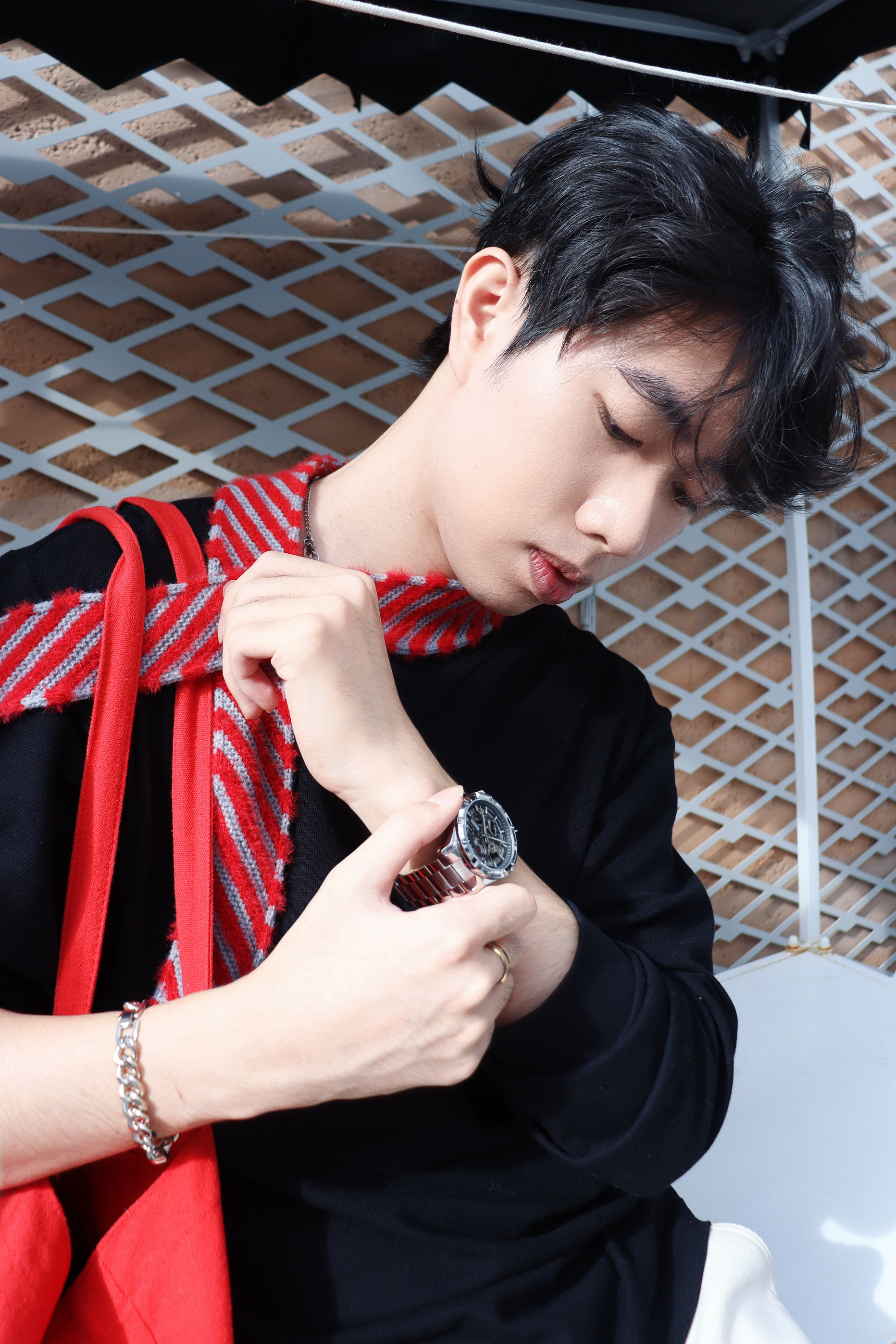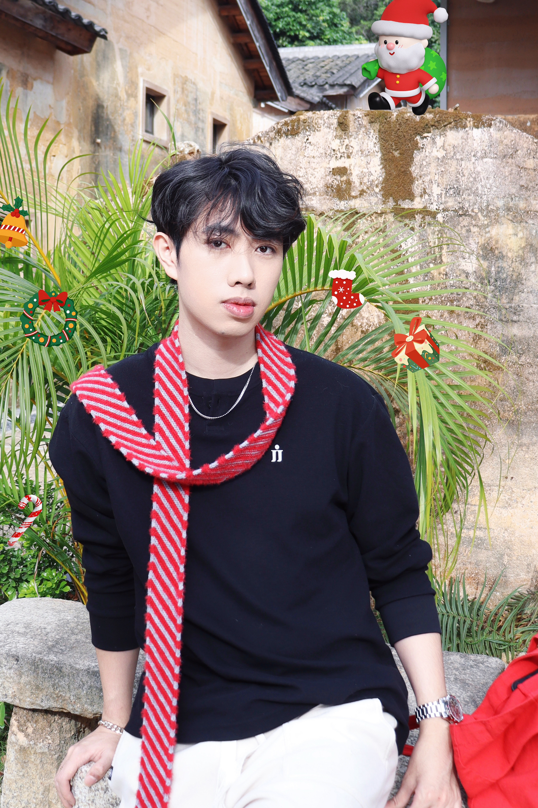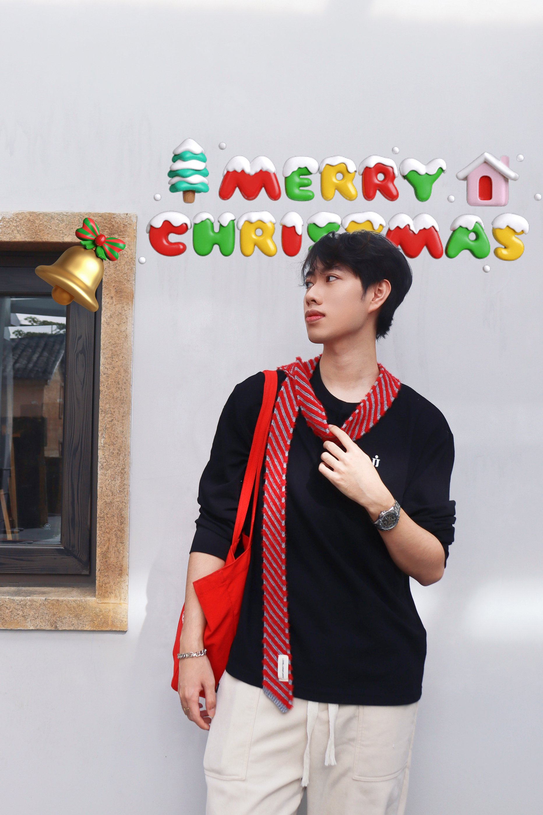 🧍♂️圣诞氛围气氛组+松弛感冬日boy ✨ 不穿成圣诞树,但要把圣诞“揣”在身上的低饱和节日风~ 👔上衣:一件基础款黑色廓形长袖T恤打底,软乎乎但不松垮,搭了条红灰细条纹小围巾!圣诞感直接从“无”变“有”🎄 ⌚️配饰:银色古巴链手链+金属表带手表,小细节不能少🤏镂空机械表像把夜空中的齿轮宇宙戴在了手上⌚️圣诞可以把这份“时间的礼物”送给朋友😎抬手的瞬间都藏着专属的星光🌟