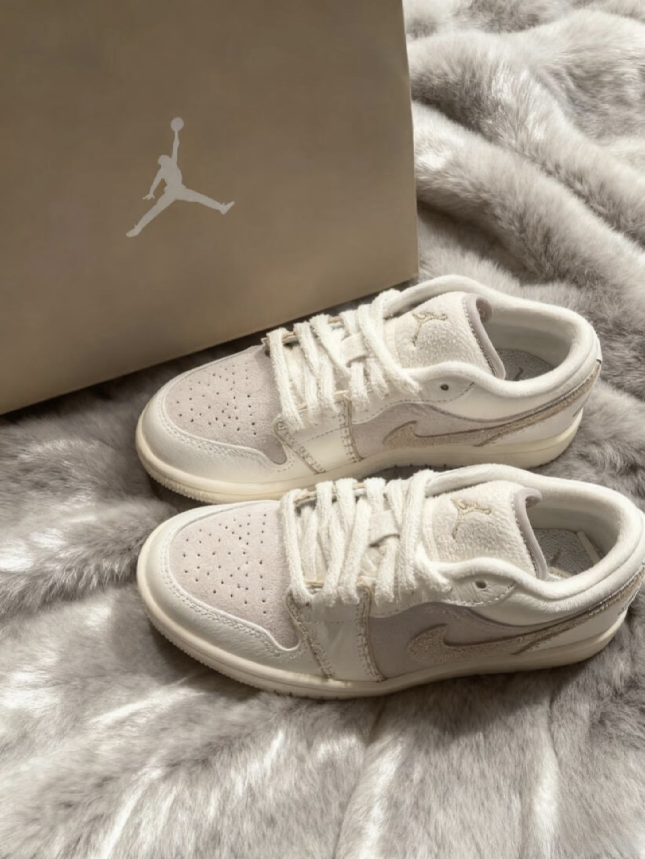这双米白AJ1真的把“高级感”焊在鞋上了! 浅米杏的配色温柔又干净,麂皮拼接+刺绣勾子的细节超戳人,自带一种慵懒又精致的氛围~ 低帮版型日常穿不压脚,搭配大衣、卫衣都能搭出松弛感,踩在毛绒绒的地毯上拍,氛围感直接拉满✨