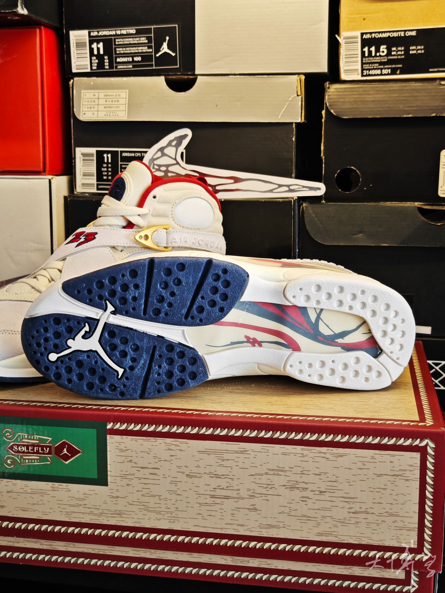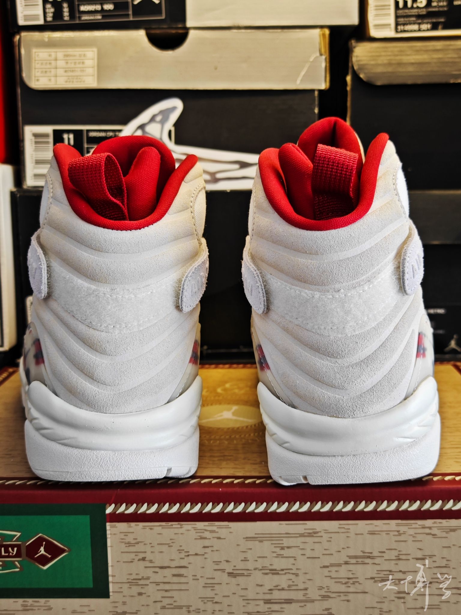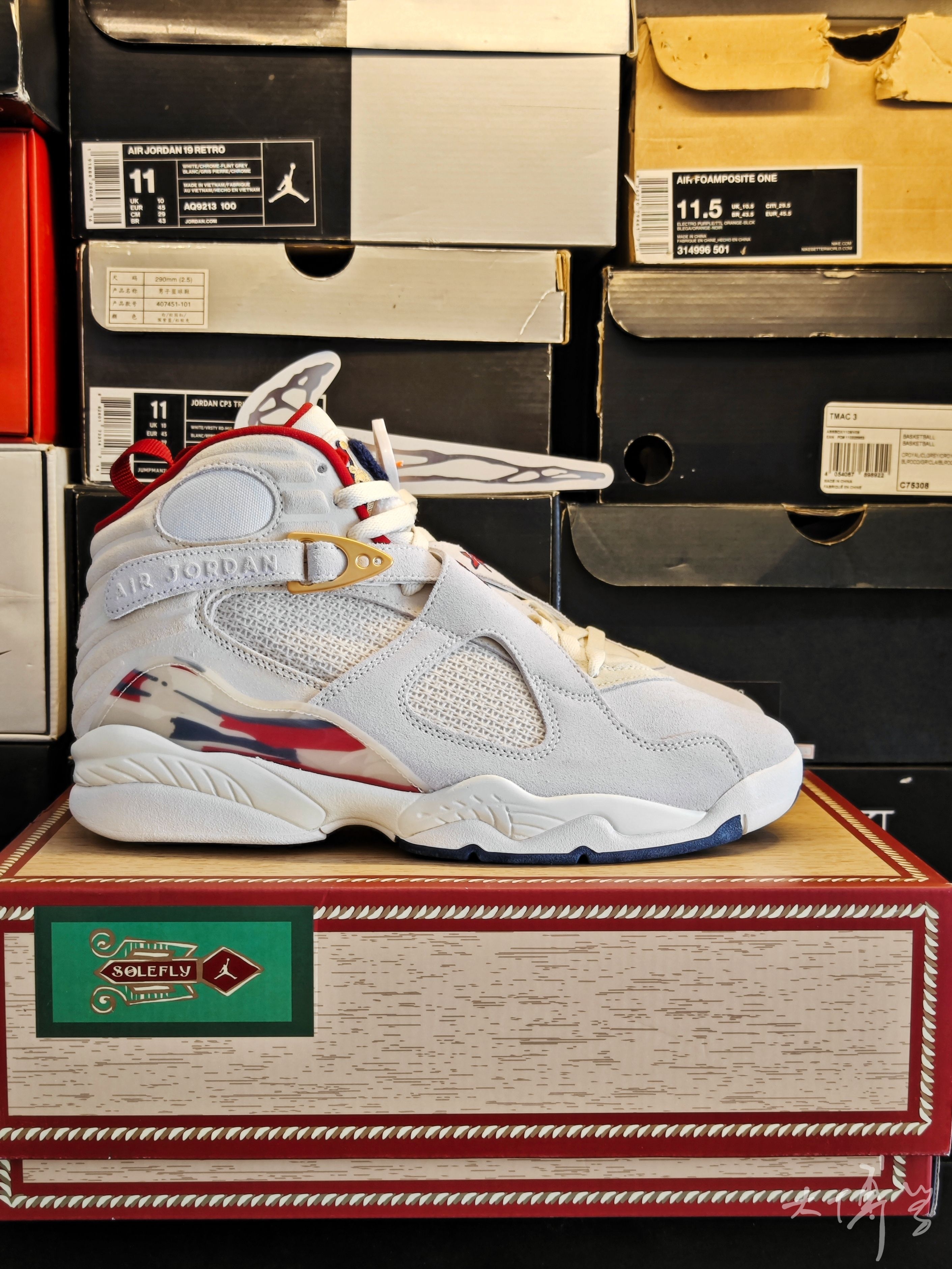 一款SoleFly的联名AJ8 鞋盒模仿古巴雪茄盒 绑带上还有“Mi Casa Es Su Casa”(意为“我家就是你家”) 主体用米白色麂皮+帆布+网眼拼接 整体质感高级但麂皮易脏、难打理 AJ8本身的鞋型偏包裹感强 这双的网眼材质增加了透气性,整体偏厚重