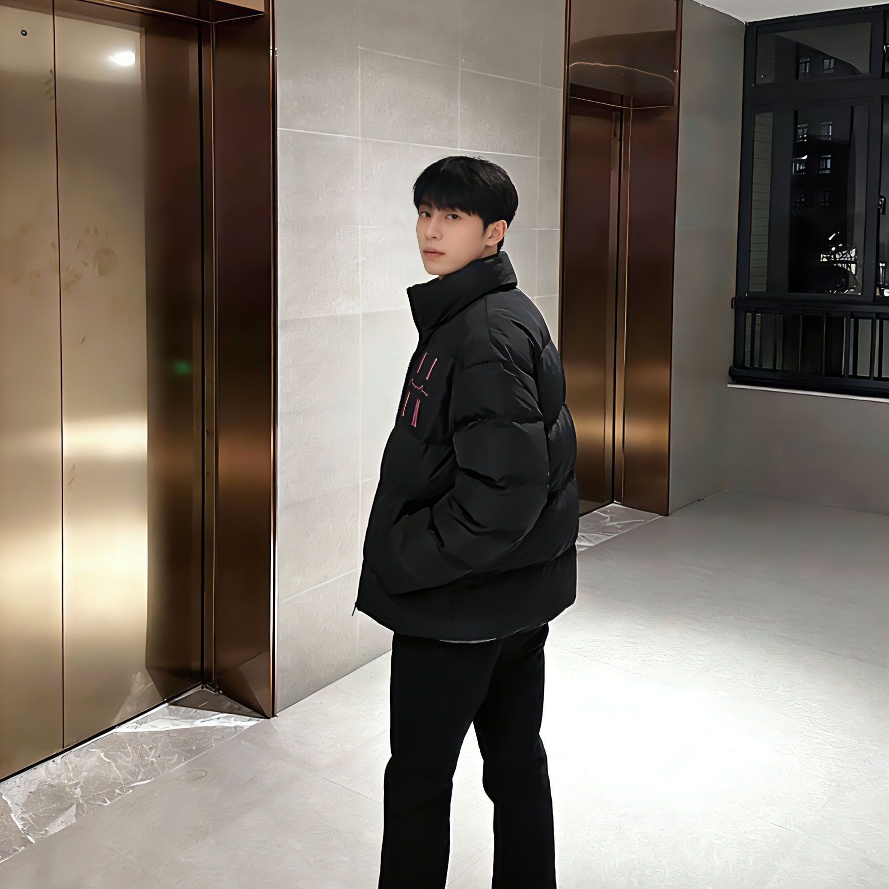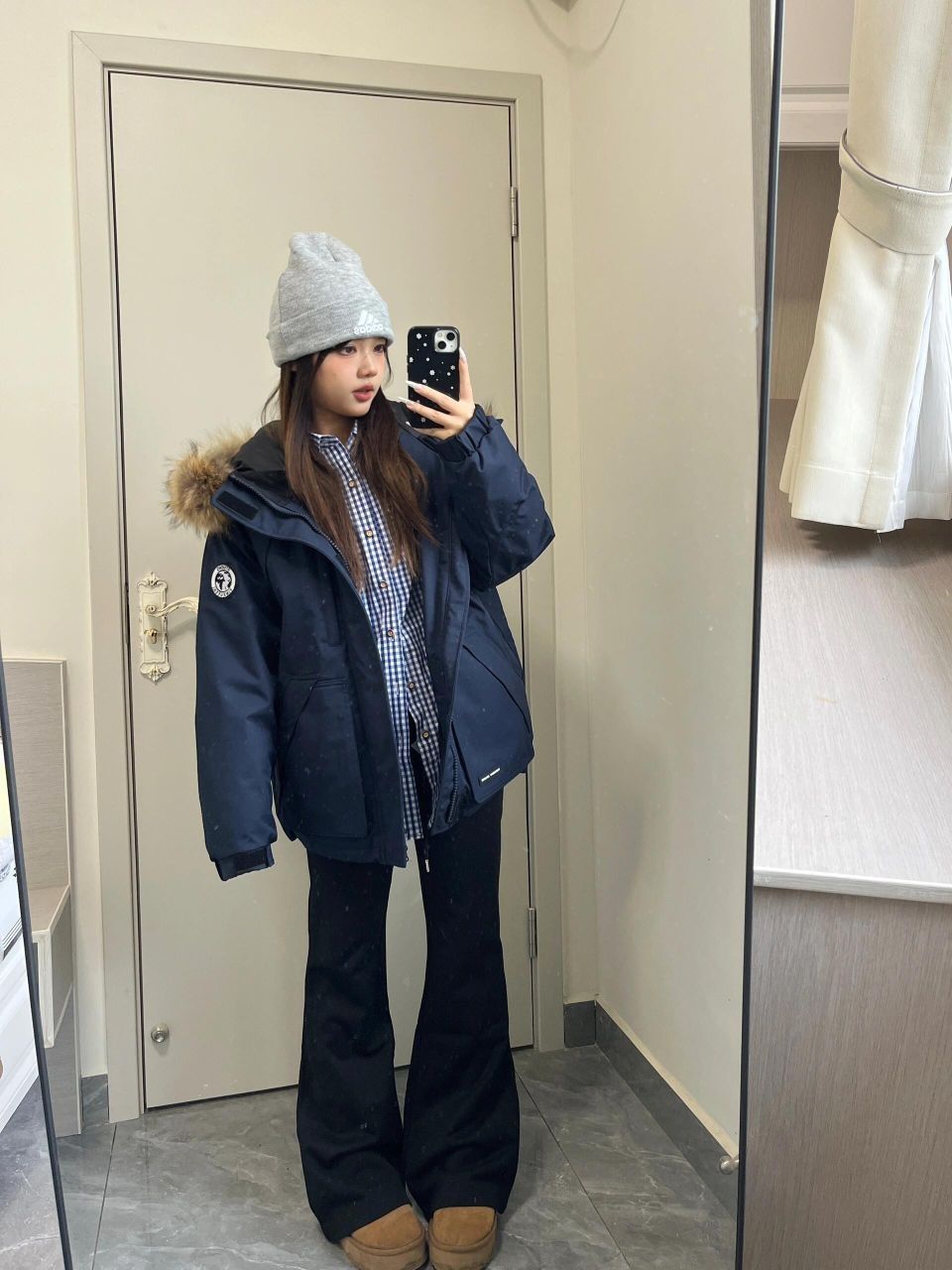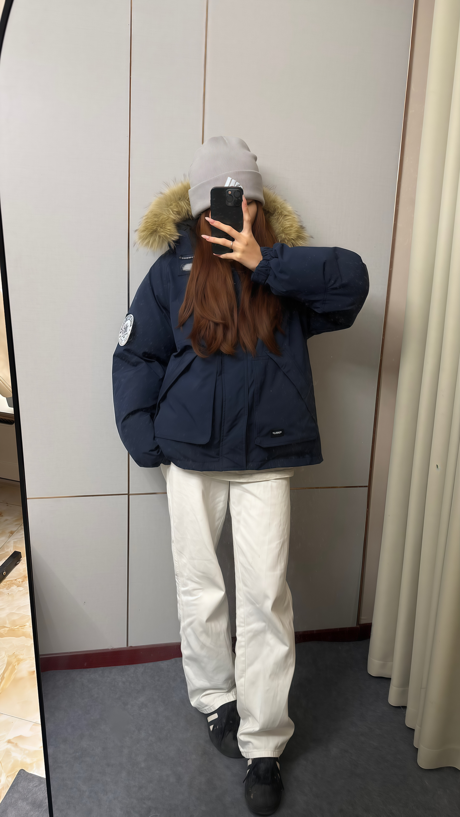这件是藏青色的很百搭~整体很厚实, 穿起来hin暖和胸前的一个标志设计的也很耐看! 我166 96穿的是m宽松效果还有个可拆卸的大毛领很适合冬天