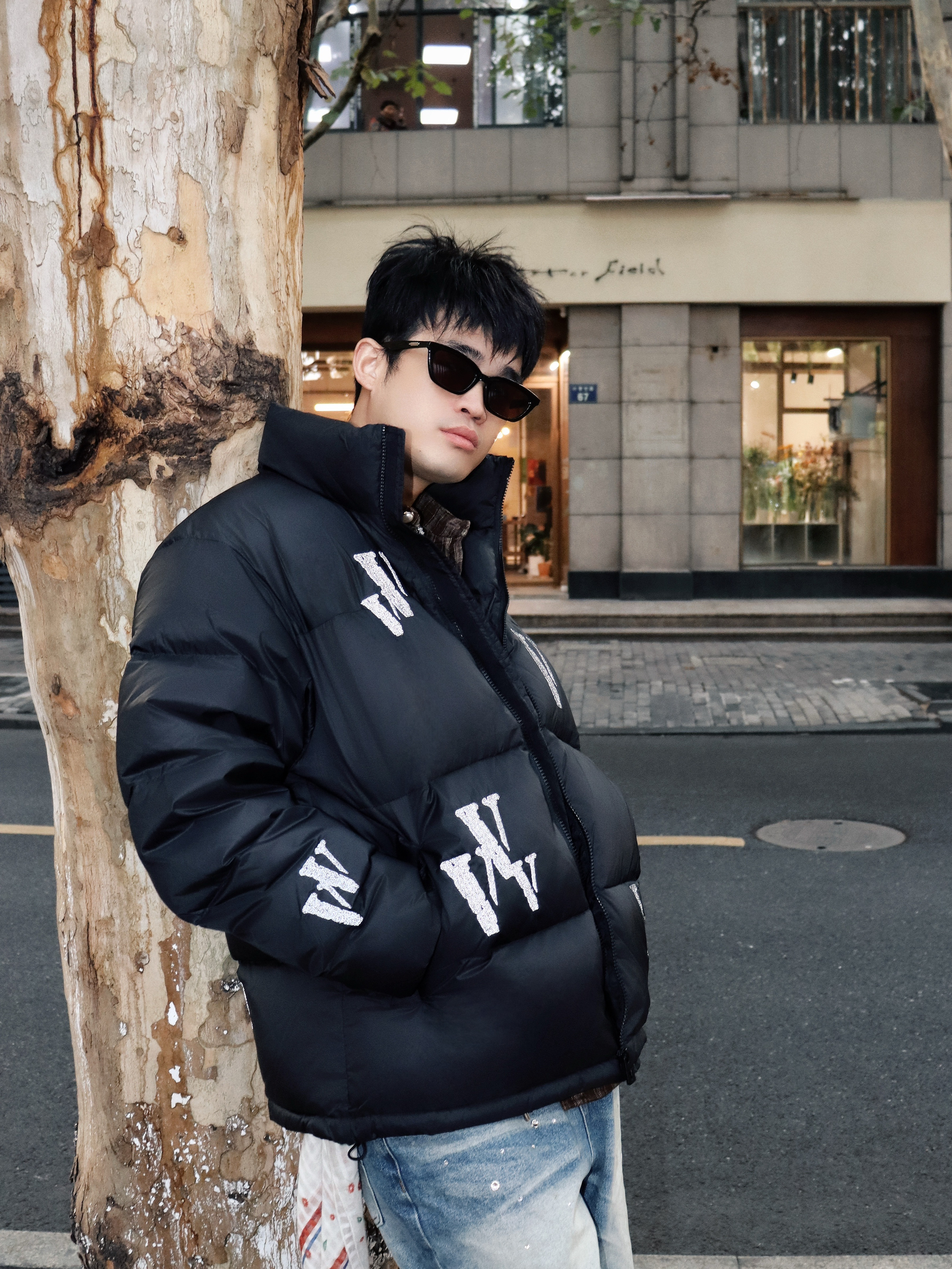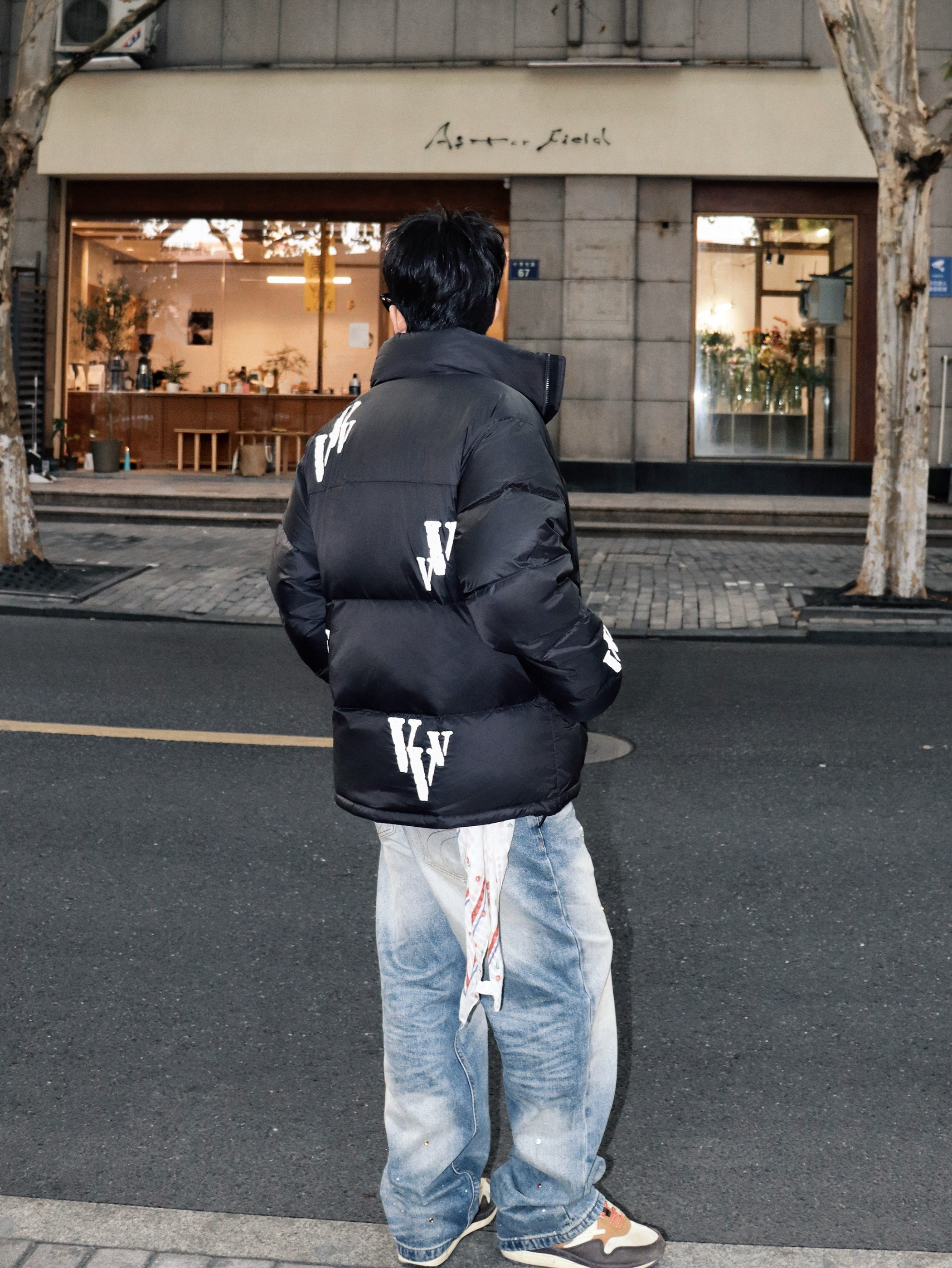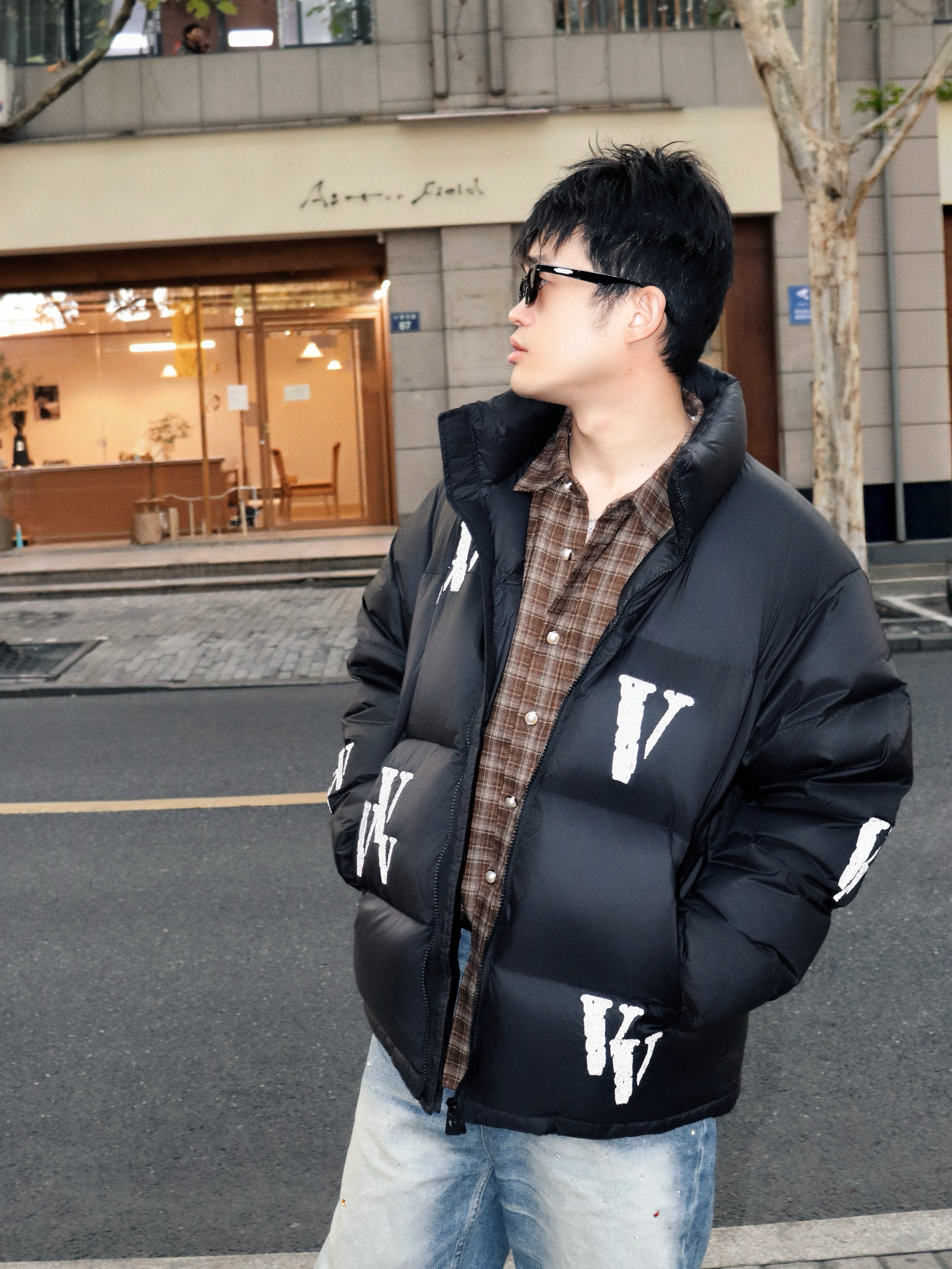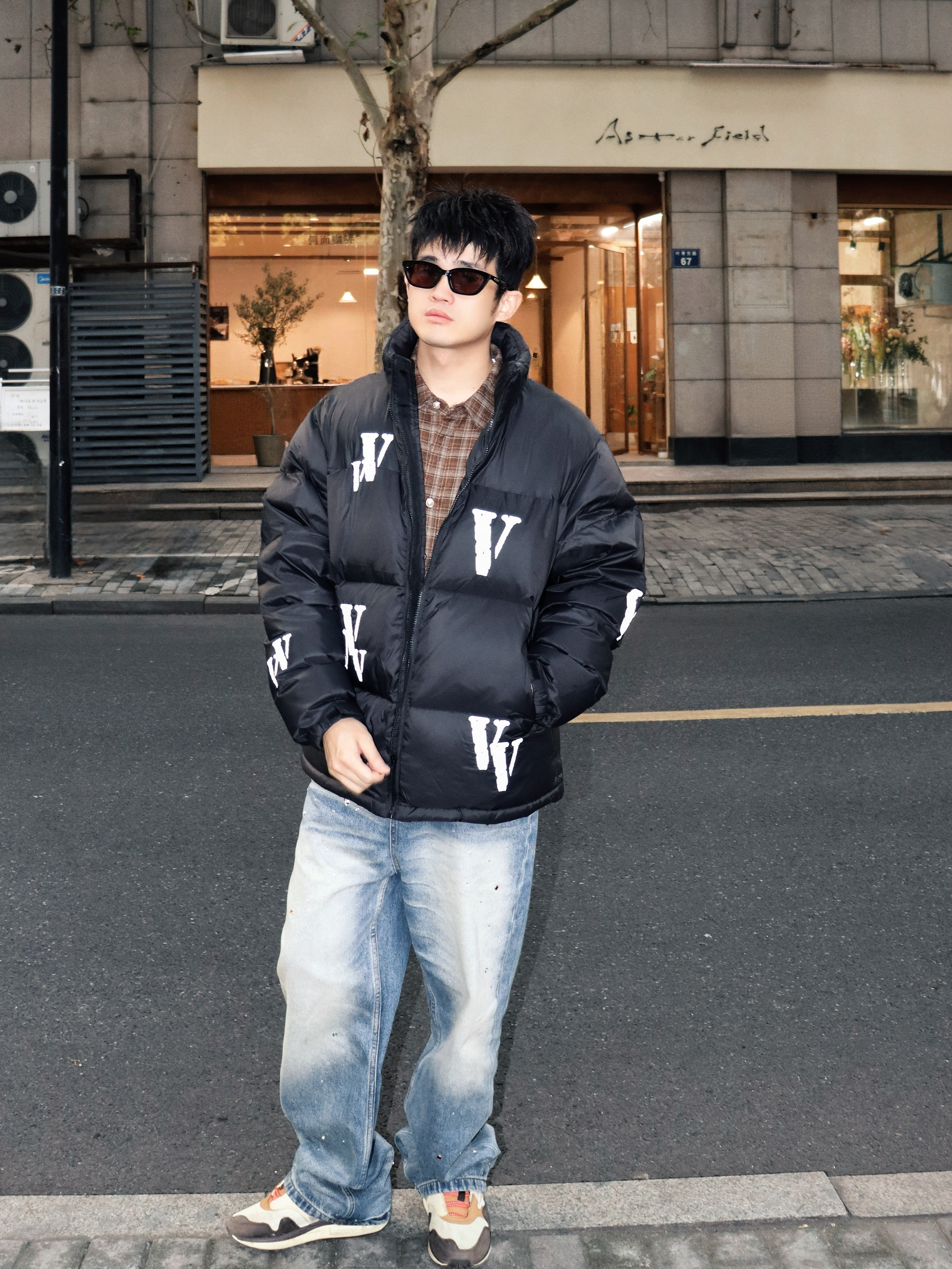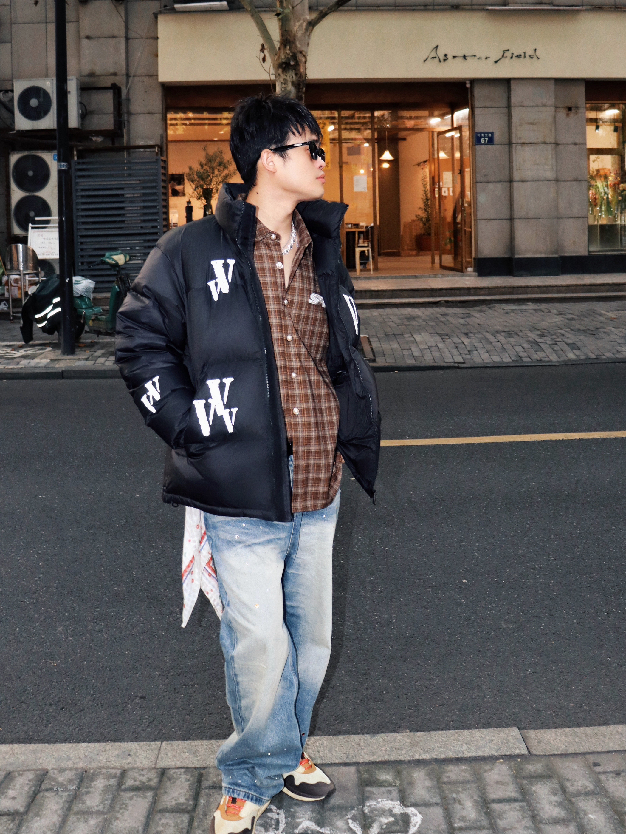 分享一套最近常穿的出街look 保暖又不失层次感 适合日常逛街或朋友小聚 ▪️外套:黑色羽绒服 字母印花+3M反光细节(暗处会有惊喜闪光🔦) 短款设计利落不臃肿 ▪️内搭:棕色格子衬衫 领口露出增加色彩过渡 单穿或叠穿都ok ▪️下装:浅蓝做旧牛仔裤 裤面水钻💎设计➕红白飘带 宽松版型走路舒服 ▪️配饰:黑墨镜+银色项链 瞬间提升街头感🕶️ 整体是低调的牛仔蓝和黑色系 用棕格子提亮 鞋子选拼色款...