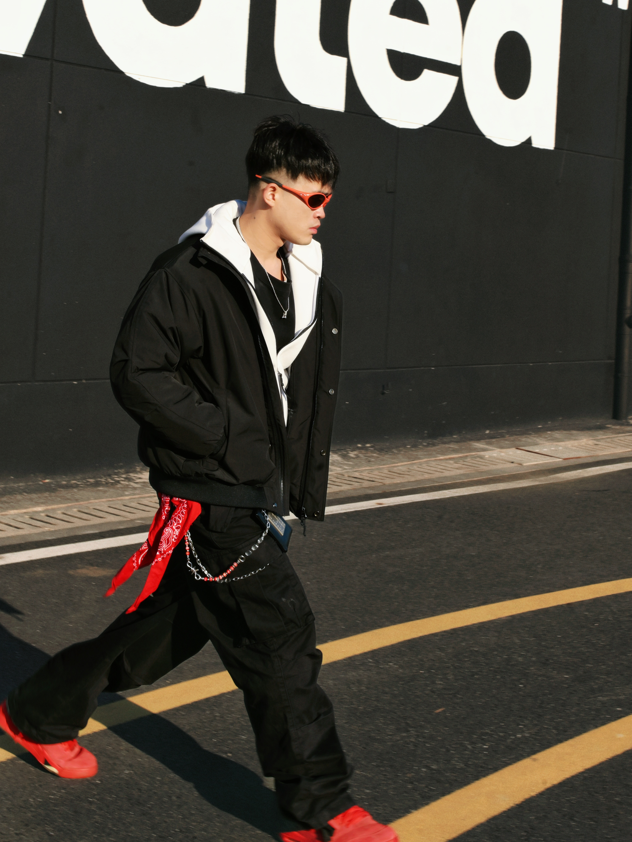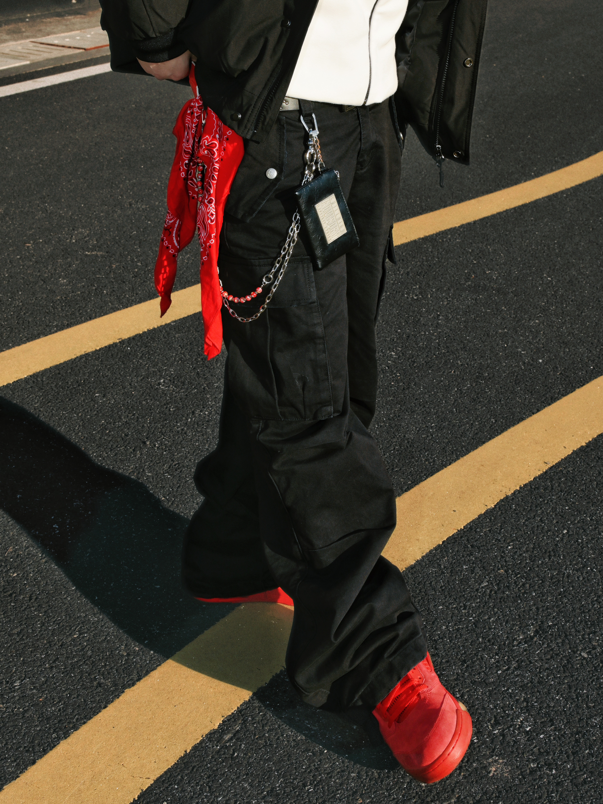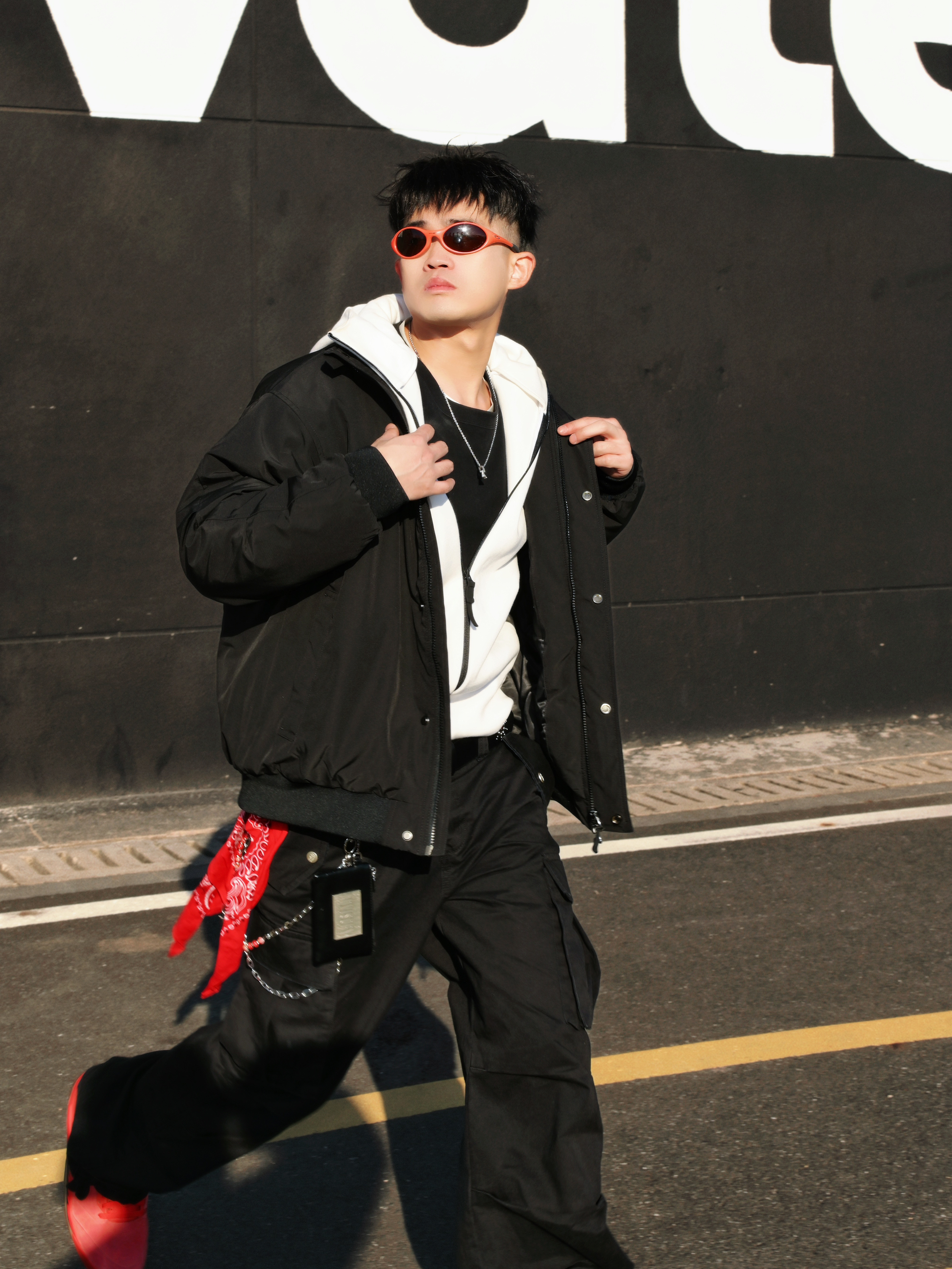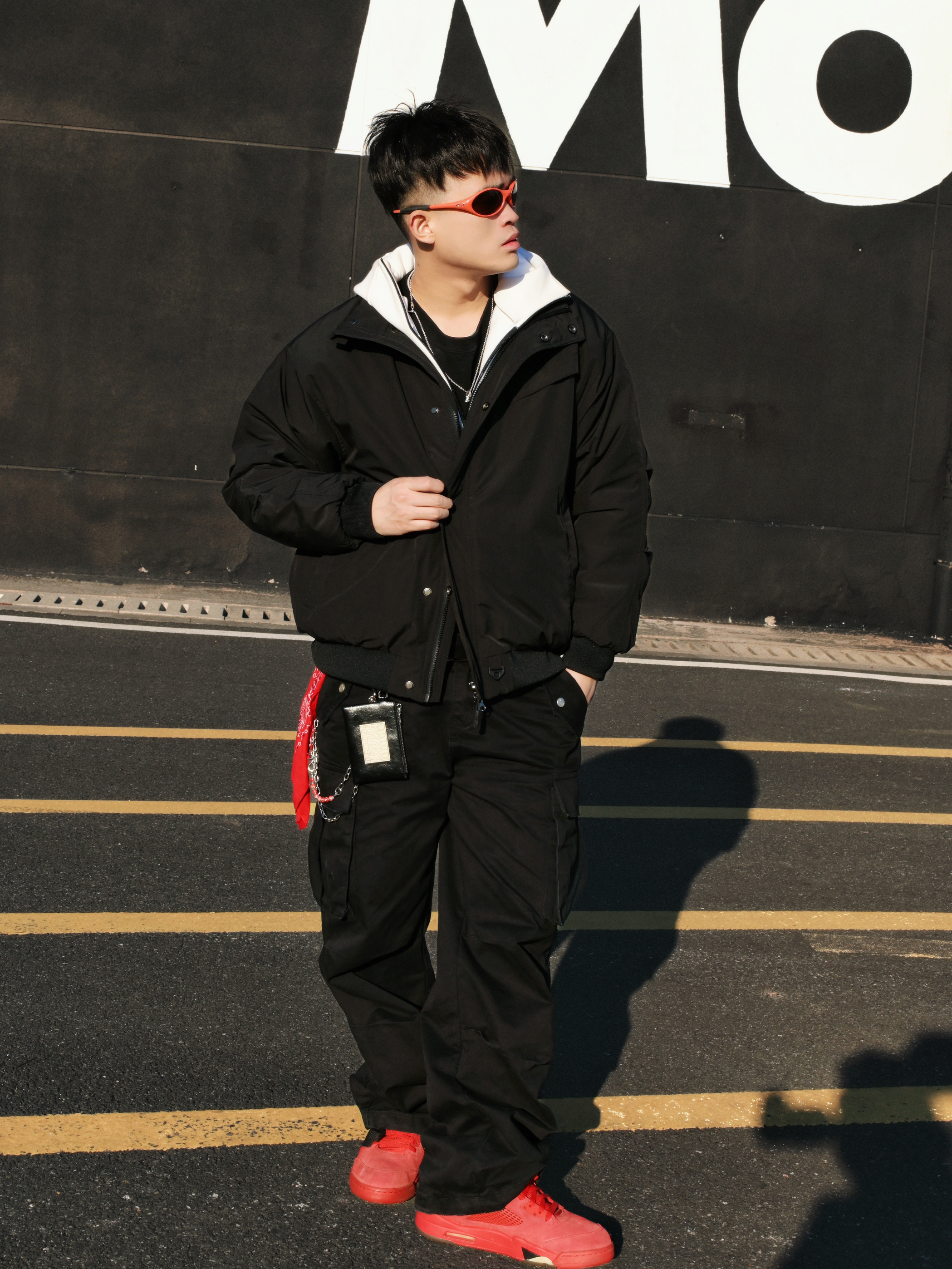 分享一组街头穿搭🫱 核心就是黑红配色,简单不出错,又能有个性。 穿搭思路: • 上衣:黑色棉服外套内搭连帽外套,层次感有了。冷的时候扣上,热了脱掉也方便。 • 下装:黑色工装裤,口袋多且立体,实用又增加造型感。 • 配饰:红色方巾+银色链条是亮点,让整体不单调。橙色或红色墨镜🕶️一戴,氛围感直接拉满。 • 鞋履:一双亮眼的红色运动鞋👟,成为全身的视觉焦点,和配饰颜色呼应❤️🔥 整体就是简约舒适...