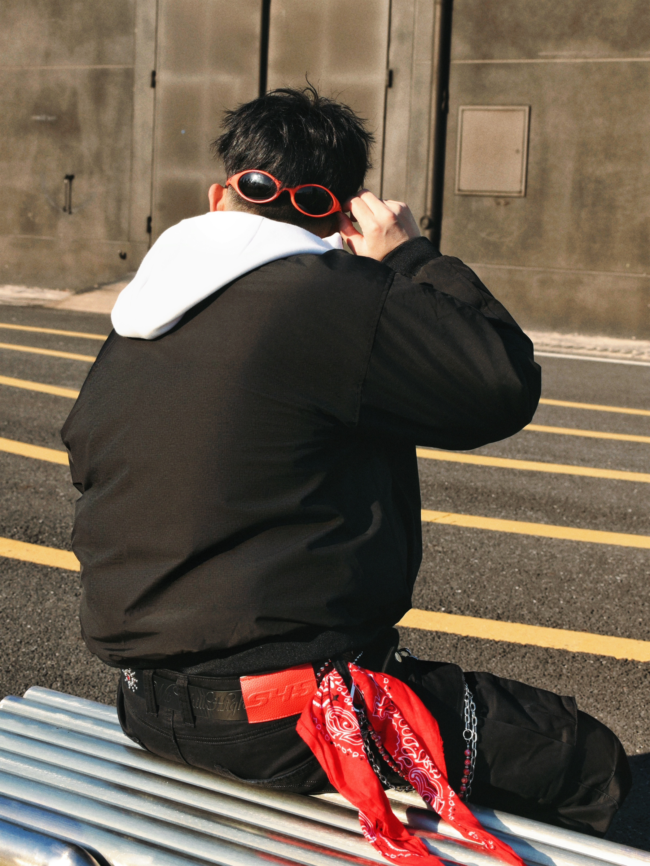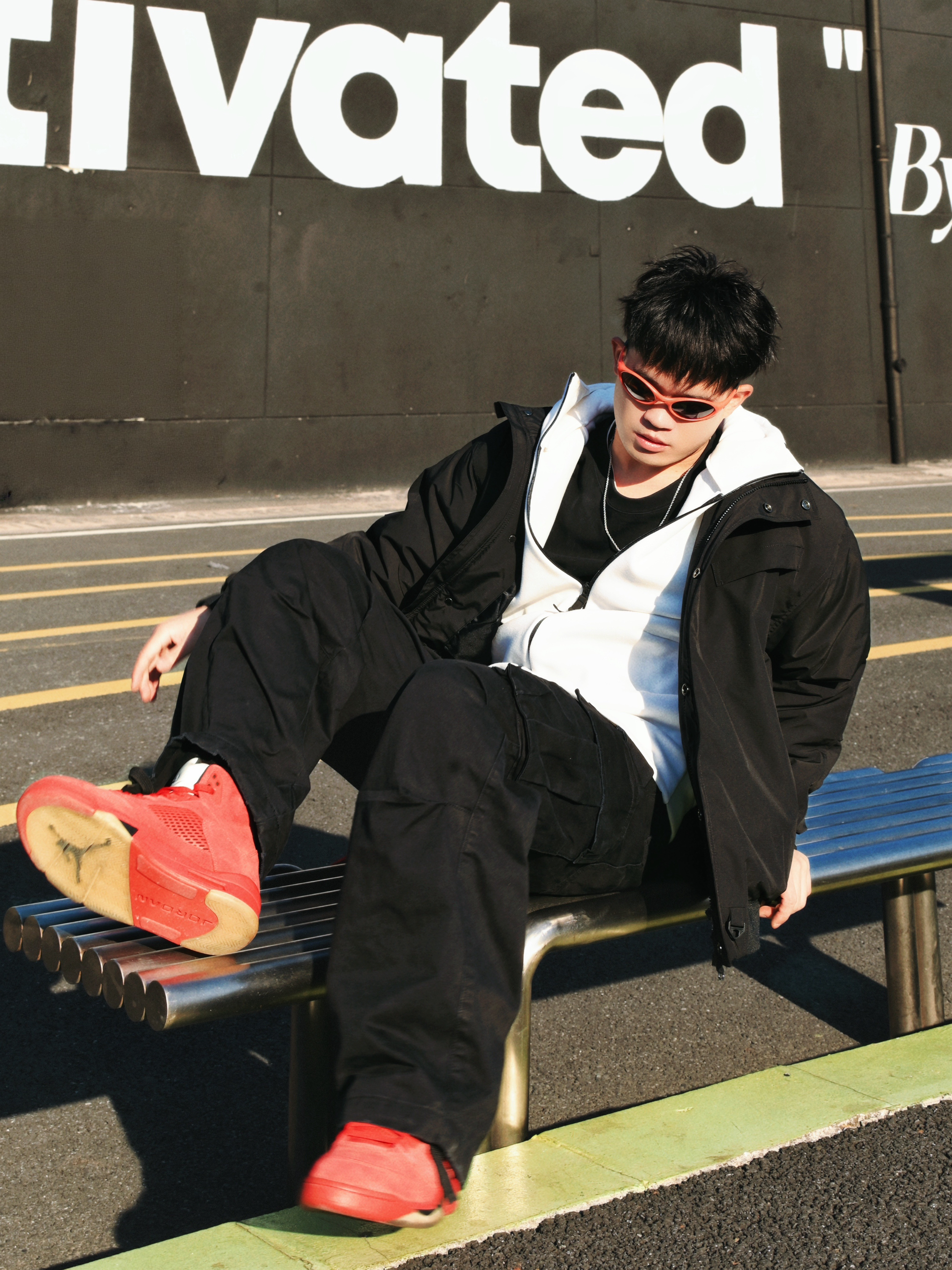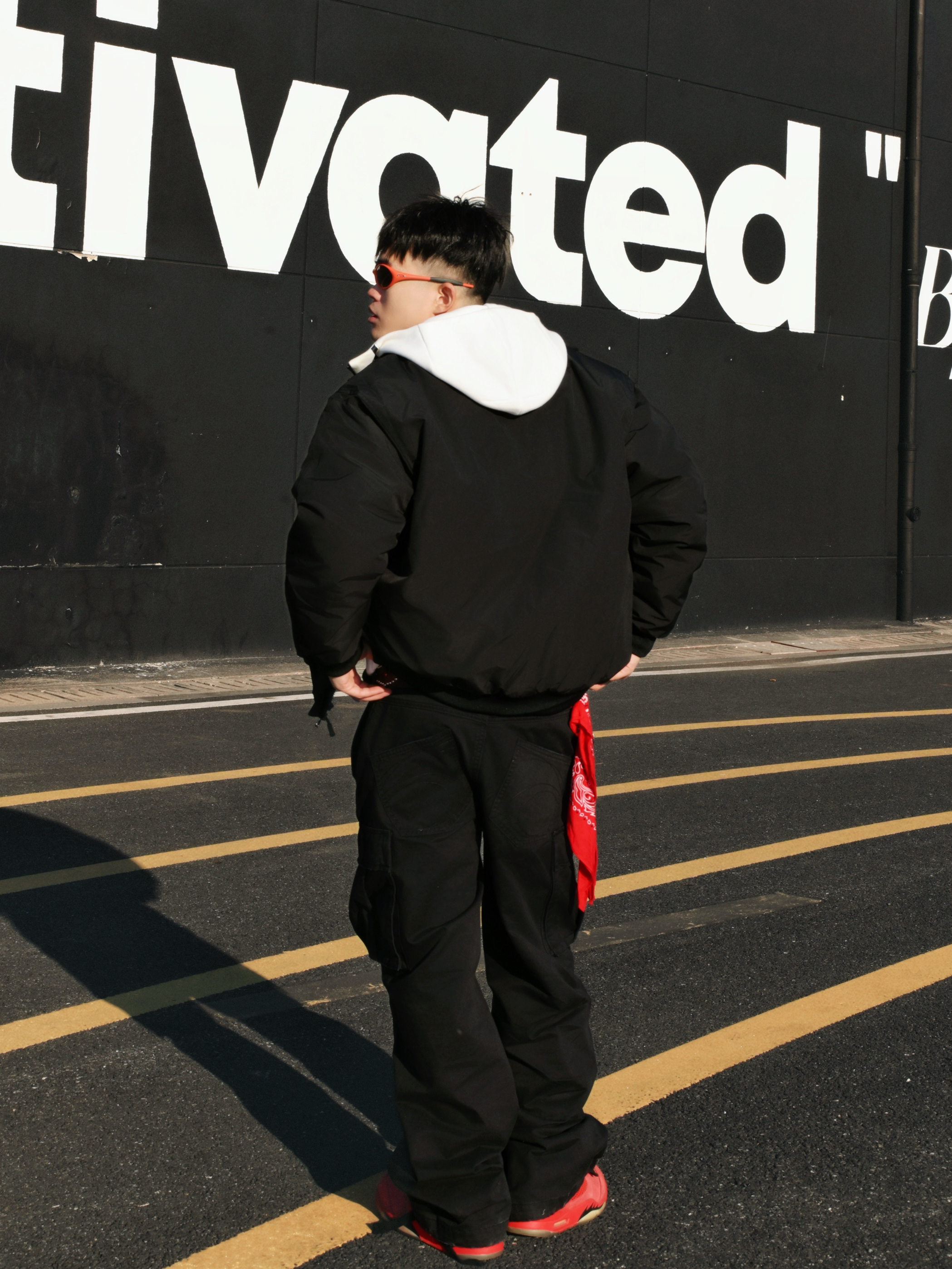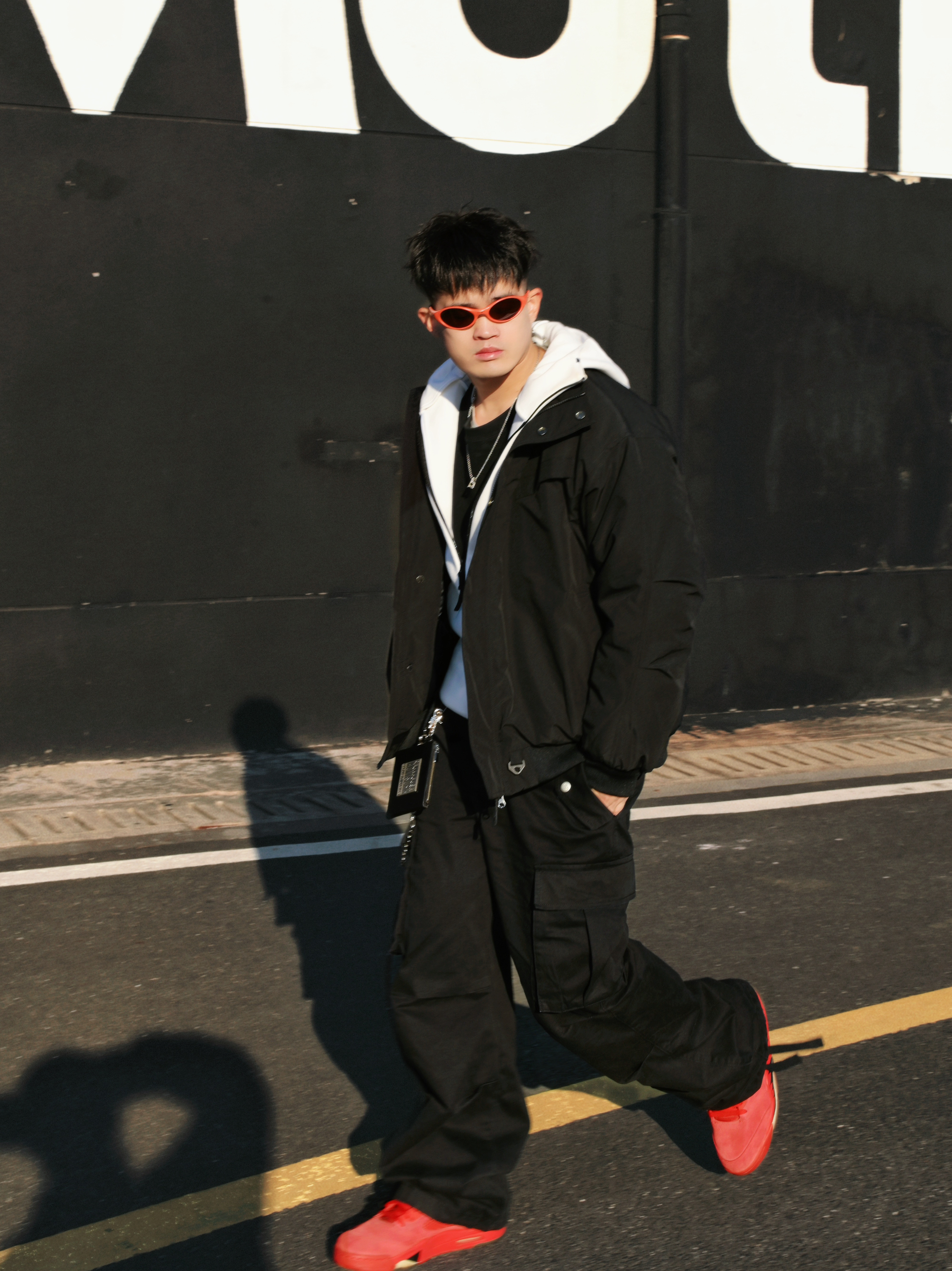 分享一组街头穿搭🫱 核心就是黑红配色,简单不出错,又能有个性。 穿搭思路: • 上衣:黑色棉服外套内搭连帽外套,层次感有了。冷的时候扣上,热了脱掉也方便。 • 下装:黑色工装裤,口袋多且立体,实用又增加造型感。 • 配饰:红色方巾+银色链条是亮点,让整体不单调。橙色或红色墨镜🕶️一戴,氛围感直接拉满。 • 鞋履:一双亮眼的红色运动鞋👟,成为全身的视觉焦点,和配饰颜色呼应❤️🔥 整体就是简约舒适...