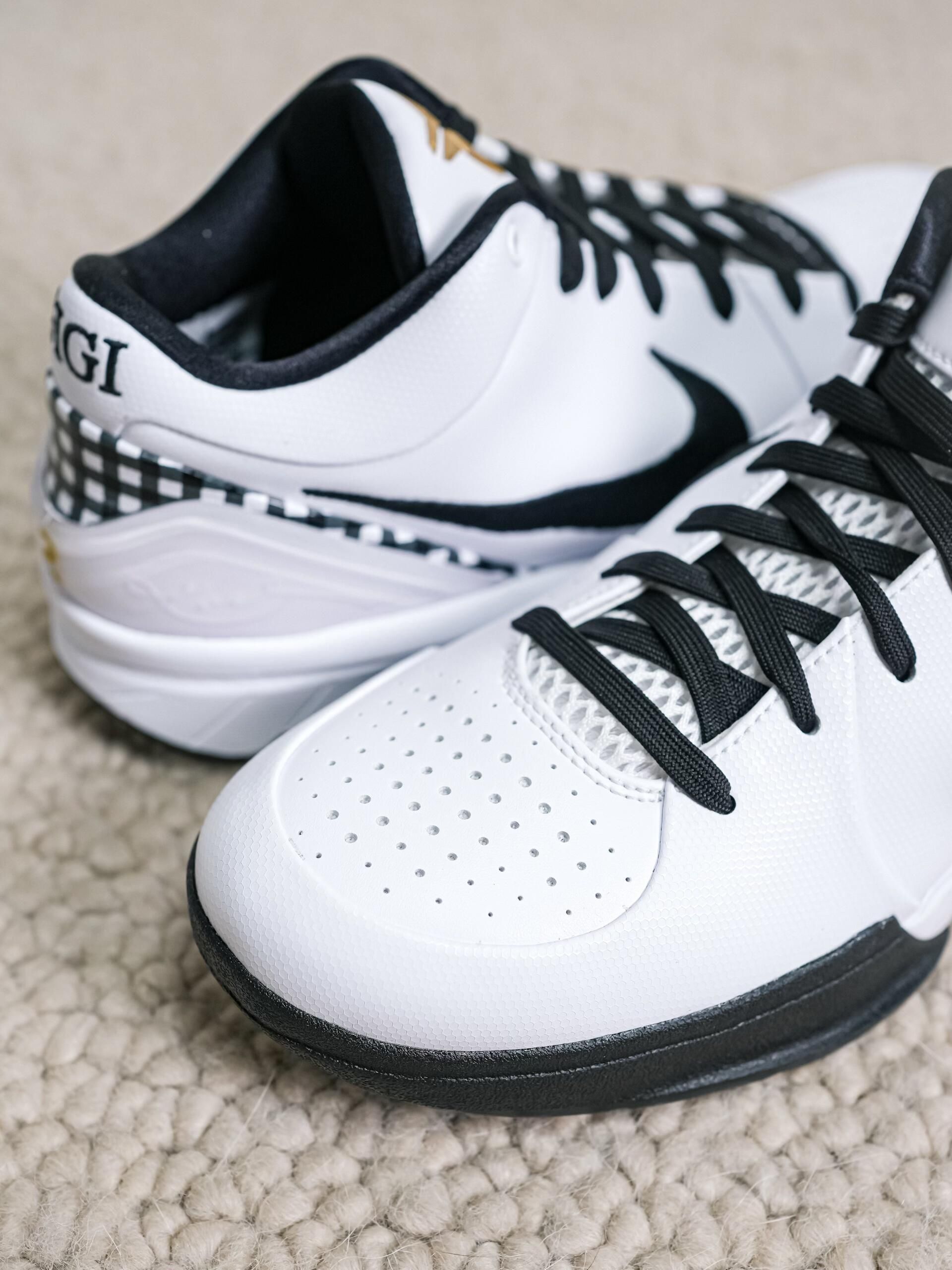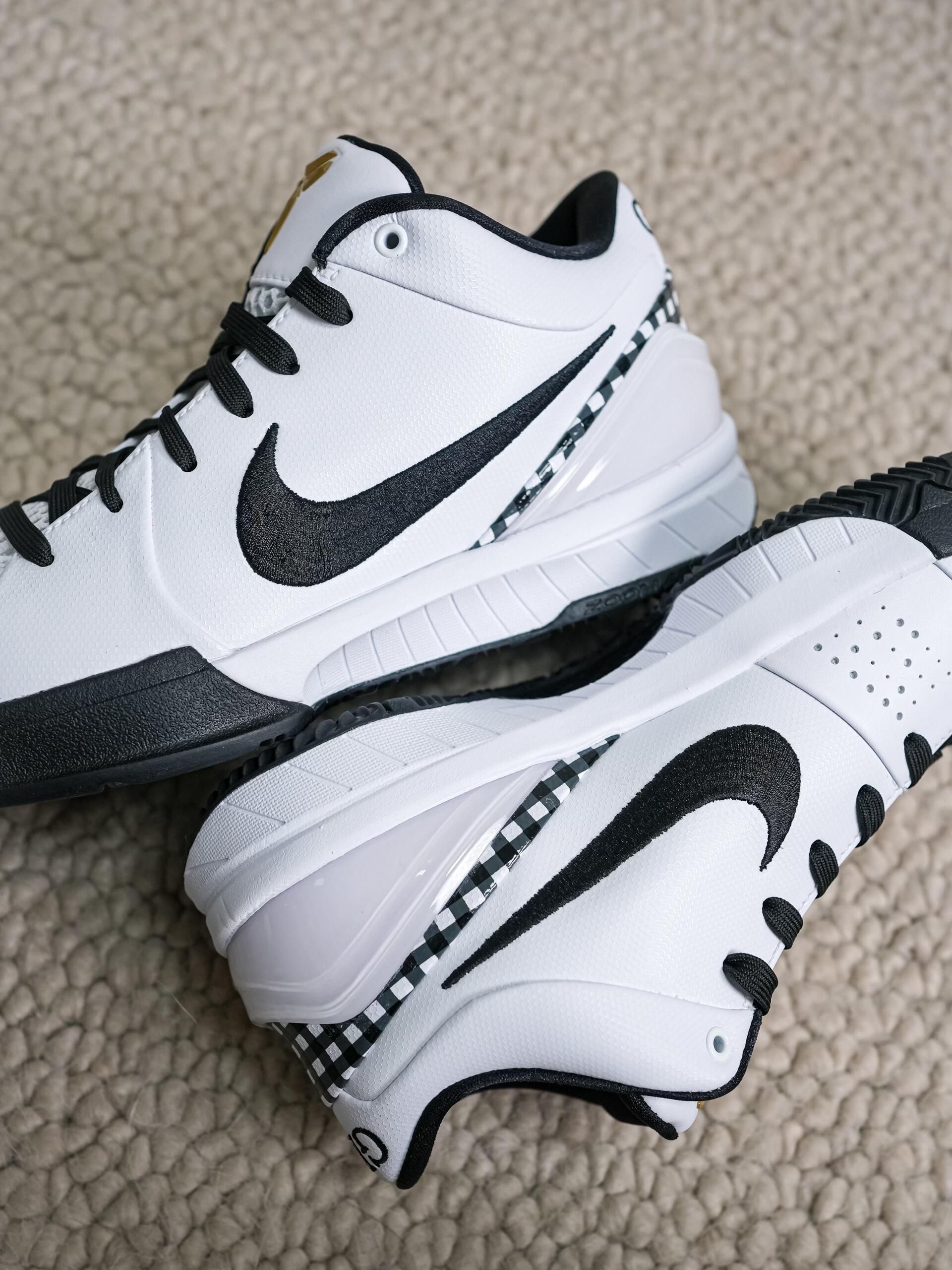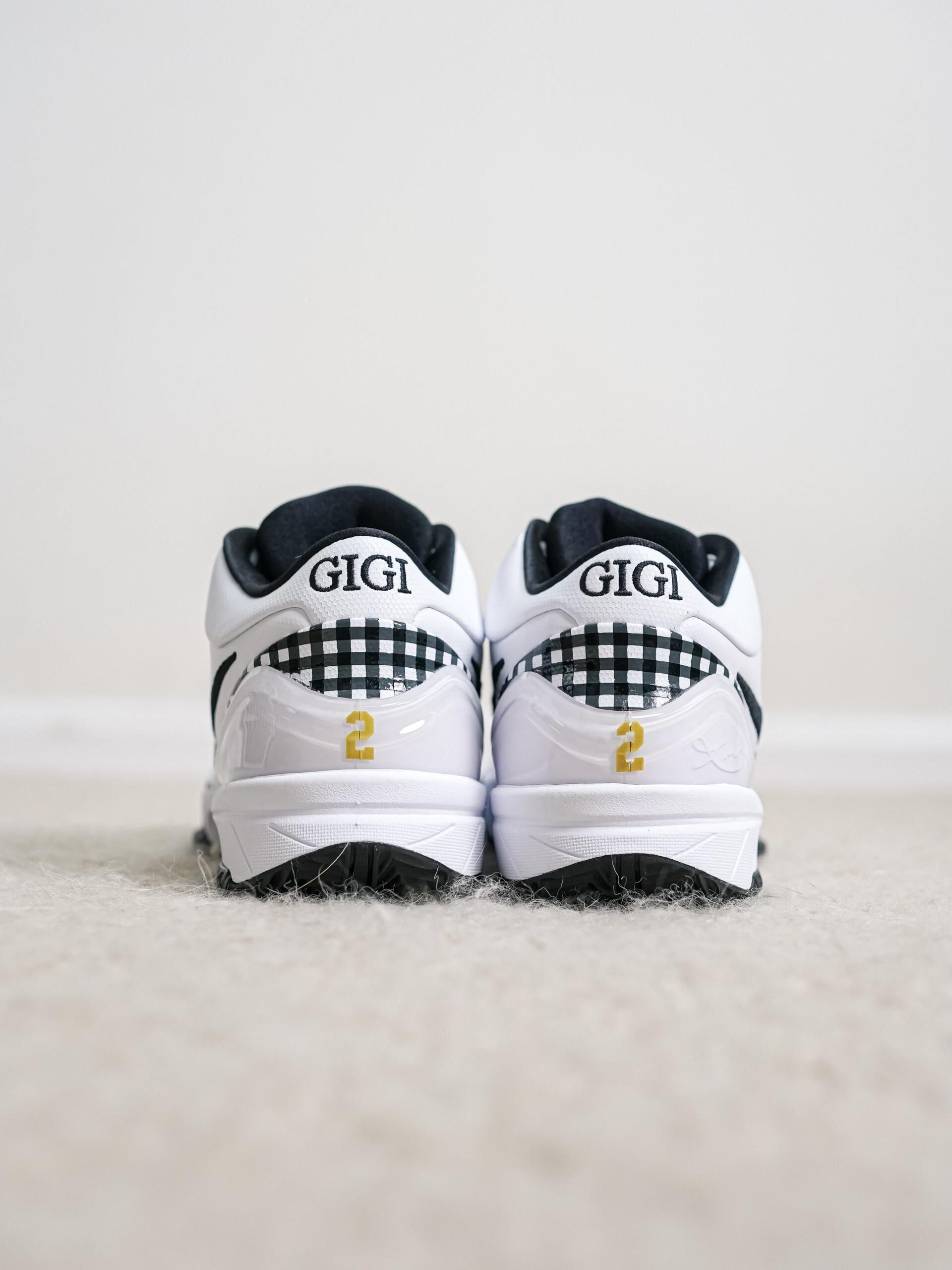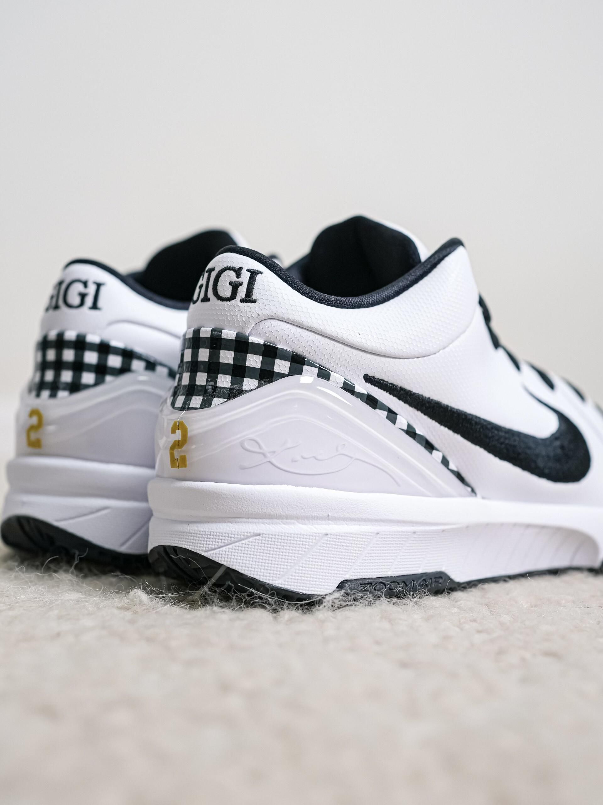 这双是Nike Zoom Kobe 4 Protro “Gigi”,是耐克为纪念科比的二女儿吉安娜(Gigi Bryant,球衣号2号)推出的专属配色。 - 配色与细节:以白黑为主色调,点缀金色科比Logo,鞋后跟刺绣“GIGI”字样和黄色“2”号,鞋身侧边加入黑白色格纹元素,还原Gigi生前常穿的风格。 - 情怀与意义:从鞋面透气孔到中底的Zoom气垫,既保留了科比4代经典的实战性能,又...