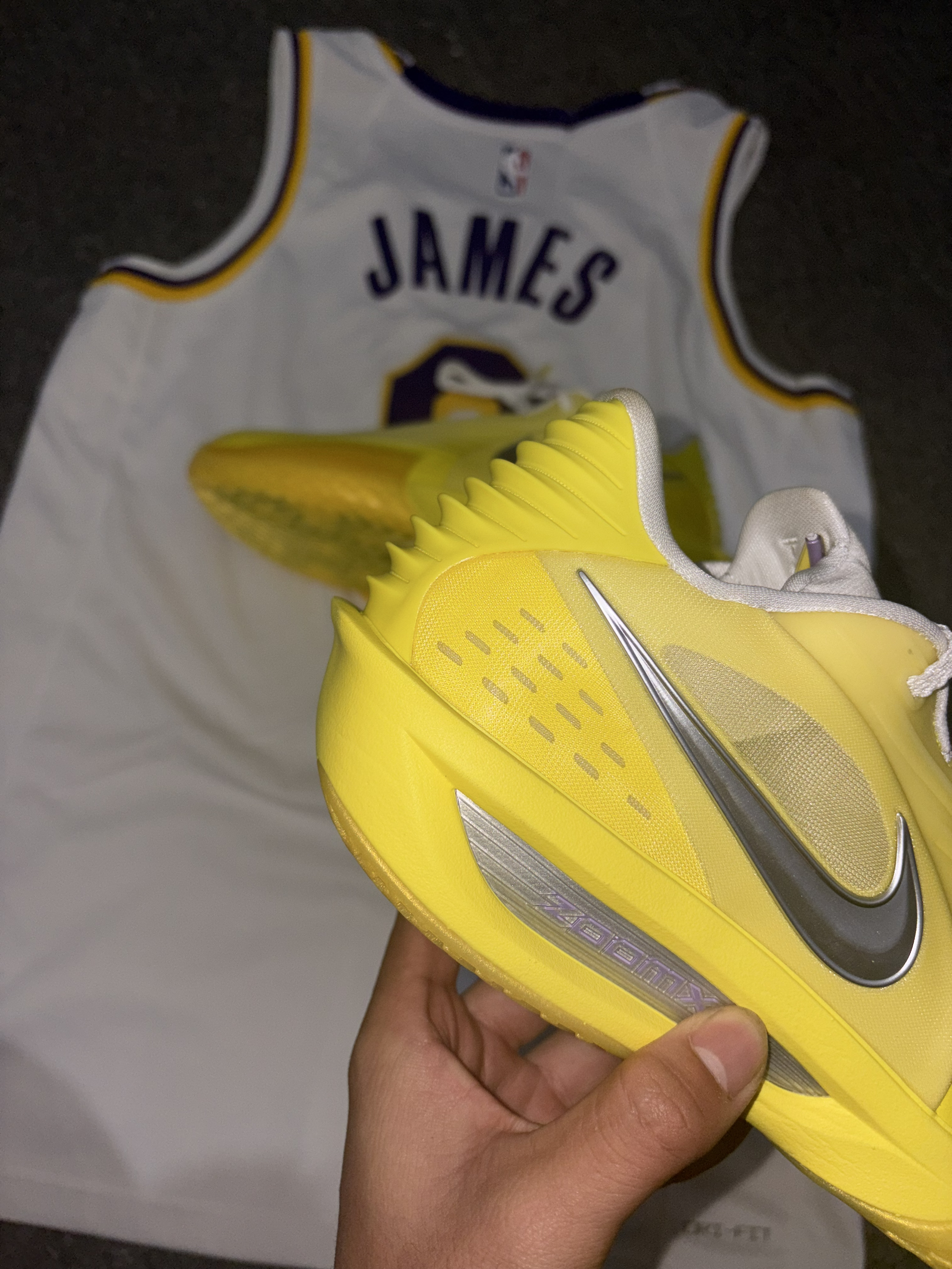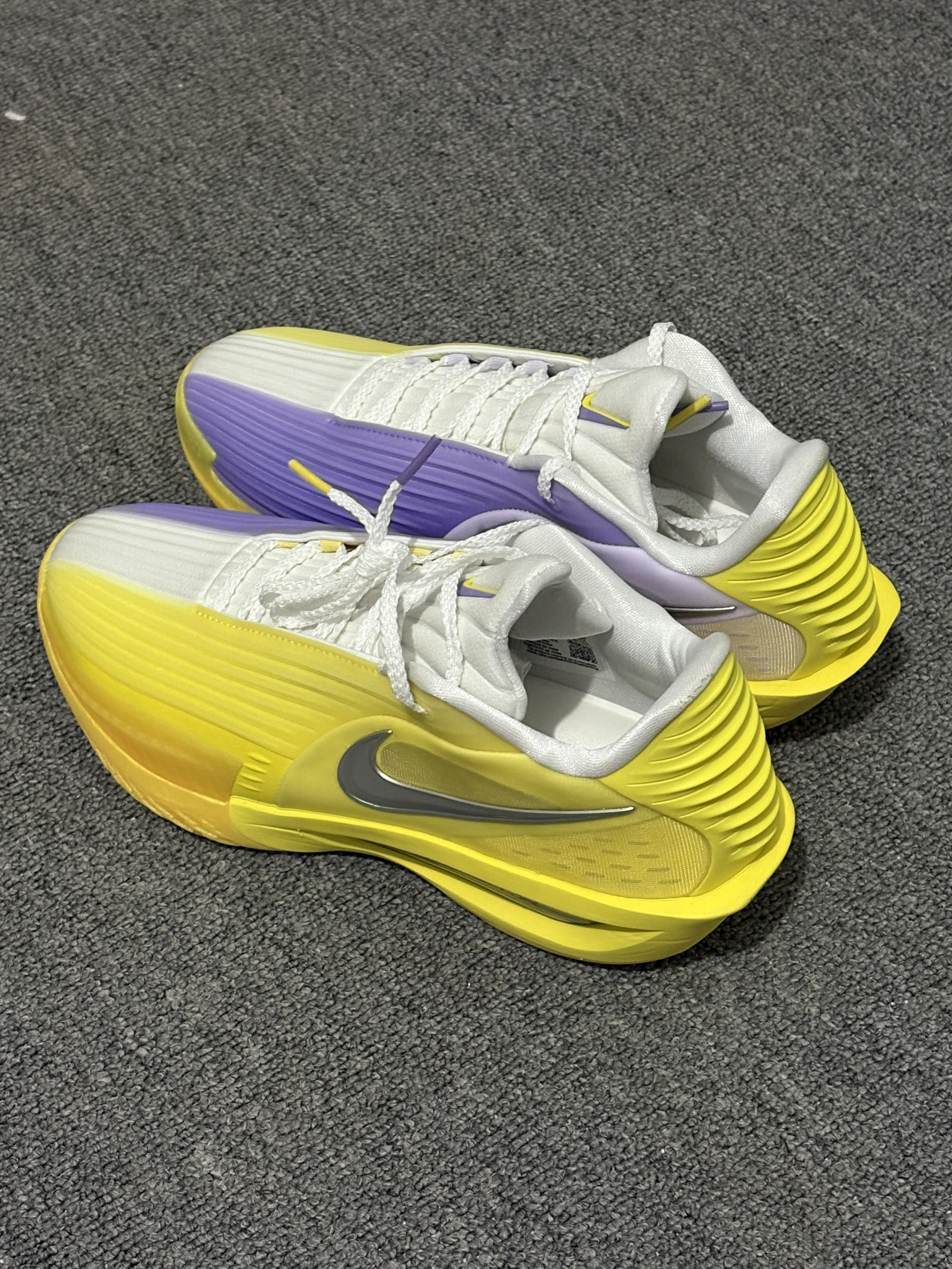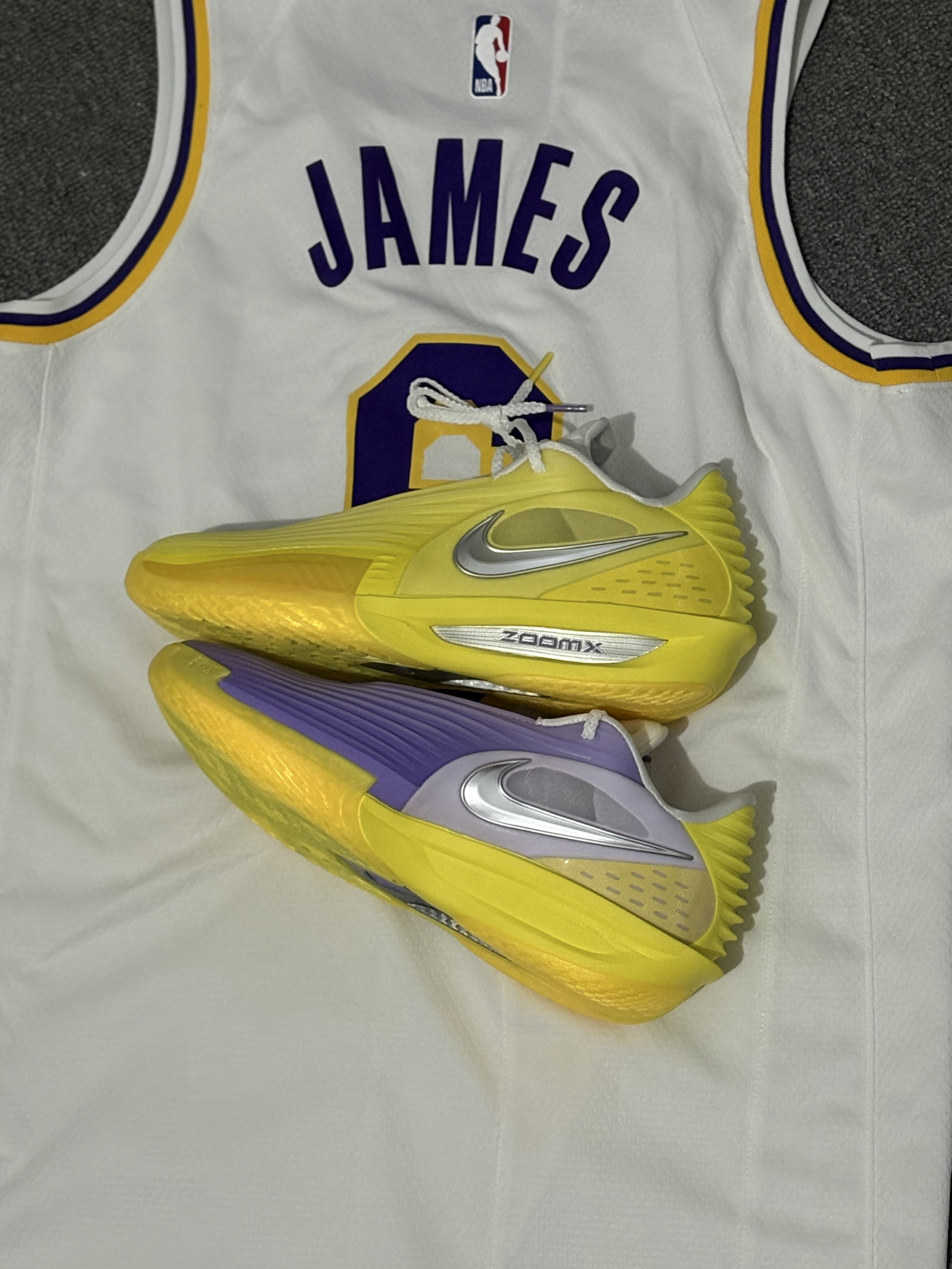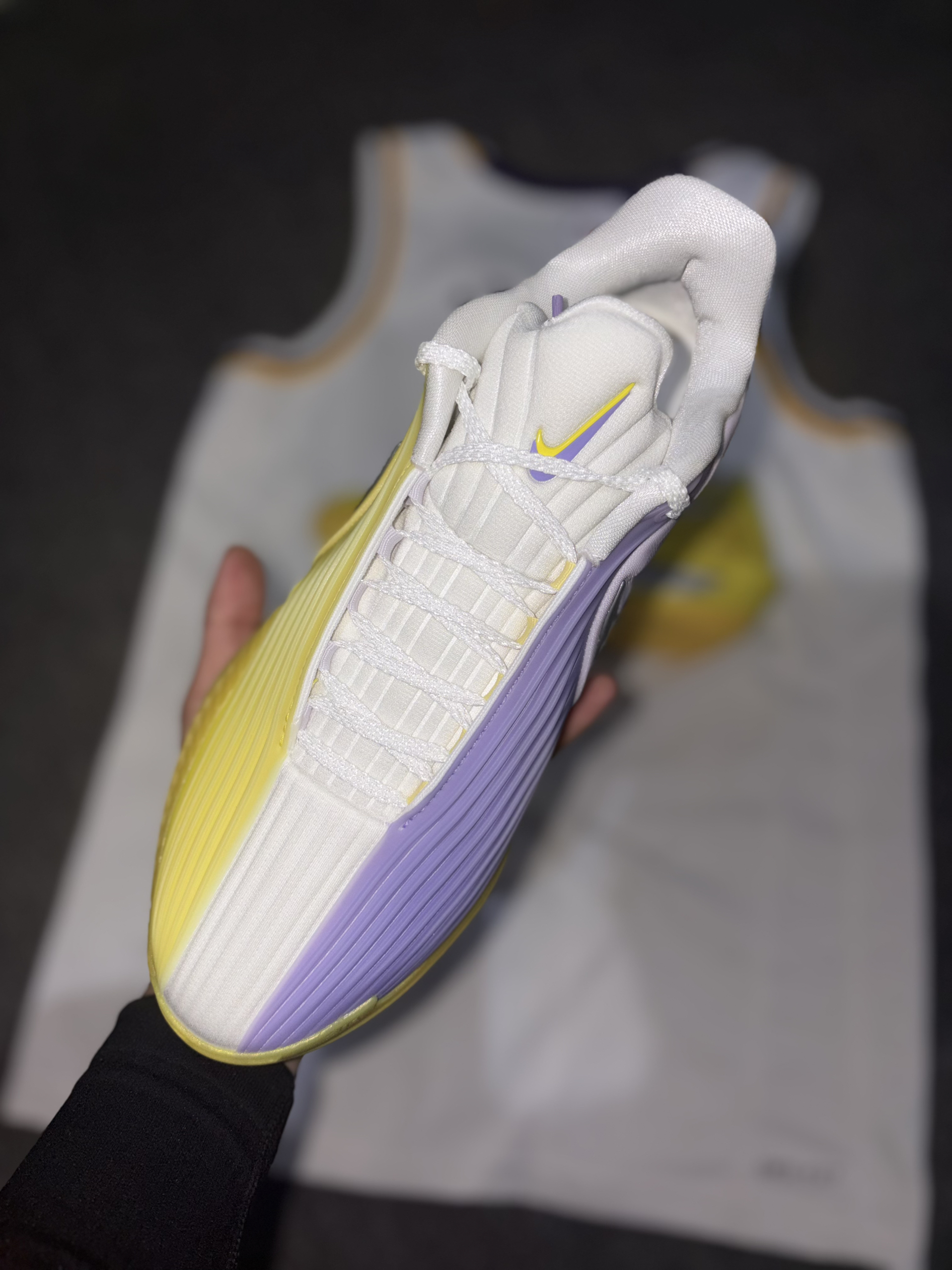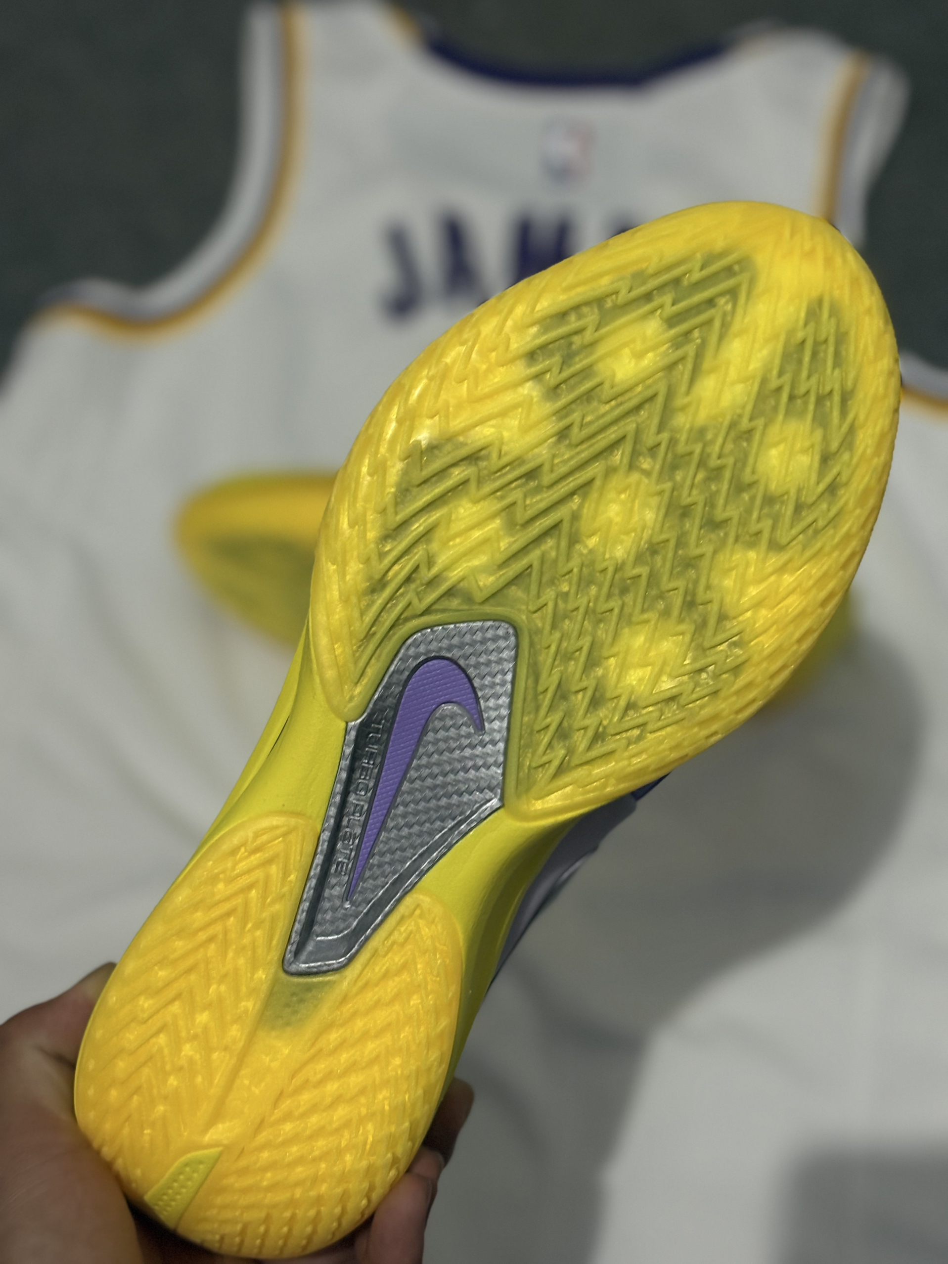 非常好看的湖人球队配色,采用非常经典的紫金湖人风格,金黄色非常醒目,球鞋外观很在线