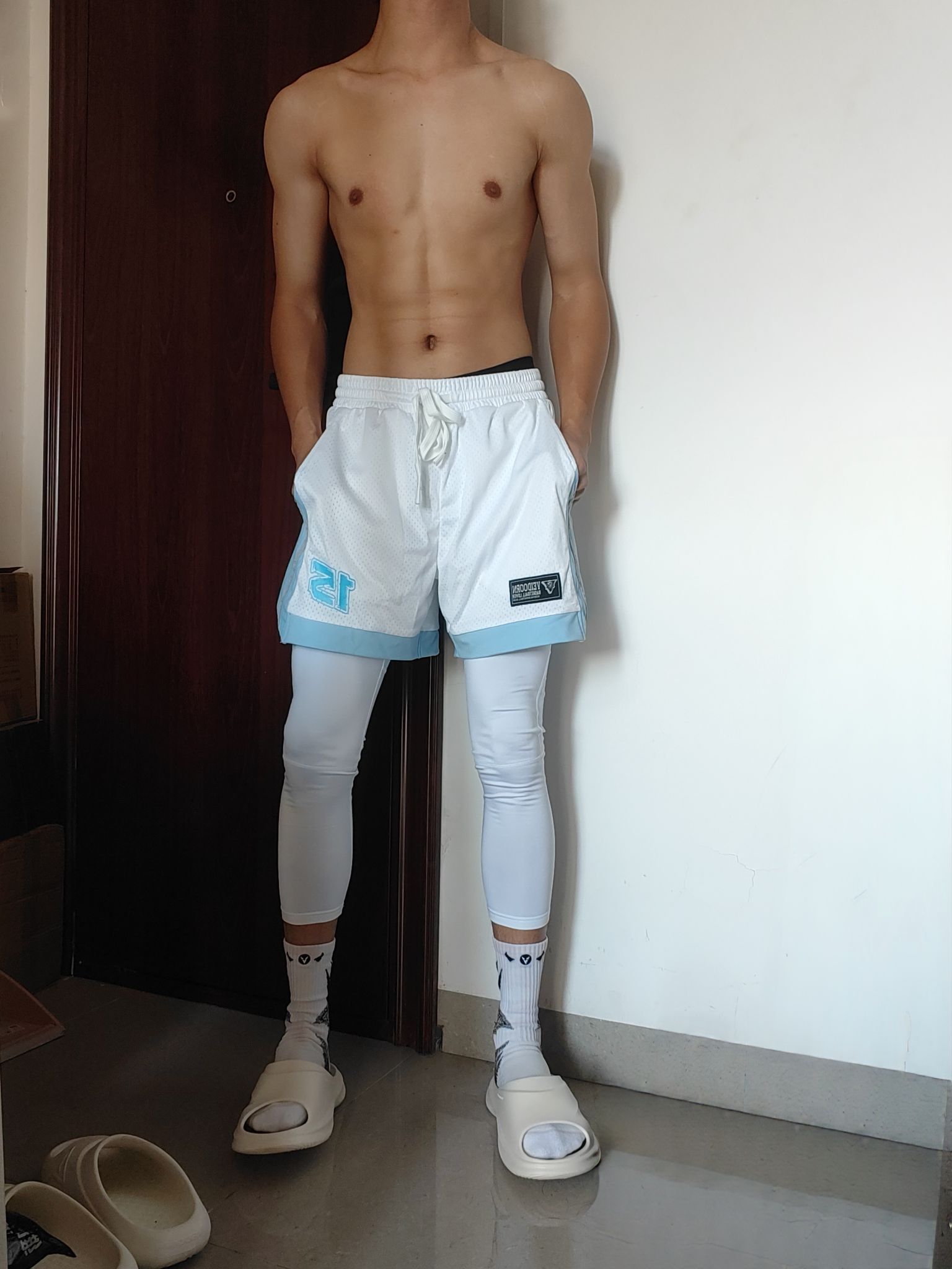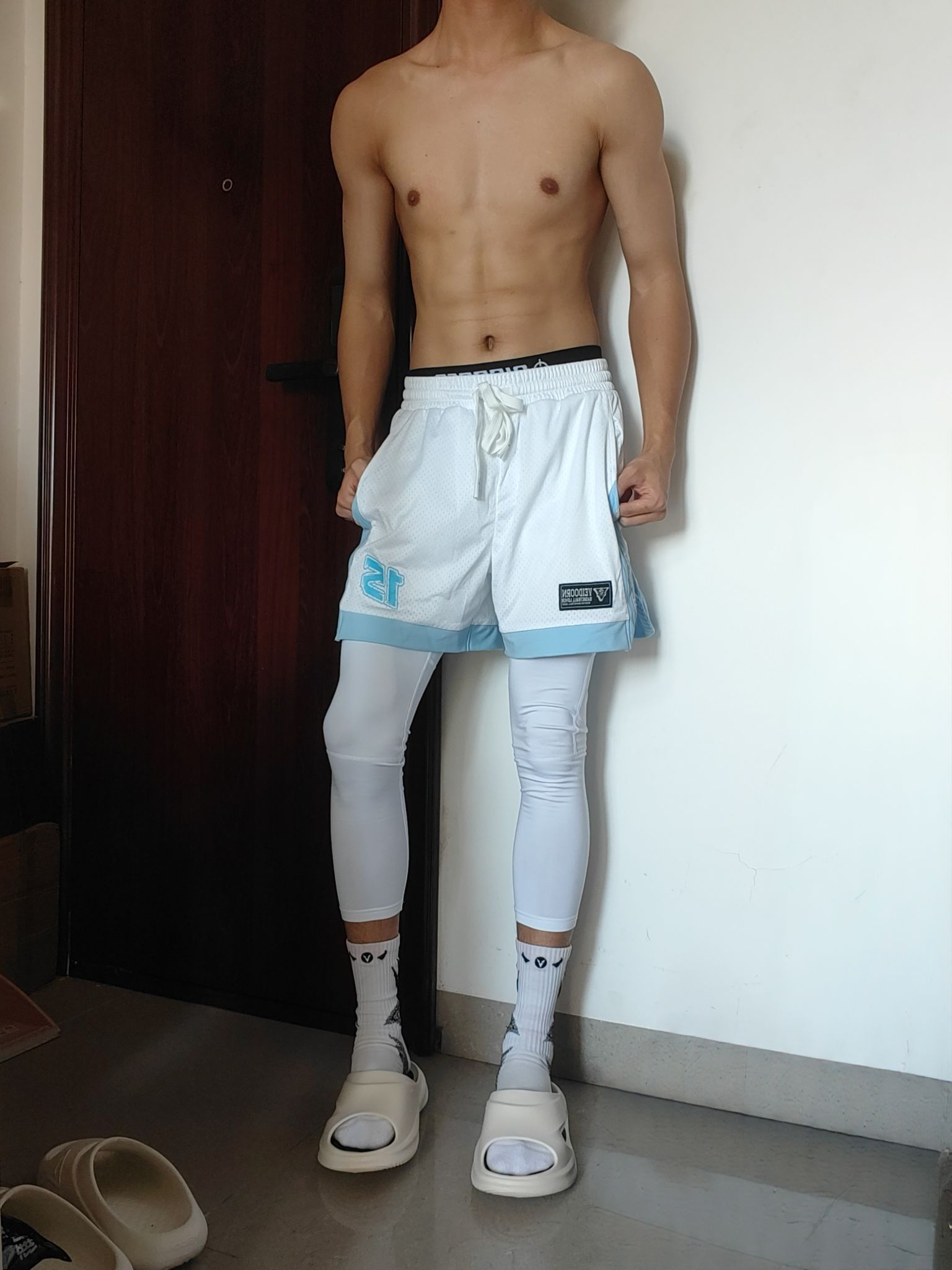 今天穿的是维动的美式篮球裤,网眼设计很透气,穿着打球出汗了一会就能干,而且剪裁版型也很立体,特别有美式的感觉,拿上篮球妥妥的美高