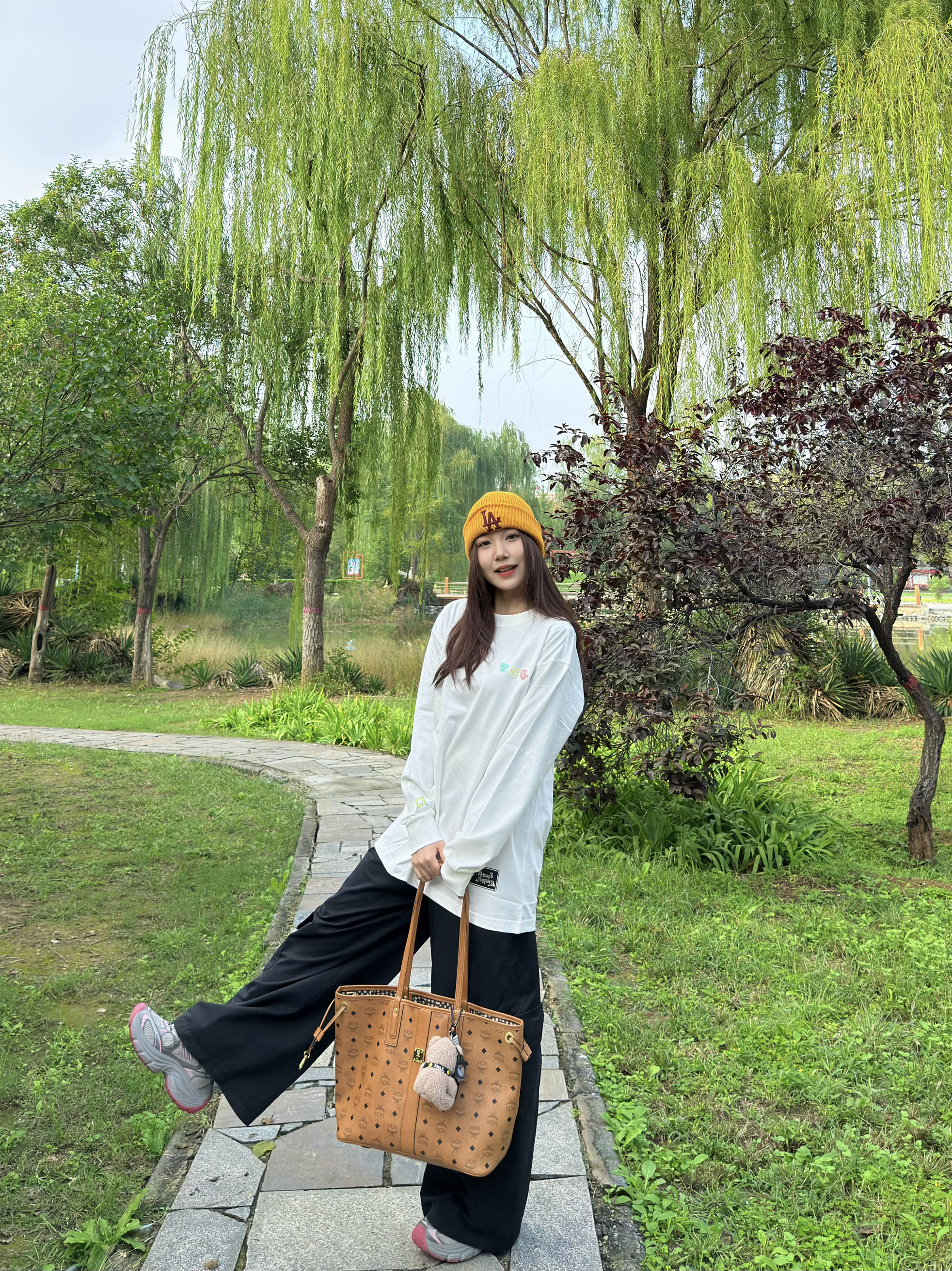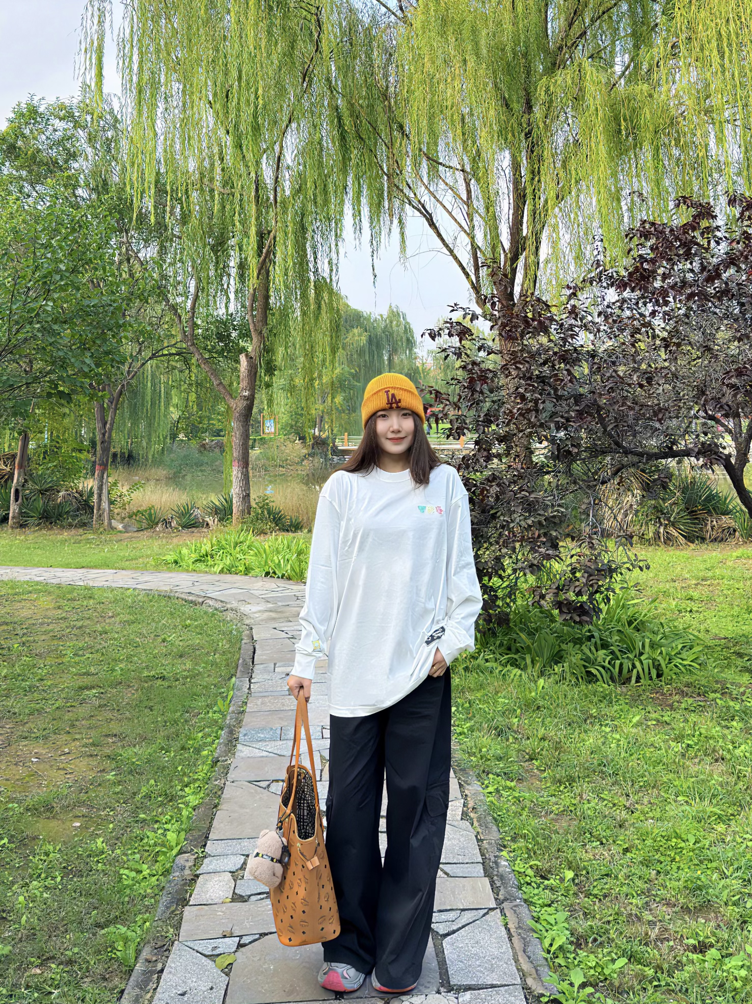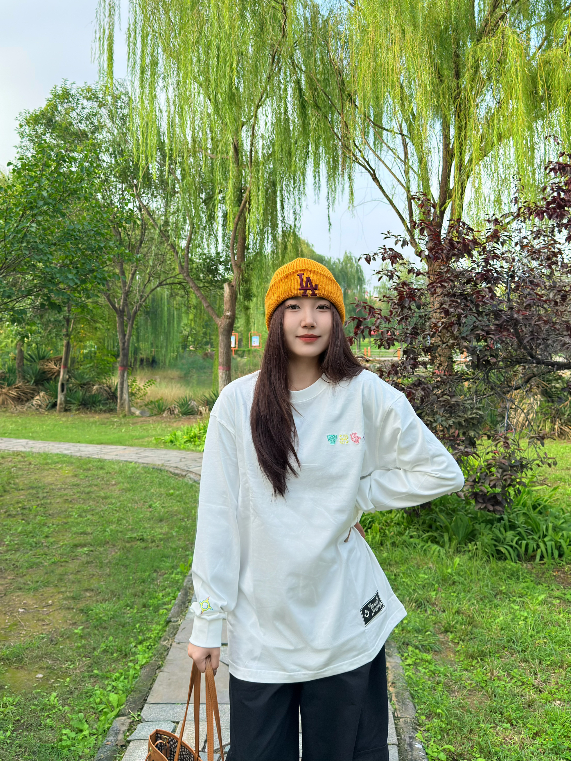 出门真的太爱这种简约休闲搭了!oversize白T宽松又藏肉,搭配黑色阔腿裤利落又显瘦,再戴个姜黄色针织帽提亮整体,拎上棕色托特包,随性又有韩系那味儿~整套穿起来舒服到不想换,日常遛弯、逛街都超合适。