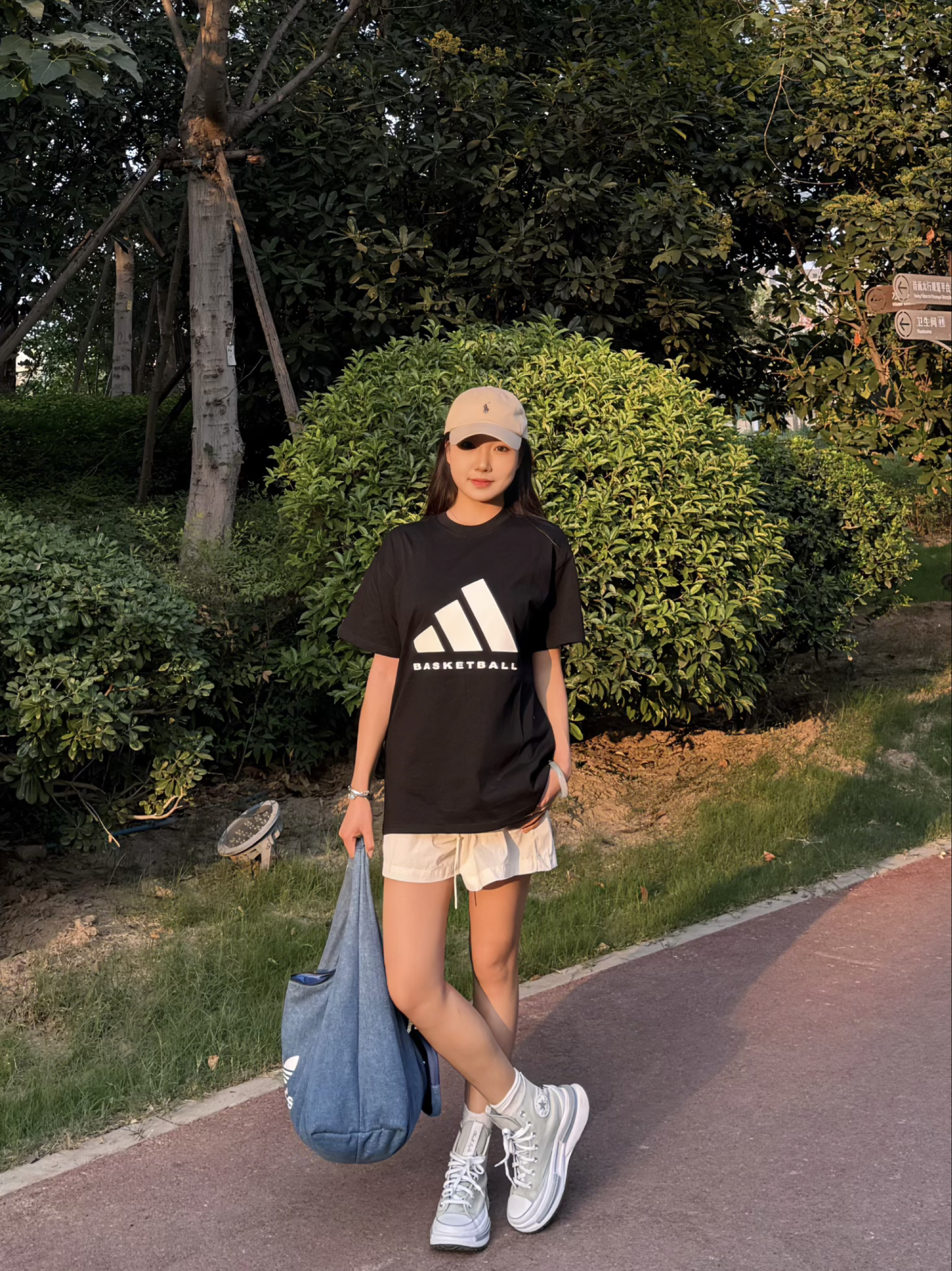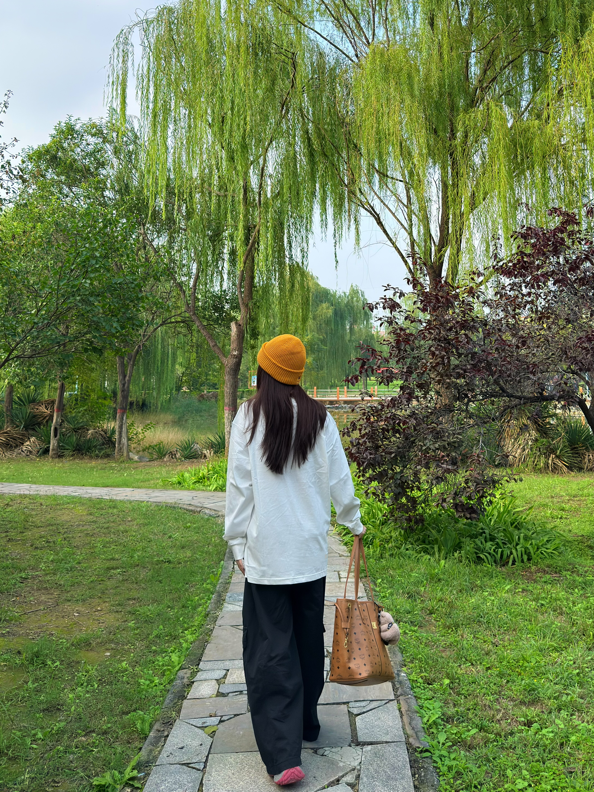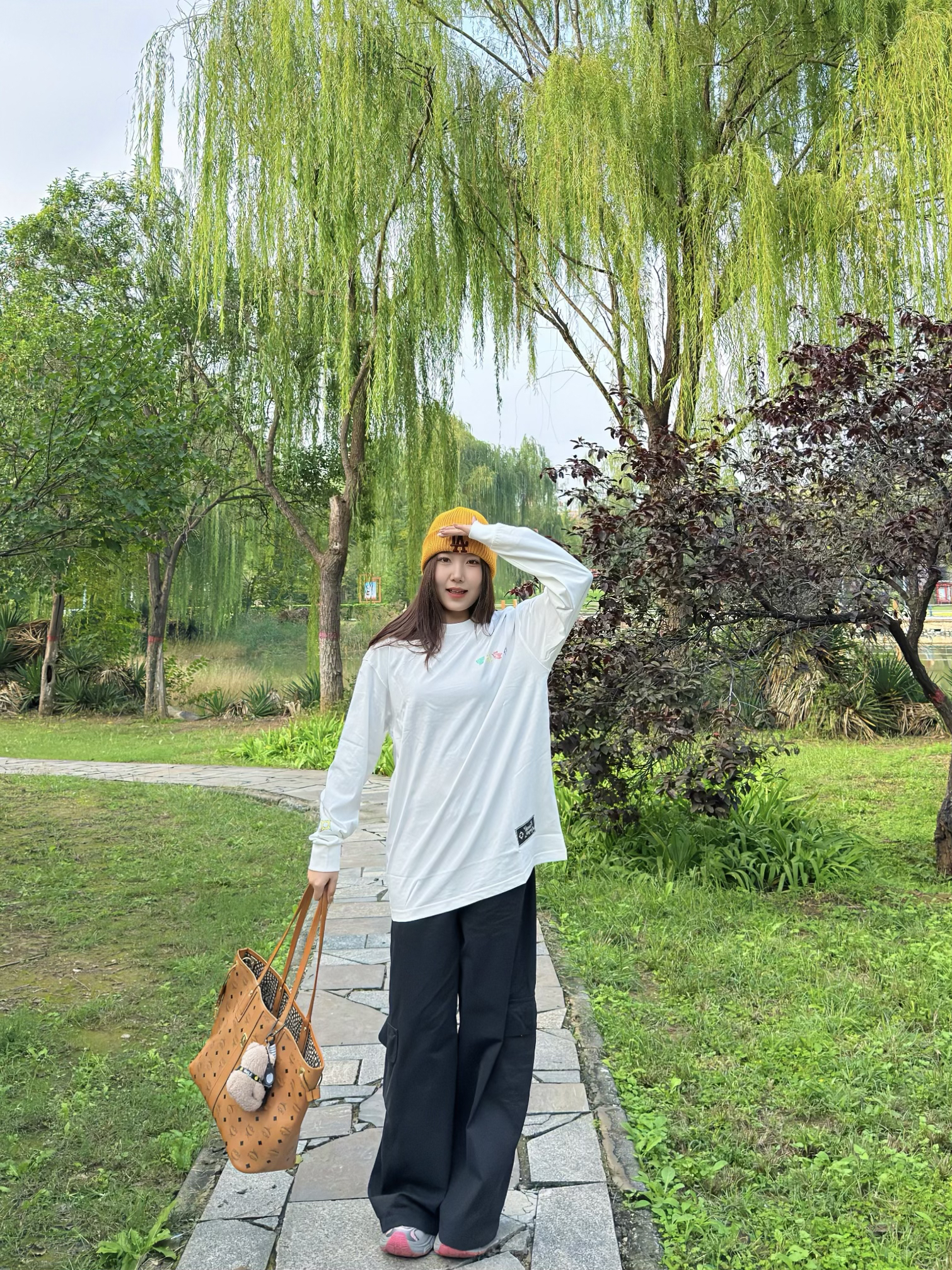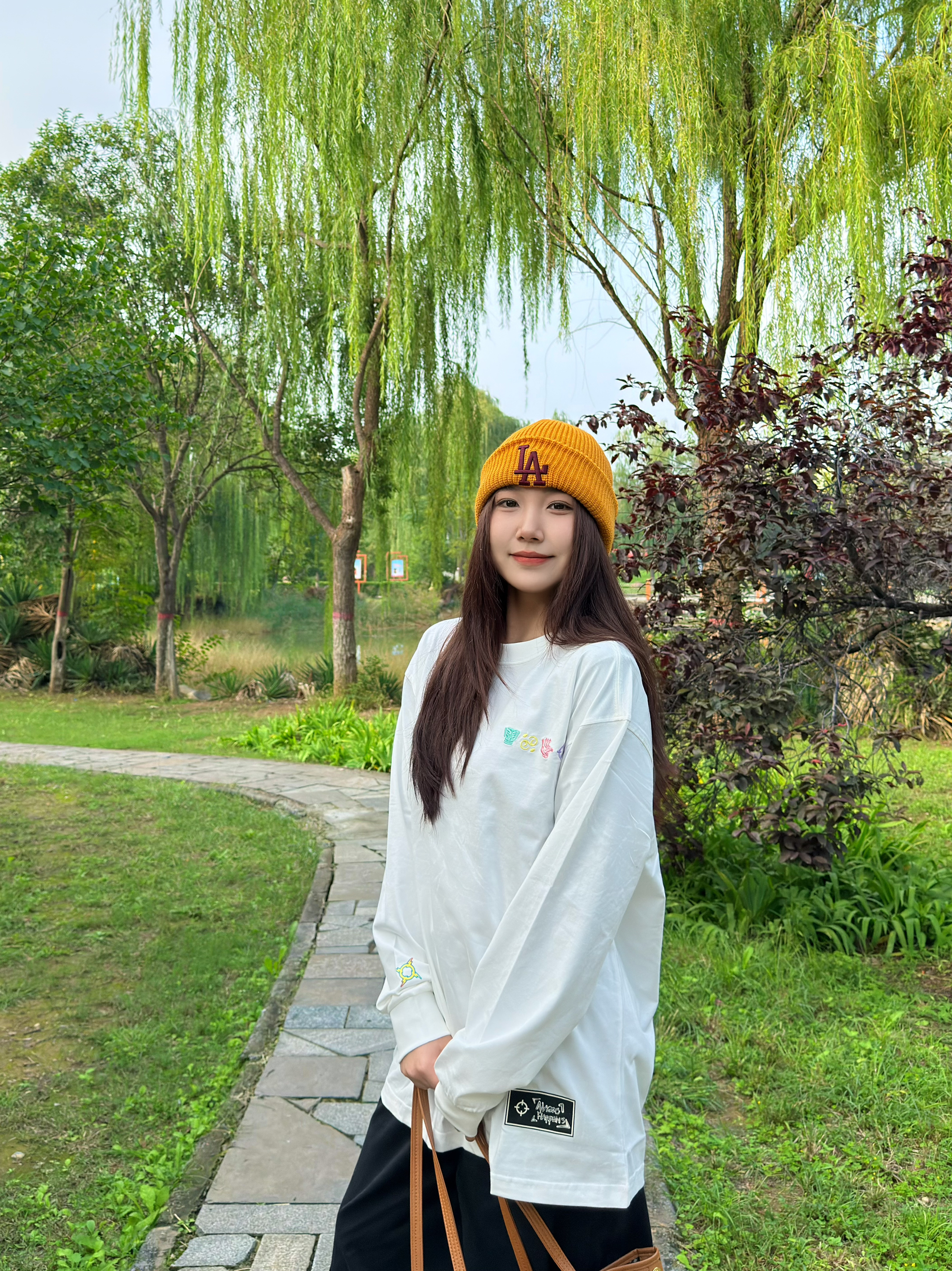 出门真的太爱这种简约休闲搭了!oversize白T宽松又藏肉,搭配黑色阔腿裤利落又显瘦,再戴个姜黄色针织帽提亮整体,拎上棕色托特包,随性又有韩系那味儿~整套穿起来舒服到不想换,日常遛弯、逛街都超合适。