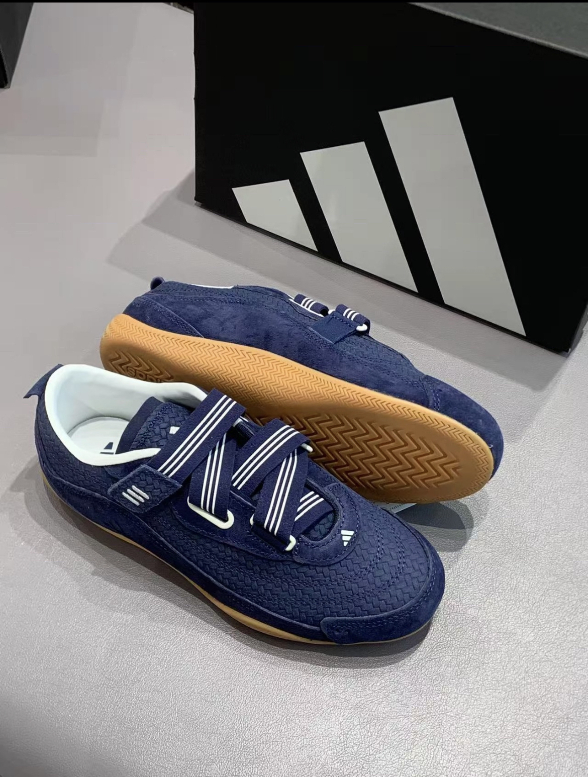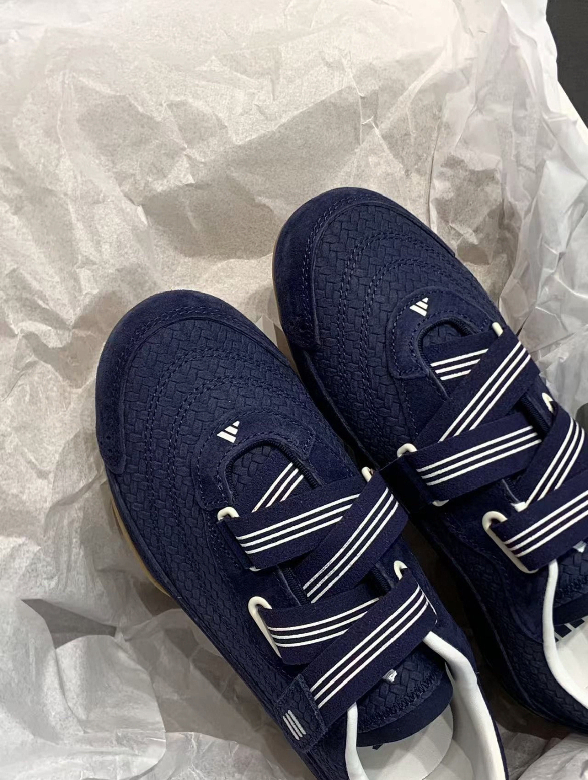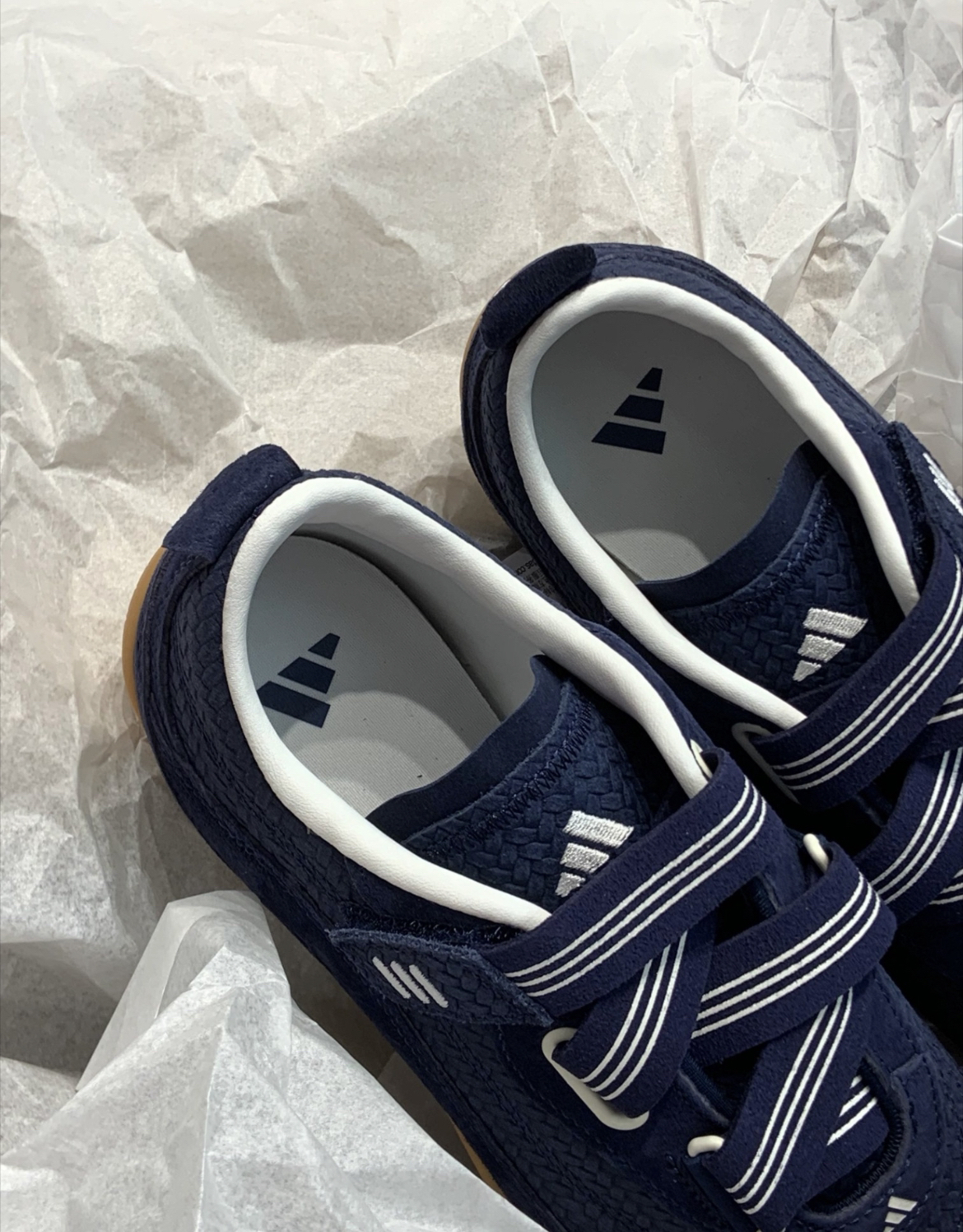 藏青蓝+奶黄底的配色复古感满满🤍 上脚既不会像烂大街款撞鞋 又能和日常的黑/白/灰穿搭完美适配 上脚后鞋底柔软度适中,走路时奶黄底和藏青蓝鞋面在阳光下超显白