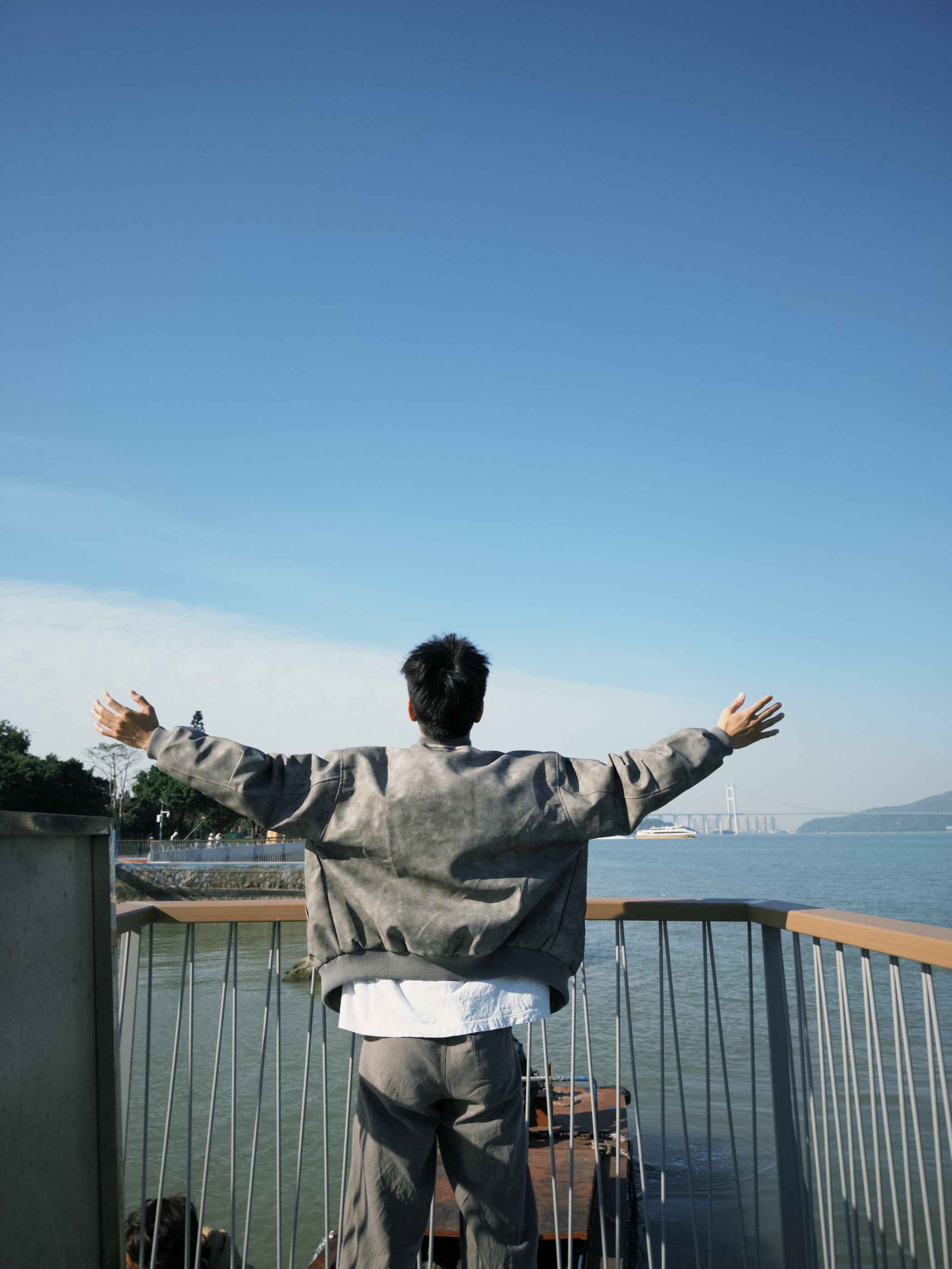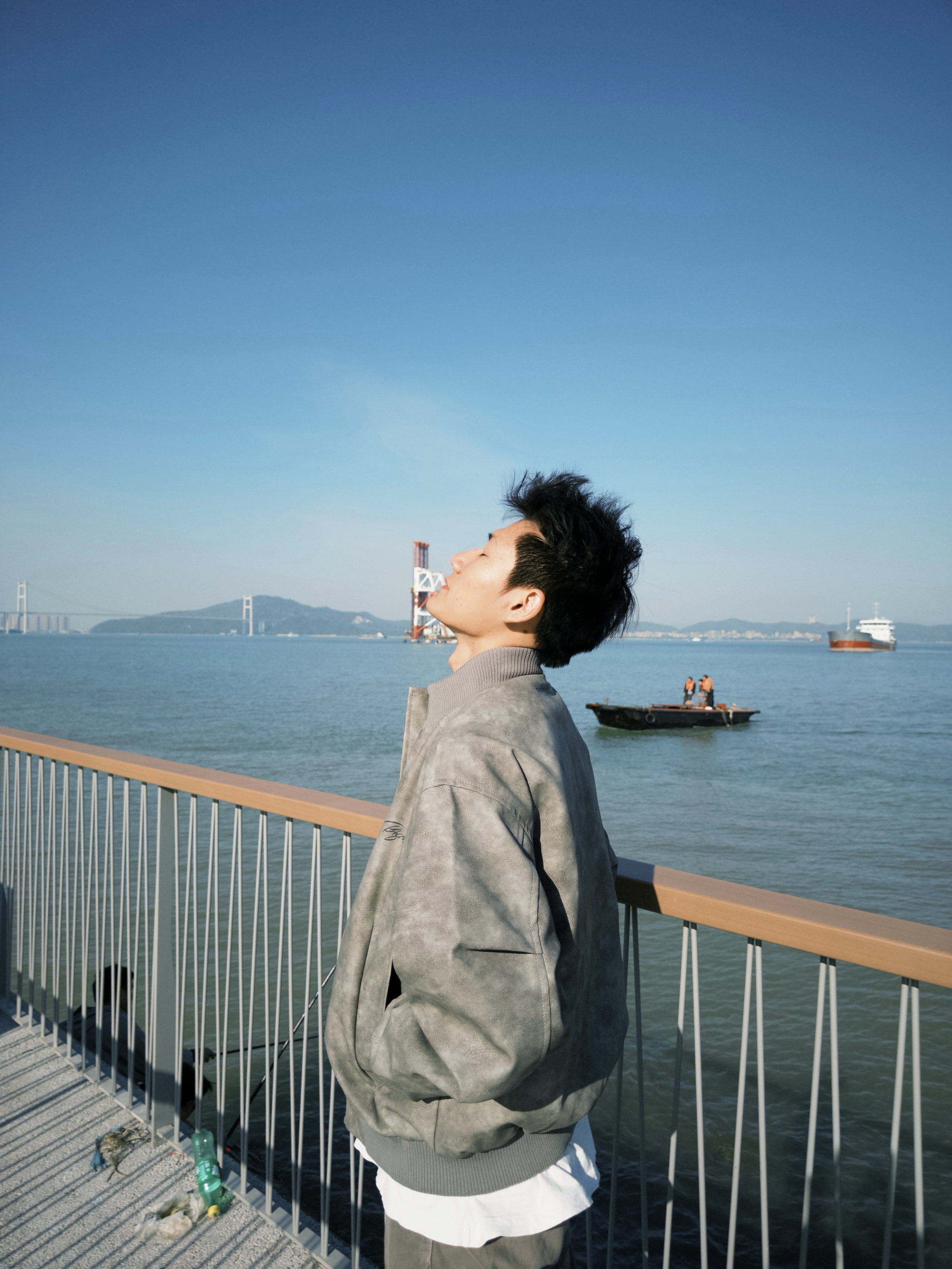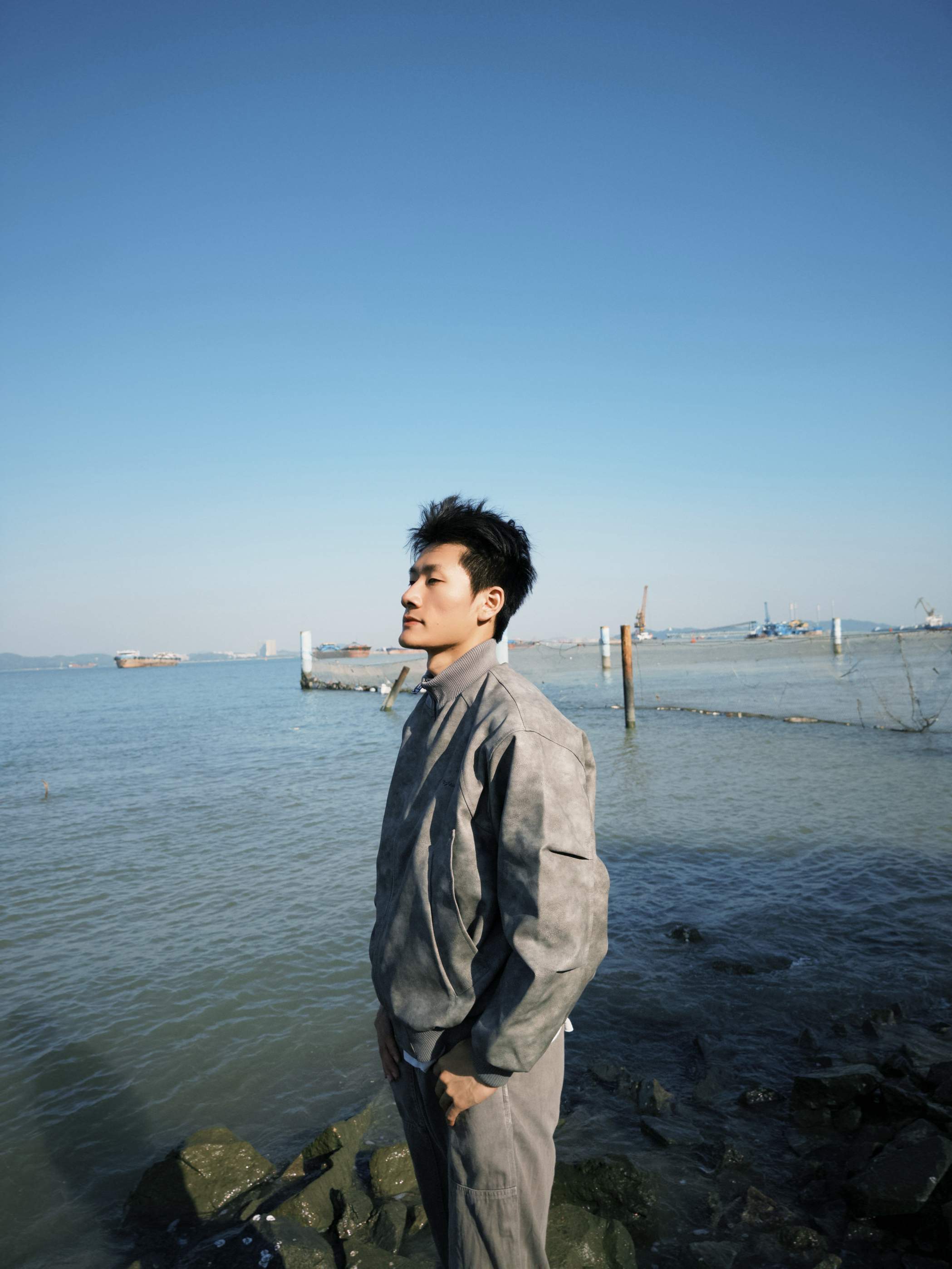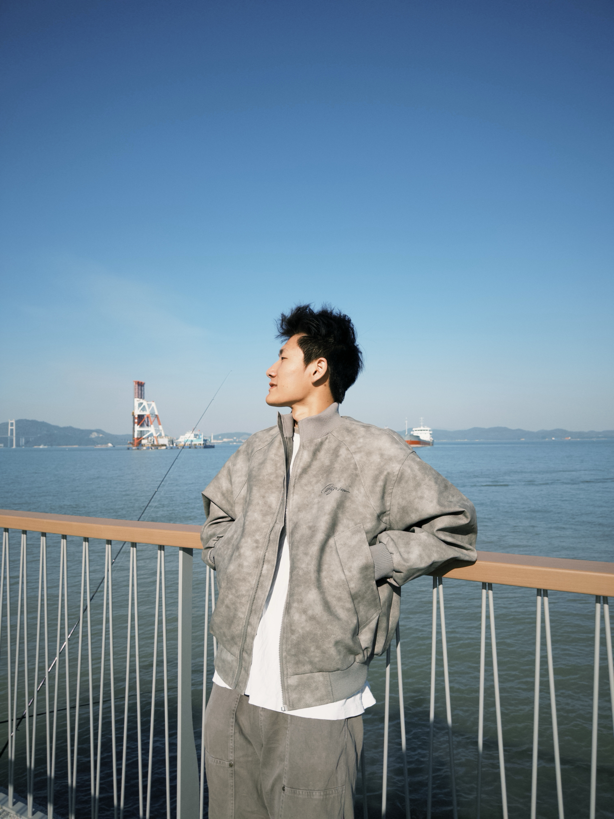 “这灰调做旧夹克是我近期的‘风格利器’——做旧纹理摸着有质感,海边吹风时裹着刚好挡风,宽松版型靠栏杆站半天也不局促。配白T和灰裤往海滨一立,复古感直接拉满,走动时也没束缚感,属于‘穿了就自带腔调’的款。”