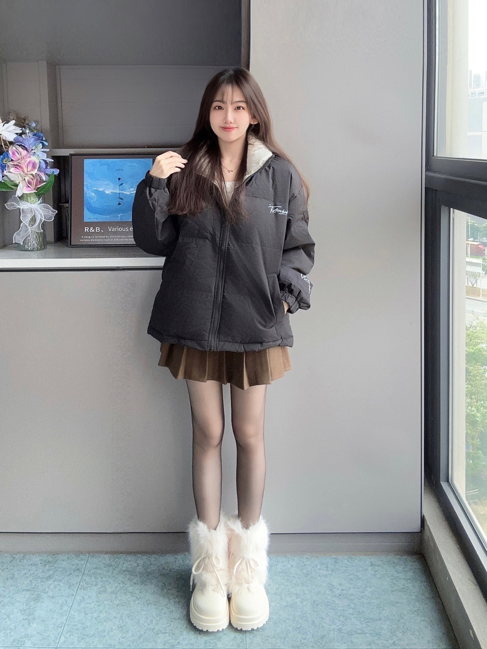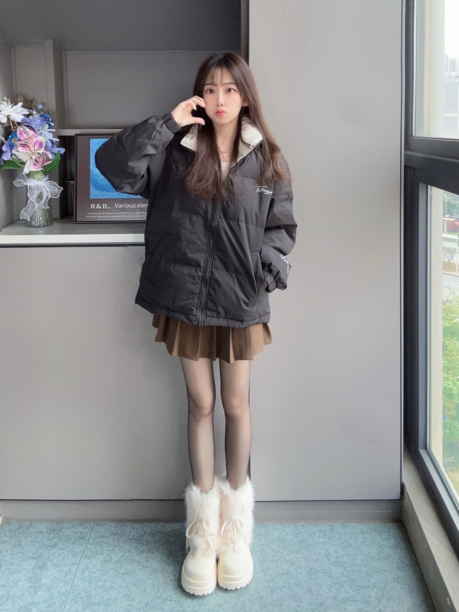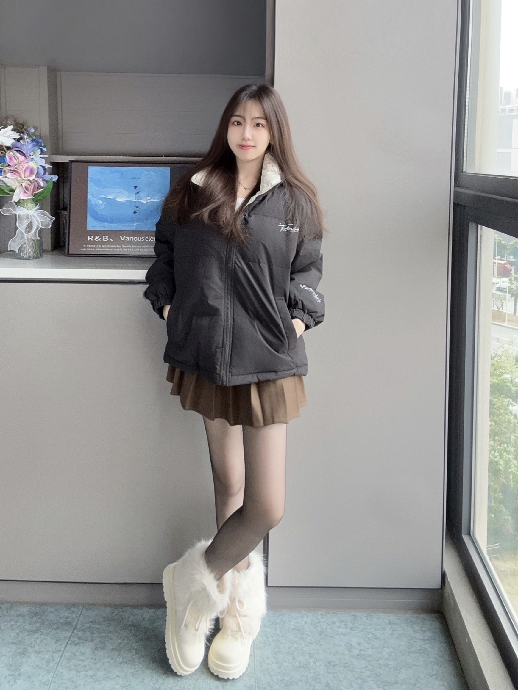 冬天就要穿的暖呼呼又好看呀 马克华菲 黑色羽绒服搭棕色百褶裙 配上光腿神器和毛茸茸的靴子 这一套真的很时髦又保暖❄️