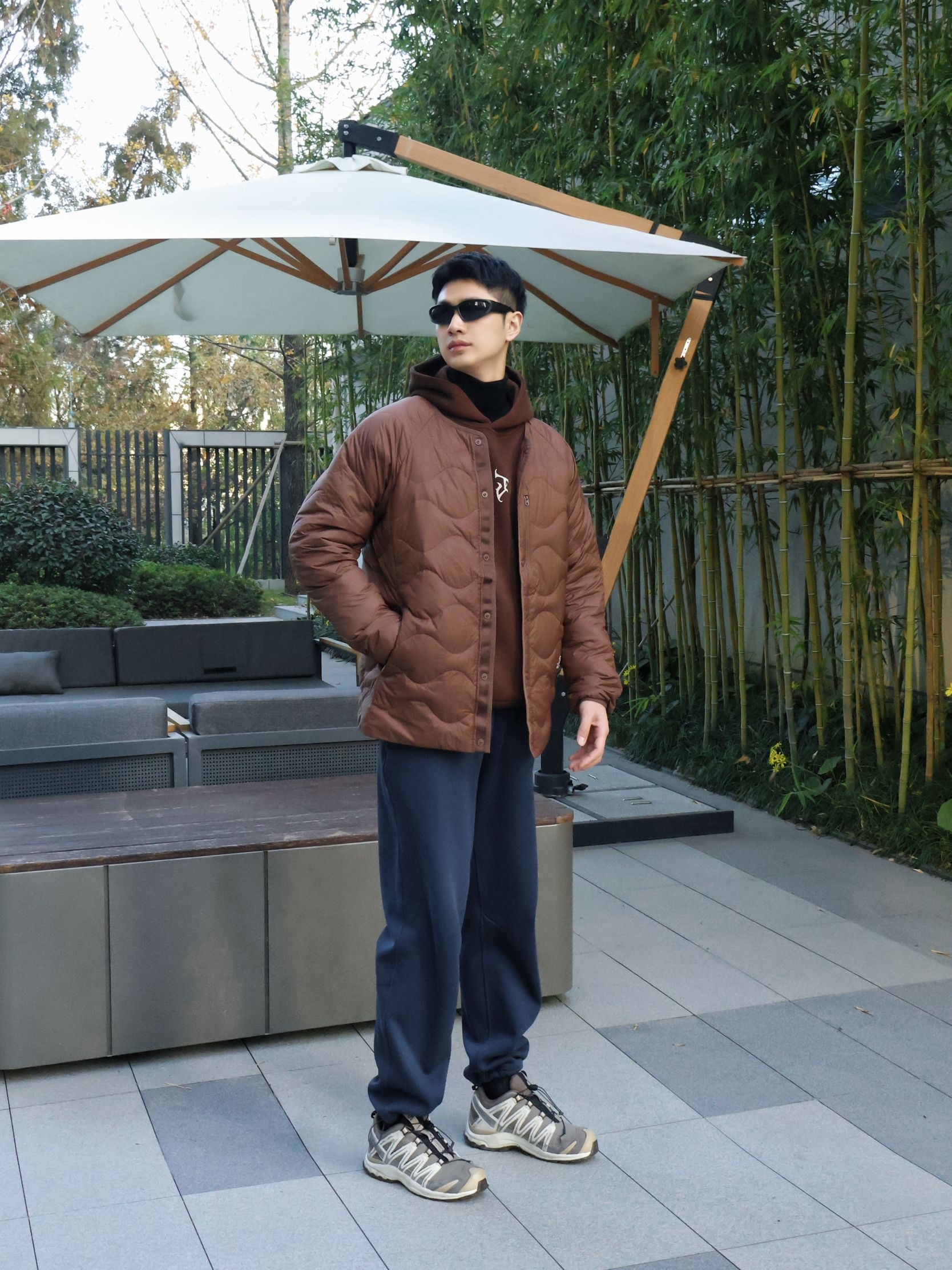 就是很合身那种,没有os风格。厚度非常适合广东,这个颜色太好看了。内胆外壳分开穿也很不错。