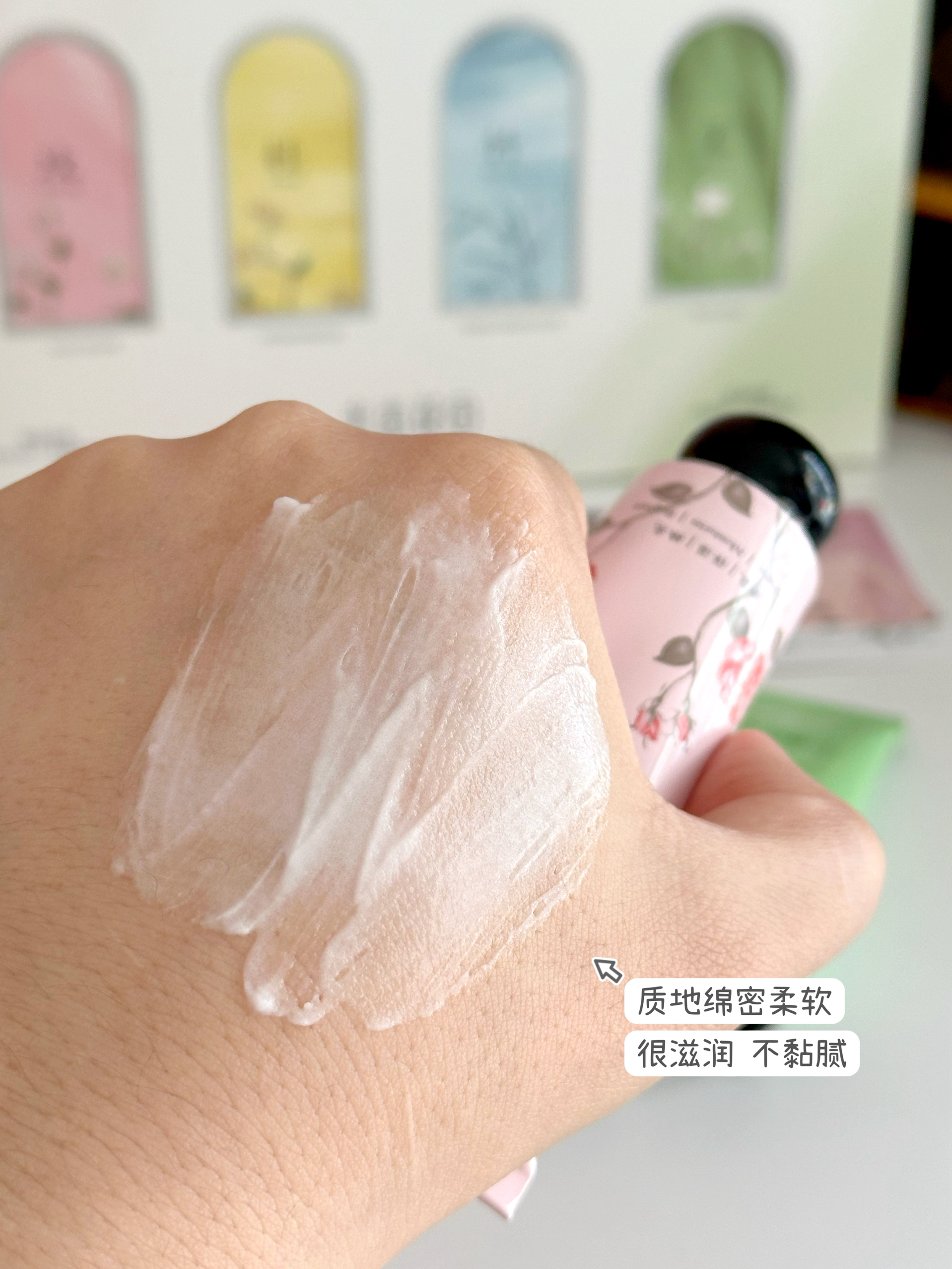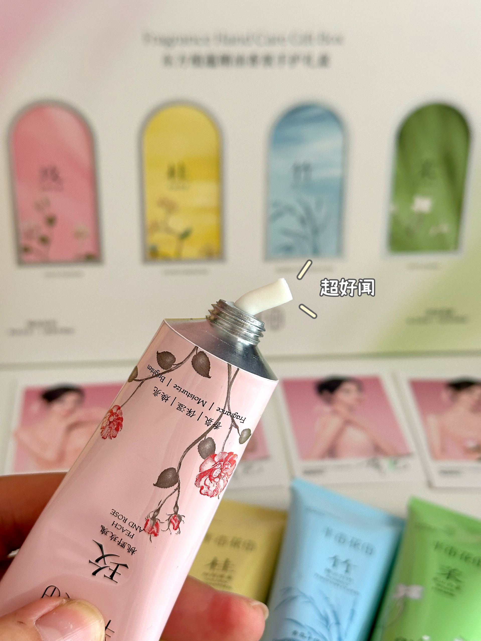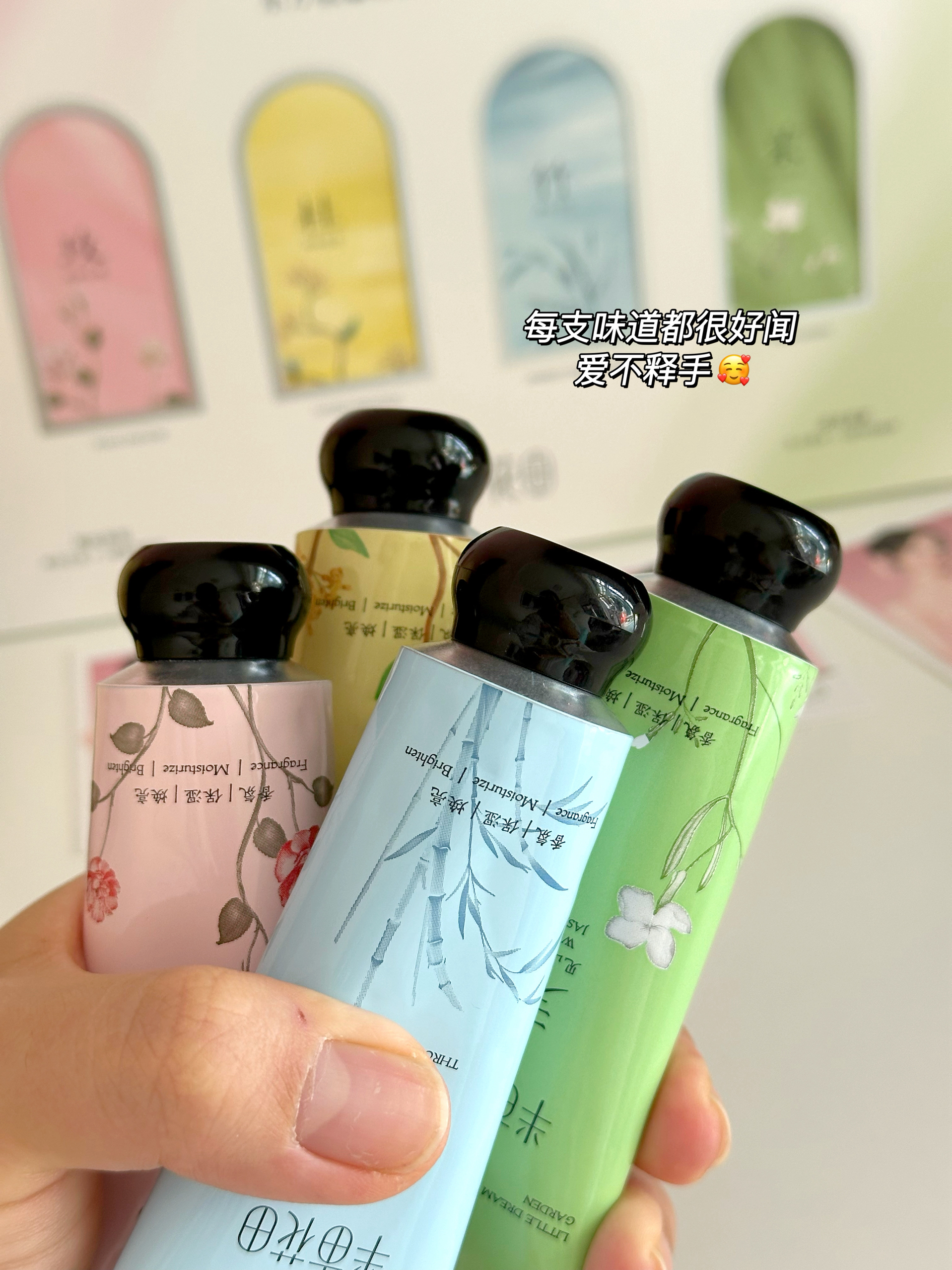 永远可以相信迪丽热巴的眼光!!! 说实话一开始真是冲着热巴买的这支护手霜,没想到用着用着居然被圈粉了! 质地是我最喜欢的部分! 像绵绵的慕斯,特别滋润 一推就化开吸收了,完全不黏腻。 一盒有4种香味🌸 我最爱的是甜桂摇金 满满的富桂味,有金桔甜橙的活泼果香,还有暖暖的金桂花香,~每次涂完都感觉把秋天揣进了兜里 💗见山白茉 有淡淡的白茶香,还有茉莉和铃兰的清新 💗桃野玫瑰太适合约会啦! 像是带着露珠...