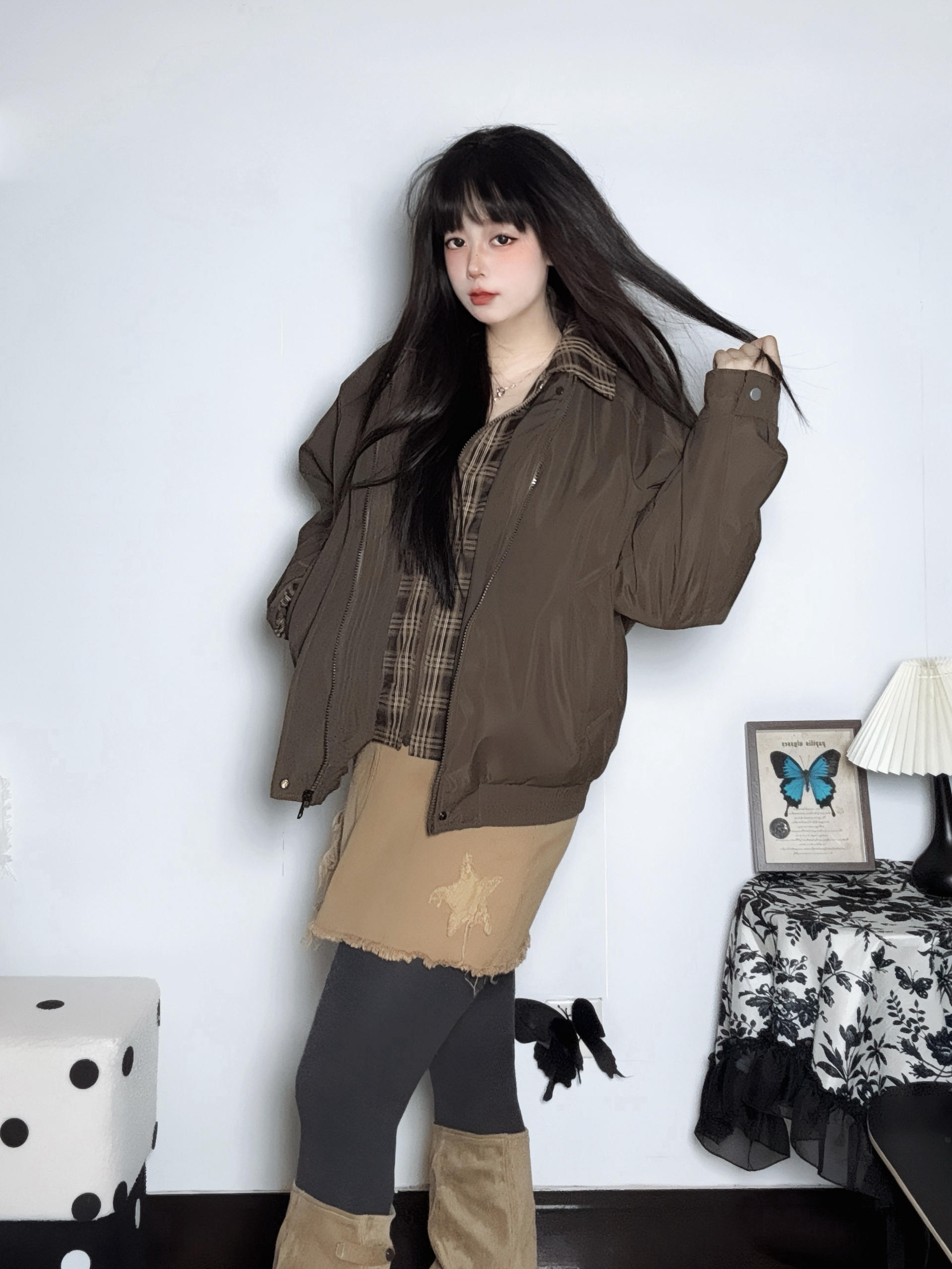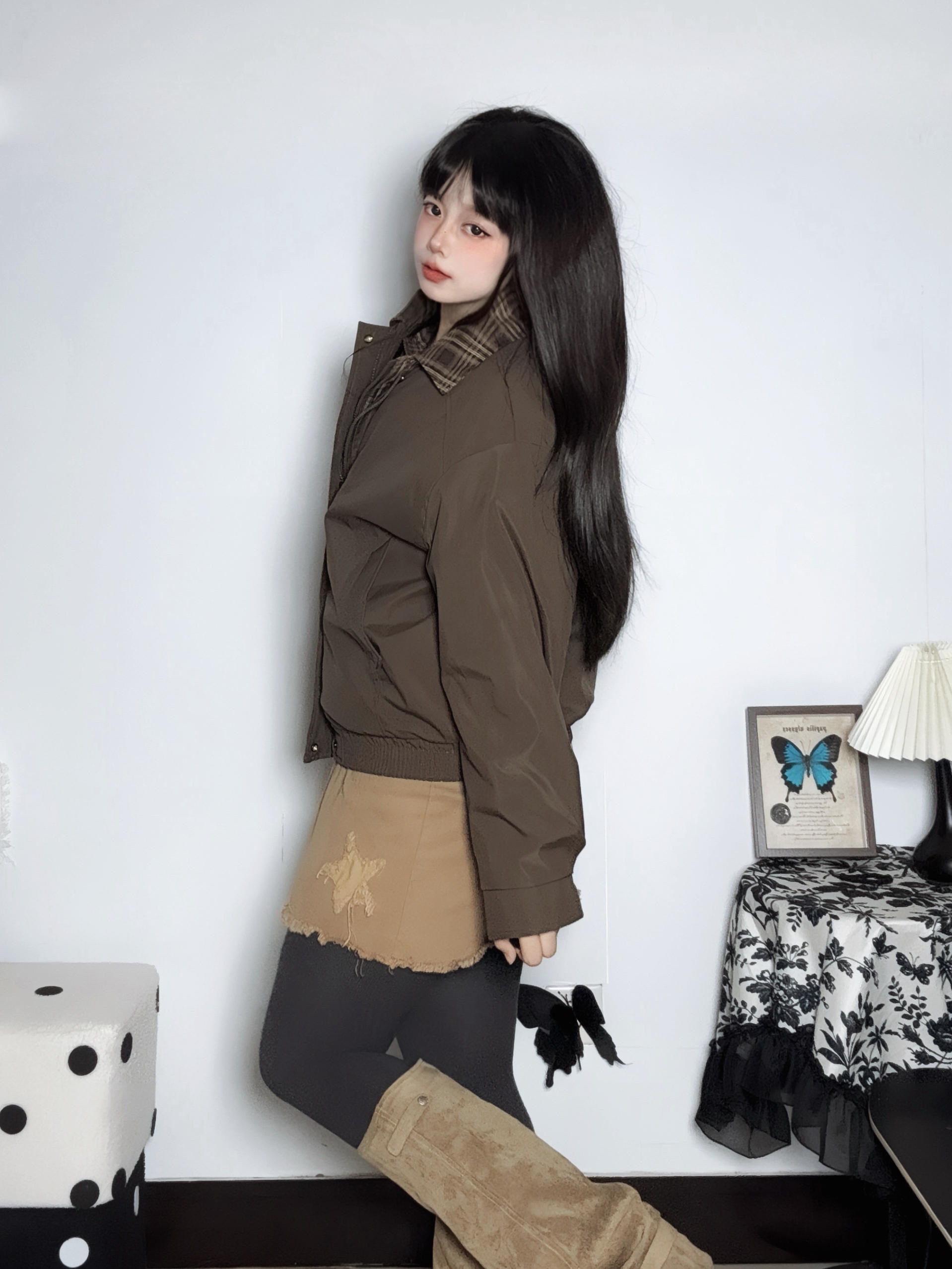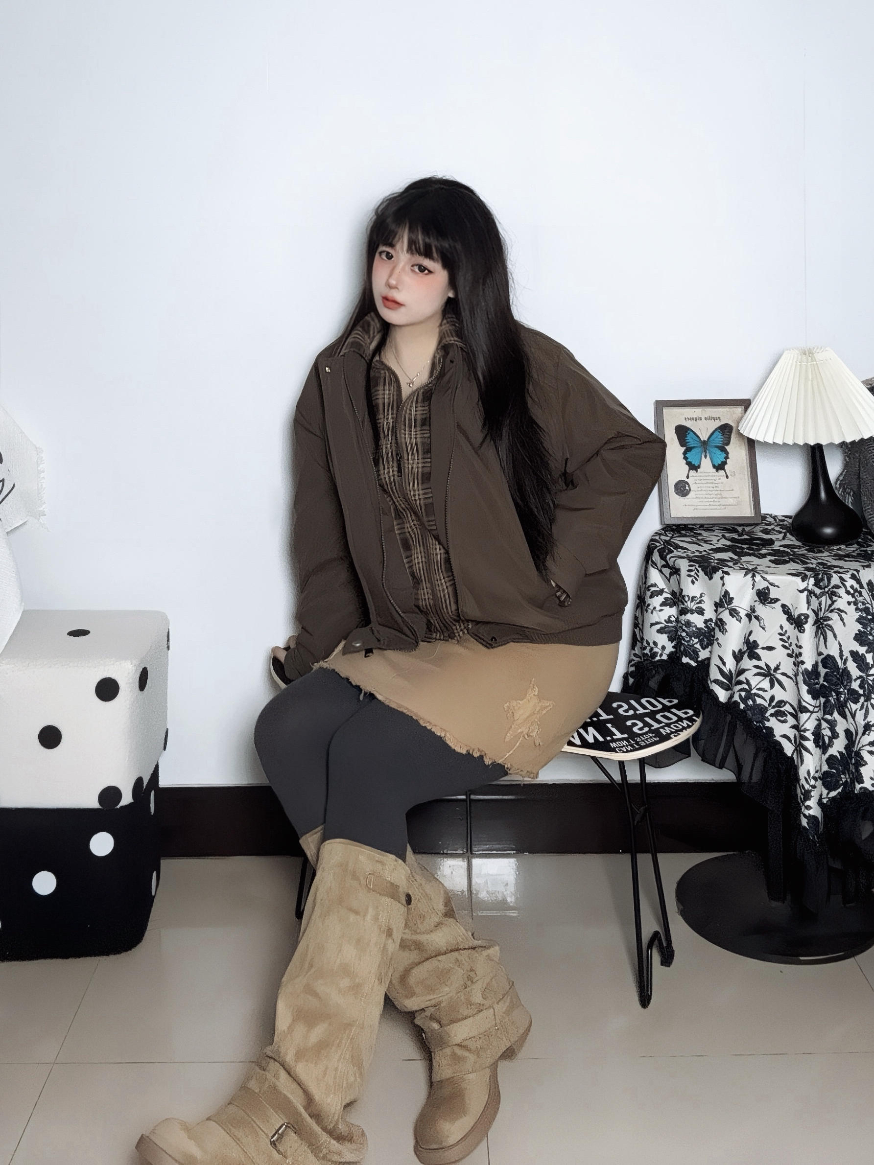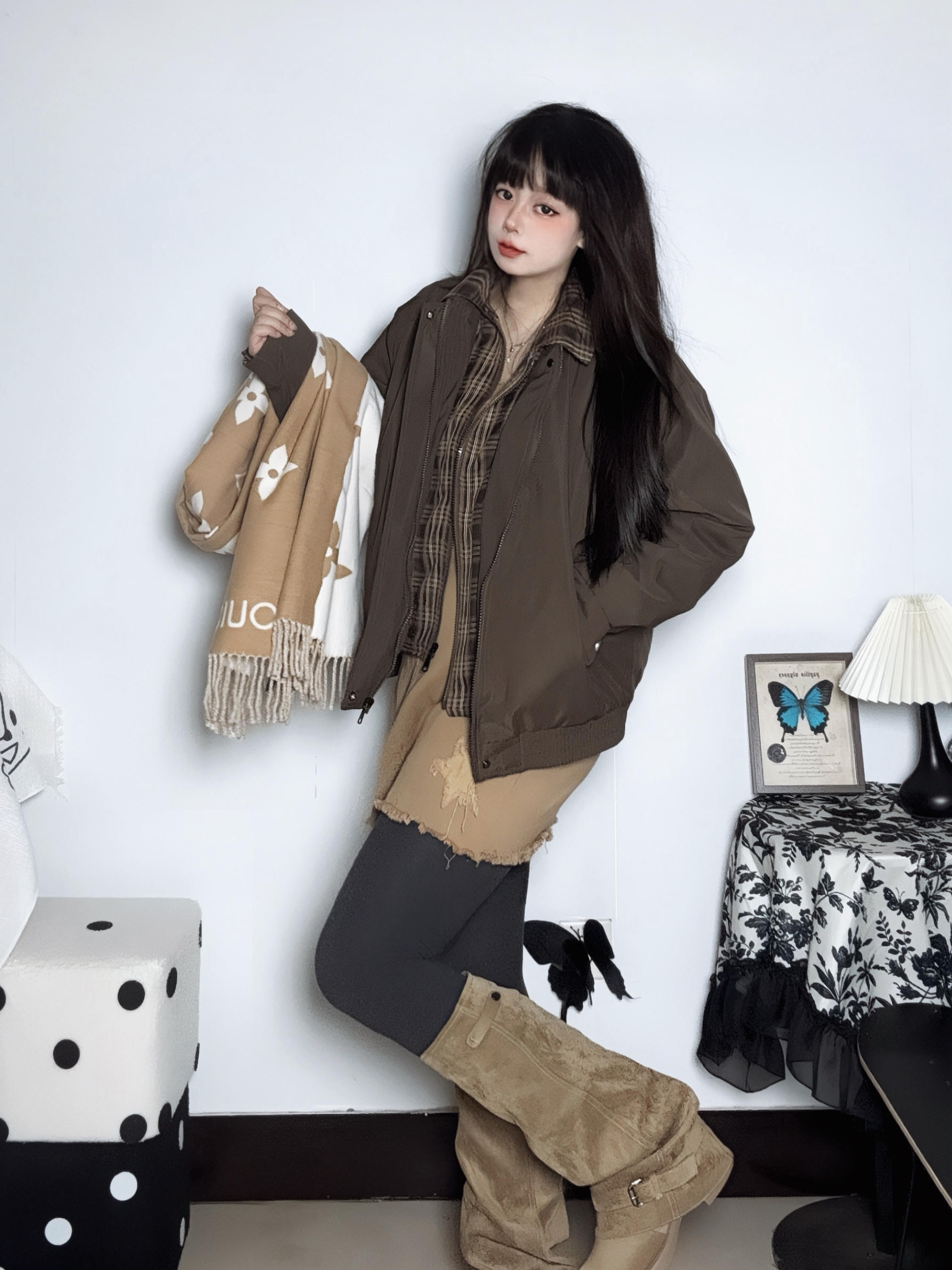 外套是那种假两件的设计滴 像叠穿了格纹衬衫 外面是棕调的宽松夹克 版型软软糯糯的 随手搭了条带花纹的围巾 细节里带点慵懒感~ - 内搭我挑了浅卡其裙装加深灰打底裤 保暖又不会显臃肿 在来双卡其色的厚底长靴 跟整体色系呼应 踩起来软软的超舒服~ ▪️ 参考尺码:168cm60kg M