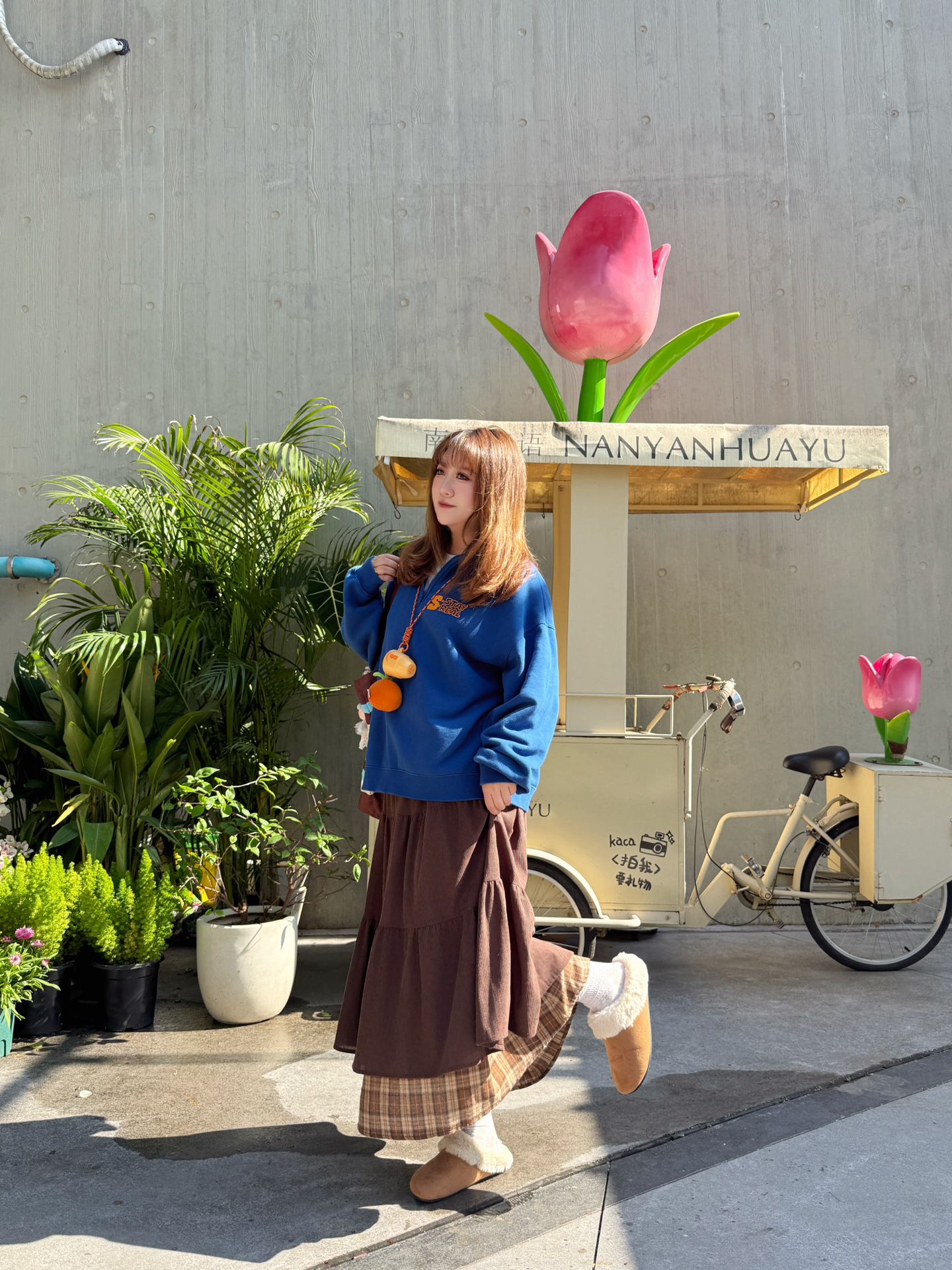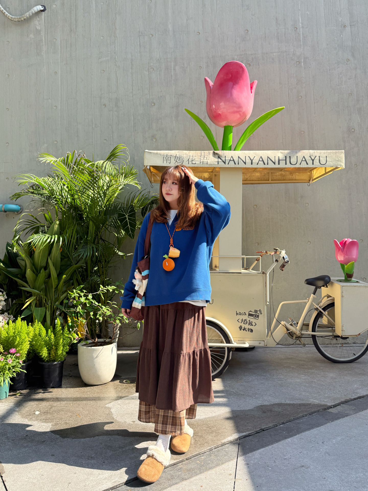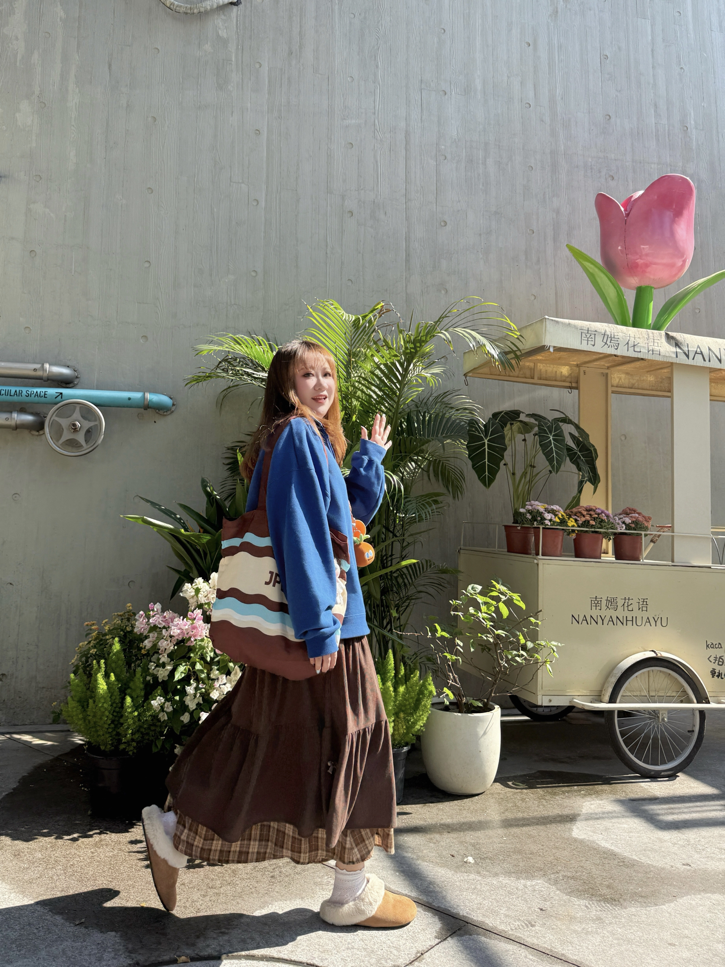 克莱因蓝×暖咖棕=治愈系视觉热可可♡ ▫️ 穿搭拆解 🌀 立领卫衣:宽松版型藏住秋膘✔️ 后背印花撞色橘字母~走路带风时超吸睛👀 🍫 褶皱长裙:卡其棕格纹拼接灯芯绒 转圈时裙摆开花🌼(心机显高:裙长过脚踝! 🐻 毛毛拖:软fufu云朵脚感~暴走2公里不打脚👣 米白毛绒×棕底防滑,户外踩落叶嘎吱响🍁 ▫️ 场景加成 水泥墙前巨型郁金香装置🌷 ——冷调背景反而凸显穿搭暖色系✨ 推车绿植做前景...