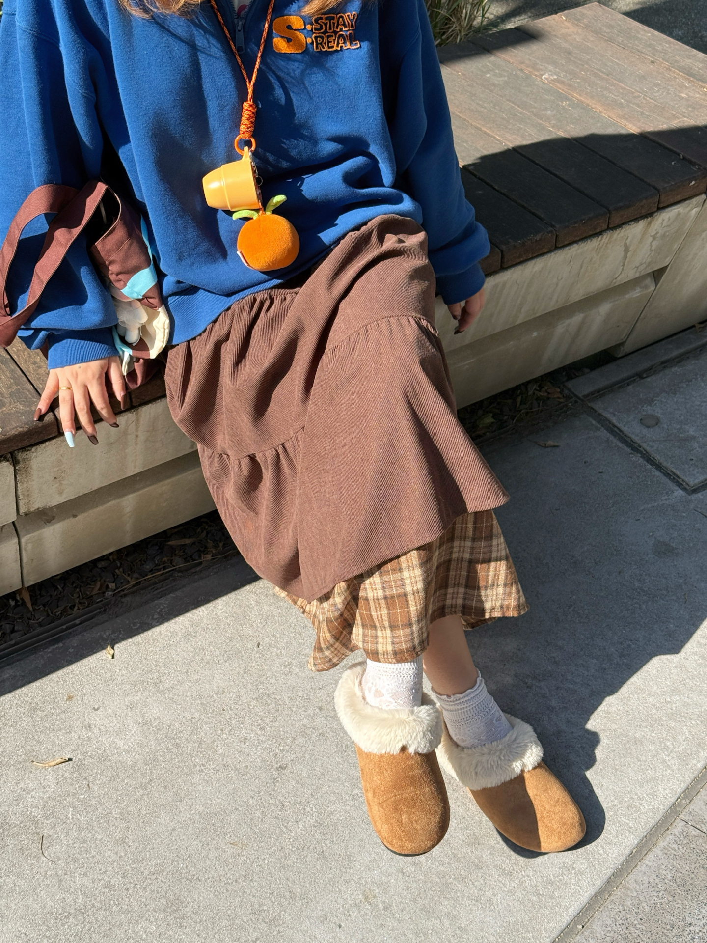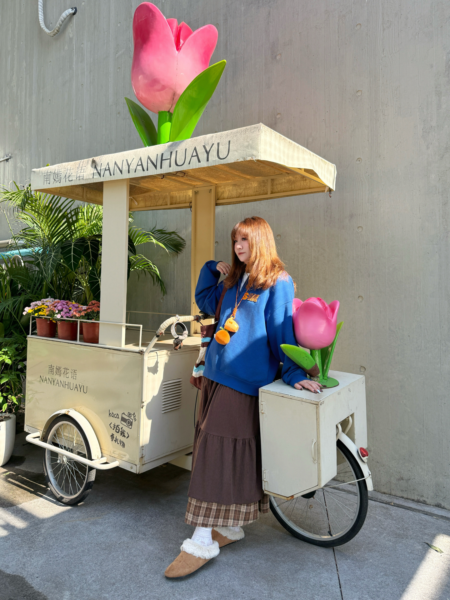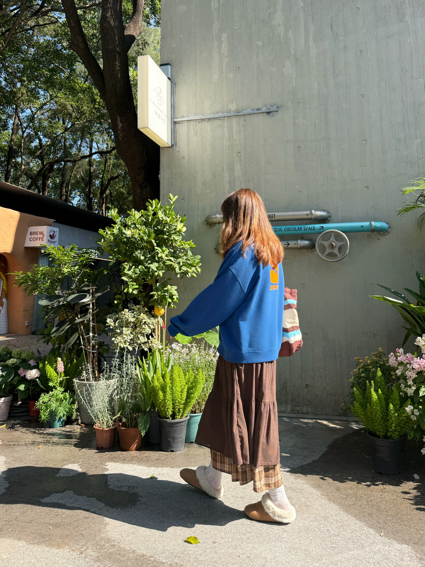 克莱因蓝×暖咖棕=治愈系视觉热可可♡ ▫️ 穿搭拆解 🌀 立领卫衣:宽松版型藏住秋膘✔️ 后背印花撞色橘字母~走路带风时超吸睛👀 🍫 褶皱长裙:卡其棕格纹拼接灯芯绒 转圈时裙摆开花🌼(心机显高:裙长过脚踝! 🐻 毛毛拖:软fufu云朵脚感~暴走2公里不打脚👣 米白毛绒×棕底防滑,户外踩落叶嘎吱响🍁 ▫️ 场景加成 水泥墙前巨型郁金香装置🌷 ——冷调背景反而凸显穿搭暖色系✨ 推车绿植做前景...
