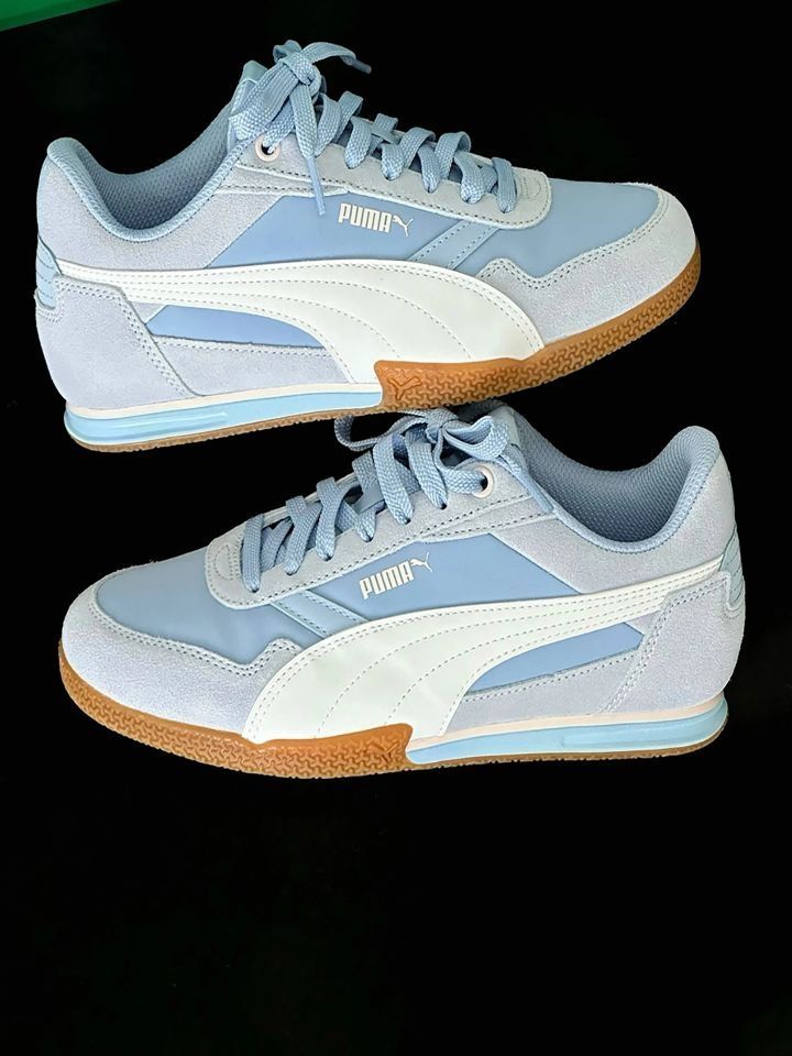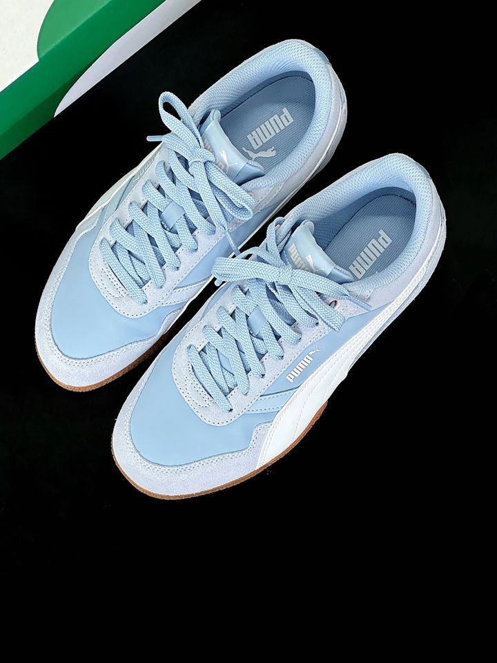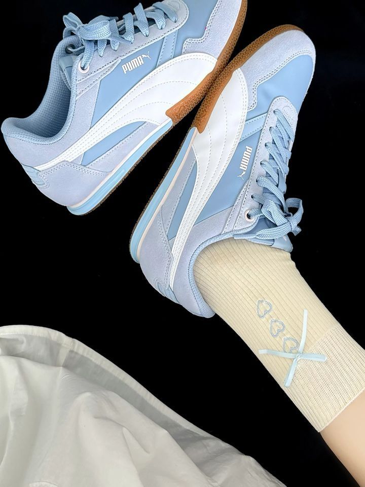 这双PUMA直接把“海盐汽水”穿脚上了! 浅蓝+奶白的低饱和撞色,嫩得像把夏天的清爽揣进鞋里✨ 麂皮+光滑面料拼接,软乎乎还透气,生胶底脚感轻到像踩云~ 搭带心型刺绣的袜子,甜妹氛围感直接拉满,暴走一天都不累,这波颜值舒适度双开挂,闭眼冲就完事儿!