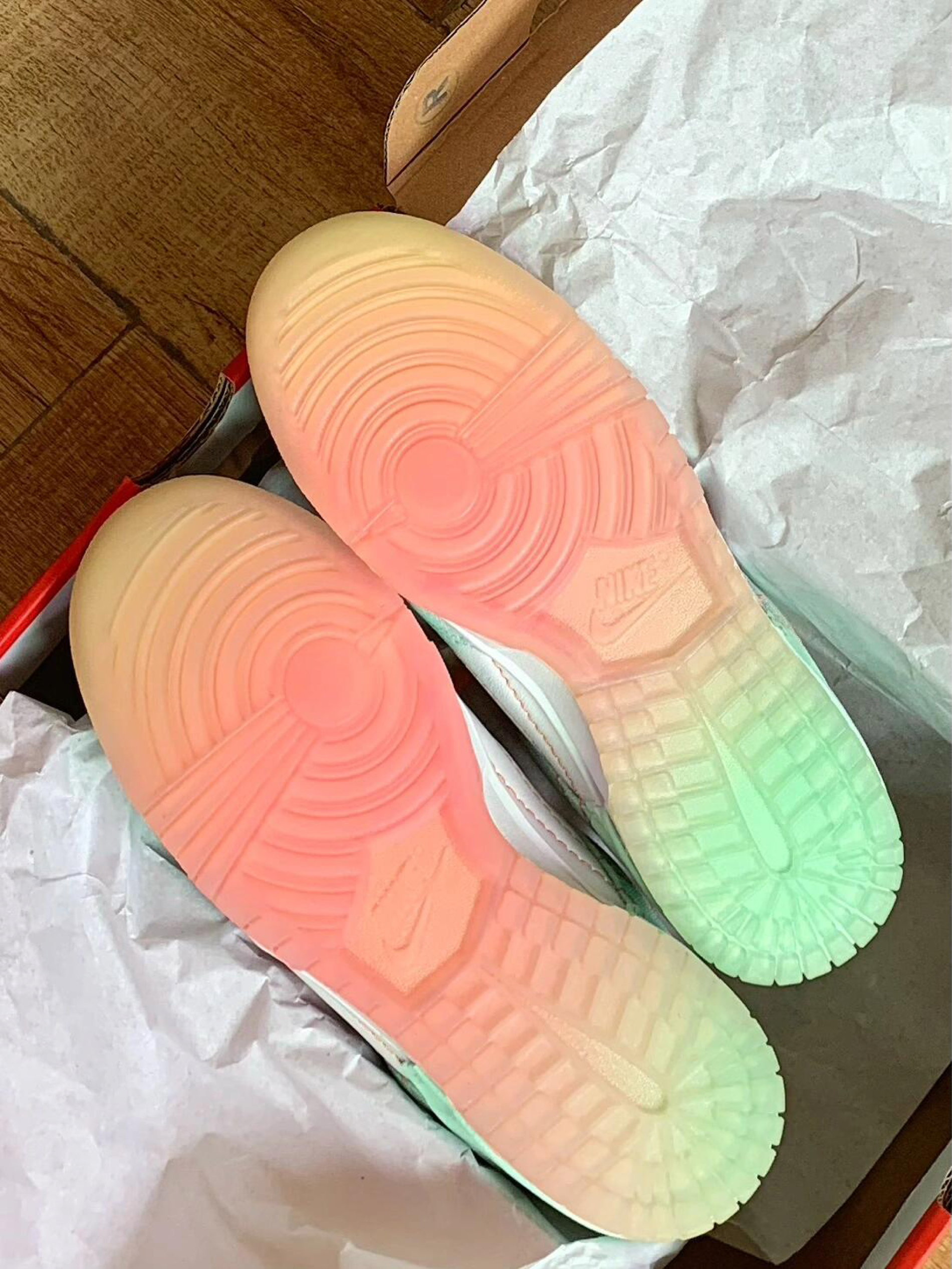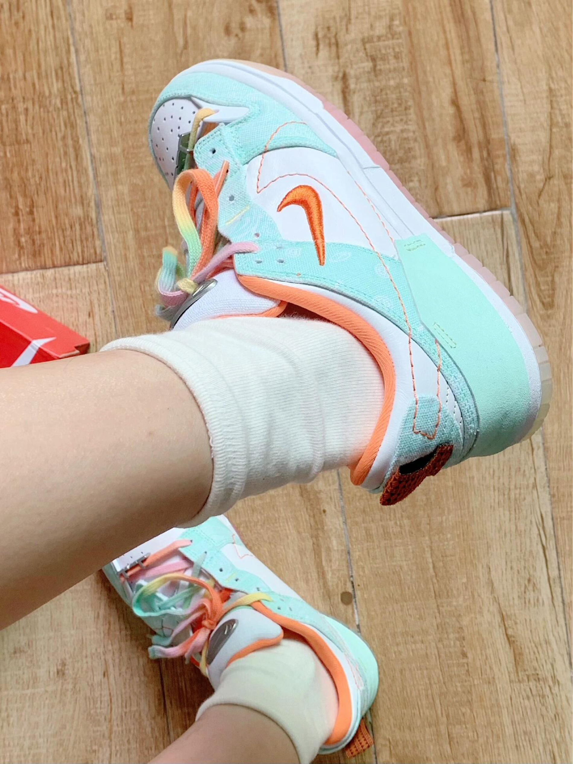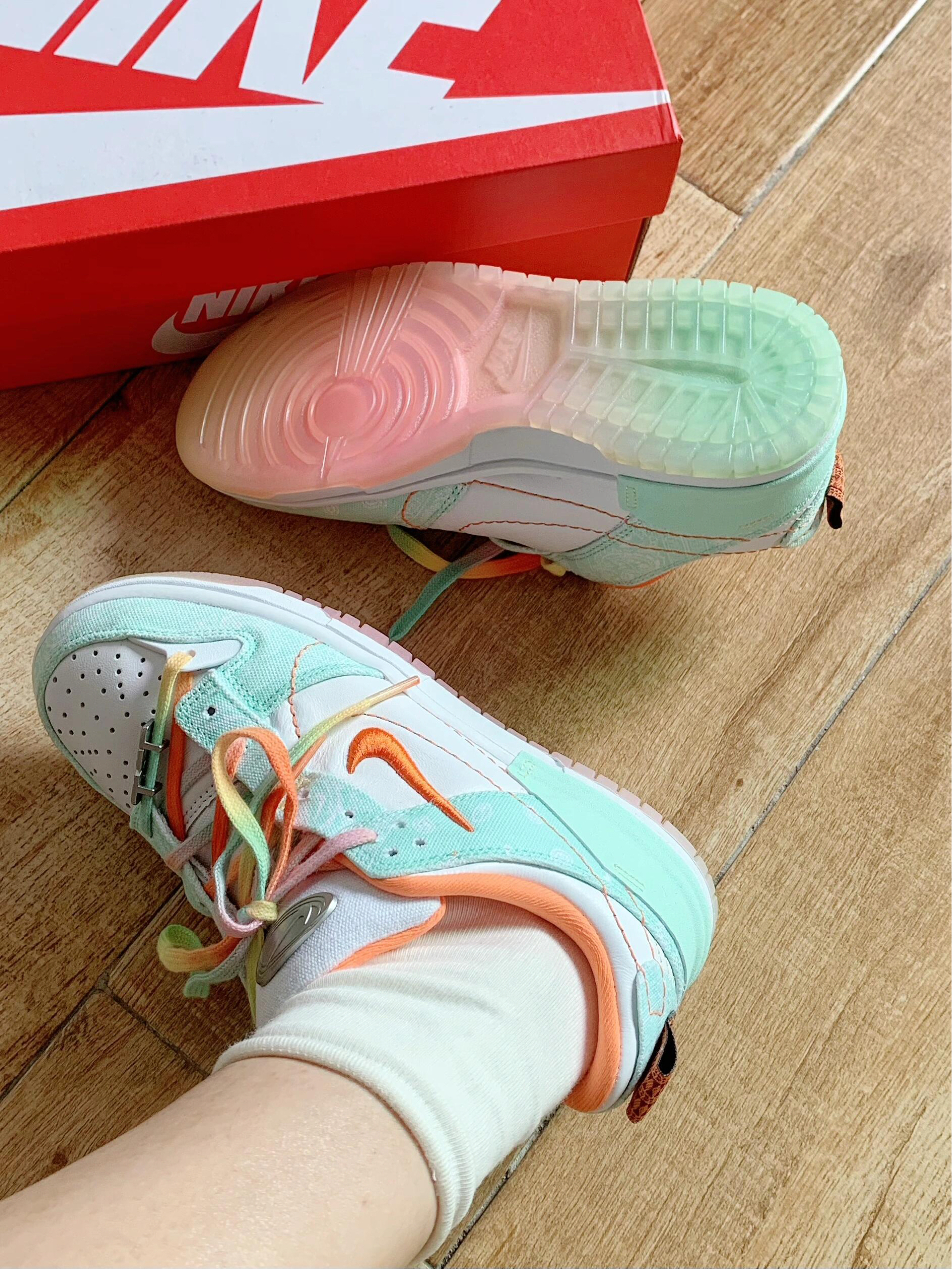 这双白绿小清新Dunk太特别了吧!白绿“哈密瓜 ”配色颜值真的好清新,扎染布的设计搭配街头感十足的腰果花 整体毫无违和感 还很搭配,鞋底也是一大亮点 渐变的水晶果冻鞋底,踩上去脚感也很不错,软软的,鞋带也是彩绳设计,真的很美丽🛒